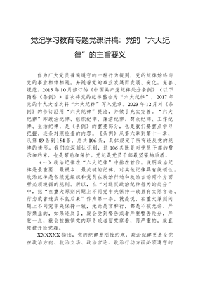 党纪学习教育专题党课讲稿:党的六大纪律的主旨要义作为广大党员普遍遵守的一种行为规则,党的纪律始终与党的事业相伴相随,并随着党的事业发展而发展、变化,完善、规范。2015年10月修订的《中国共产党纪律处分条例》(以下简称《条例》)首次将党的纪律整合为六大纪律,2017年党的十九大首次将六大纪律写入党章。2023年12月对《条例》的修订沿用六大纪律提法,并做了充实完善。六大纪律即政治纪律、组织纪律、廉洁纪律、群众纪律、工作纪律、生活纪律,是《条例》的重要部分,也是我们要重点学习把握、逐条对照检查的内容。《条例》从第六章到第十一章,从第49条到154条,总共106条,具体规定了所有违反党的纪律的情形。我们应深刻认识到,这106条既是对党员干部的警示和约束,也是帮助和保护。党纪是党员干部最坚强的后盾。(一)政治纪律在六大纪律中排在首位,说明政治纪律是最重要、最根本、最关键的纪律,对其他纪律具有统领性。政治纪律是各级党组织和党员在政治行动和政治言论两个方面所必须遵循的规则。所以,在对违反政治纪律行为的处分中,把在重大原则问题上不同党中央保持一致且有实际言论、行为或者造成不良后果作为第一条。就是说,在重大原则问题上不同党中央保持一致,无论是言和行,都是不被允许、严厉禁止的,如果违反了,就会受到警告或者严重警告处分,严重一点,就会被撤销党内职务或者留党察看,再严重的,就直接被开除党籍。XXXXXX指出,党的纪律是刚性约束,政治纪律更是全党在政治方向、政治立场、政治言论、政治行动方面必须遵守的刚性约束。《条例》对遵守政治纪律的规定体现了以党的政治建设为统领、推动新时代党的建设新的伟大工程向纵深发展的要求。近年来,个别党员干部甚至高级领导干部不信马列信鬼神、不信组织信能人,严重损害了党的形象,追根溯源,根本上是政治信仰出了问题,因此进一步严明政治纪律和政治规矩成为必然要求。比如,第66条规定,组织、参加会道门或者邪教组织的,对策划者、组织者和骨干分子,给予开除党籍处分。对其他参加人员,视其情节轻重,给予警告直至开除党籍处分。在对违反政治纪律行为的处分中,有的直接针对的就是党员领导干部。第56条规定,党员领导干部在本人主政的地方或者分管的部门自行其是,搞山头主义,拒不执行党中央确定的大政方针,甚至背着党中央另搞一套的,给予撤销党内职务以上的处分。第57条规定,党员领导干部政绩观错位,违背新发展理念、背离高质量发展要求,给党、国家和人民利益造成较大损失的,视情节给予相应处分。而搞劳民伤财的形象工程政绩工程的,还要从重或者加重处分。(二)组织纪律着眼于党员和党组织之间的关系,规范的是党组织和党员遵守和维护党在组织上团结统一的行为。一个人一旦入了党,就要有强烈的组织意识和组织观念,就必须严格遵守组织纪律。在古田会议决议中,毛泽东在组织问题部分特意强调党的纪律,指出,党的纪律之一是少数服从多数。党的六届六中全会明确提出了四个服从的要求,即个人服从组织,少数服从多数,下级服从上级,全党服从中央。1945年,党的七大将四个服从写入党章。党的十八大以来,XXXXXX从推进党的建设新的伟大工程的高度,对加强党的组织纪律建设作出深刻阐述,强调组织纪律是党性修养的重要内容,必须严格执行各项组织制度;明确组织纪律界限,严肃查处违反组织纪律的行为;强调自觉接受组织安排和纪律约束,自觉维护党的团结统一。新时代我们党在加强组织纪律建设方面采取了一系列措施,为党的理论、路线、方针、政策的贯彻落实提供了组织保文可居文库——海量学习资料,手机电脑均可下载www.wenkeju.com证。《条例》对违反组织纪律行为的处分虽然只有17条,但多条规定还作了补充或者有下列行为之一的分解,因而文字量并不少。民主集中制是我们党的根本组织原则,作为我们党的一项重要制度,在各个历史时期都发挥了重要作用。新征程上推进强国建设、民族复兴伟业,确保实现党对一切工作的领导,要坚持好、运用好这一制度。《条例》把违反民主集中制原则作为对违反组织纪律行为处分的第一条,规定了四种行为要给予处分,一是拒不执行或者擅自改变党组织作出的重大决定;二是违反议事规则,个人或者少数人决定重大问题;三是故意规避集体决策,决定重大事项、重要干部任免、重要项目安排和大额资金使用;四是借集体决策名义集体违规。(三)党的十八大以来,党中央将全面从严治党纳入四个全面之中,为了体现全面从严治党的要求,2015年,中共中央印发了《中国共产党廉洁自律准则》(以下简称《准则》),分别对党员和党员领导干部廉洁自律作出了规定,为党员干部树立了一个看得见、摸得着的高标准,体现了自律的要求。如果说《准则》规定的内容是倡导的,是该做的,那么《条例》对廉洁纪律的规定就是禁止的