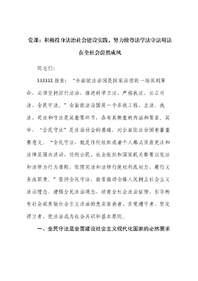 党课:积极投身法治社会建设实践,努力使尊法学法守法用法在全社会蔚然成风同志们:XXXXXX指出:全面依法治国是国家治理的一场深刻革命,必须坚持厉行法治,推进科学立法、严格执法、公正司法、全民守法。全面依法治国是一个系统工程,立法、执法、司法和守法是其重要环节,各有其侧重的内涵和要求。其中,全民守法是法治社会的基础,对全面依法治国有着重要意义。全民守法,就是任何组织或者个人都必须在宪法和法律范围内活动,任何公民、社会组织和国家机关都要以宪法和法律为行为准则,依照宪法和法律行使权利或权力、履行义务或职责。坚持全民守法,就要推动全体人民树立社会主义法治理念,增强全民法治观念,培育全社会法治信仰,引导所有社会成员做社会主义法治的忠实崇尚者、自觉遵守者、坚定捍卫者,使法治成为社会共识和基本原则。一、全民守法是全面建设社会主义现代化国家的必然要求1978年,党的十一届三中全会确立了有法可依,有法必依,执法必严,违法必究,成为引领新时期社会主义法治建设的十六字方针。2012年,党的十八大正式把科学立法、严格执法、公正司法、全民守法确认为全面推进依法治国、加快建设社会主义法治国家应当遵循的新十六字方针。新十六字方针实现了社会主义法治理念和实践的跨越式发展,标志着依法治国进入新时代。通过科学立法保障法律质量而非追求法律数量,通过严格执法保障人人平等,通过公正司法保障个案正义,通过全民守法保障社会秩序,才能更好发挥法治固根本、稳预期、利长远的保障作用。全民守法的从无到有,充分说明,在法治轨道上全面建设社会主义现代化国家必然要求法治成为社会共识和基本准则,全民守法是全面建设社会主义现代化国家的必然要求。二、全民守法是法治社会的基础工程XXXXXX指出,法治社会是构筑法治国家的基础。要建设覆盖城乡的现代公共法律服务体系,深入开展法治宣传教育,增文可居文库——海量学习资料,手机电脑均可下载www.wenkeju.com强全民法治观念。推进多层次多领域依法治理,提升社会治理法治化水平。推动全社会树立法治意识。法律要发挥作用,需要全社会信仰法律。全体公民都信仰法治,法治国家才会有深厚的精神文化基础;全体公民都尊重宪法,依宪治国才会有广泛的民意支持基础;全体公民都遵守法律,法治秩序才会有根本的存在依据;全体公民都赞许合法、贬责违法,公序良俗才会有道德的坚强支撑。全面推进全民守法,要着力增强全民法治观念,要坚持把全民普法和守法作为依法治国的长期基础性工作,深入开展法治宣传教育,树立宪法法律至上、法律面前人人平等的法治理念。推进多层次多领域依法治理。实践是培养法治信仰的沃土。深入开展多层次多形式法治创建活动,充分发挥市民公约、乡规民约、行业规章、团体章程等社会规范在社会治理中的积极作用。市民公约等基层规范是与人民群众日常生活关系更为密切的活法,通过社区、行业等多层次多领域依法治理,建立健全社会自治体系,从中培育人民群众对规则的认同文可居文库——海量学习资料,手机电脑均可下载www.wenkeju.com和信赖,才能更好推动增强守法意识,调动投身依法治理实践的积极性和主动性。建设完备的法律服务体系。只有使人民群众感知法律在我身边,方能提高其热爱法律的程度。近年来,我国在民生领域加大法律服务,完善法律援助制度,健全司法救助体系,一定程度上保证了人民群众在遇到法律问题或者权利受到侵害时,能够获得及时有效的法律帮助。通过便捷、高效的法律服务和帮助,引导群众遇事找法、解决问题用法,逐步改变过去遇事不是找法而是找人的现象,群众对于法治的信心进一步增强。健全依法维权和化解纠纷机制。法律是否有用,往往体现为法律在维护群众权益、化解社会矛盾中能否发挥权威性作用。只有依法解决好群众最关心最直接最现实的利益问题,群众才能对法律产生信赖和服从。要引导全体人民遵守法律,有问题依靠法律来解决,决不能让那种大闹大解决、小闹小解决、不闹不解决现象蔓延开来。实践中,通过畅通群众利益协调、权益保障法律渠道,把信访纳入法治化轨道等措施,公文可居文库——海量学习资料,手机电脑均可下载www.wenkeju.com民依法维权意识不断增强,全社会信守法治的氛围才能日益浓厚。三、推进全民守法坚定法治自信公民道德建设是增强法治观念、推进全民守法的重要手段。全民守法既要重视发挥法律的规范作用,又要重视发挥道德的教化作用。必须坚持法治和德治相结合,以道德促进法治观念养成,以道德推进全民守法。要把道德要求贯彻到法治建设中,以法律承载符合中华优秀传统文化和社会主义核心价值观要求的基本道德规范,引领道德风尚,在执法和司法过程中体现社会主义道德要求,发挥惩恶扬善功能,推进社会诚信建设,健全社会信用体系,强化违法行为惩戒机制,为全民守法营造