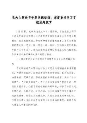 党内主题教育专题党课讲稿:高度重视学习贯彻主题教育3月30日,党中央决定从今年4月开始,在全党自上而下分两批开展学习贯彻习近平新时代中国特色社会主义思想主题教育。这是根据党的二十大精神作出的重大部署,旨在用党的创新理论统一思想、统一意志、统一行动,弘扬伟大建党精神,牢记三个务必,推动全党为全面建设社会主义现代化国家、全面推进中华民族伟大复兴而团结奋斗。一、核心是用习近平新时代中国特色社会主义思想凝心铸魂习近平新时代中国特色社会主义思想内容涵盖改革发展稳定、内政外交国防、治党治国治军等方方面面,是系统全面、内涵丰富、逻辑严密、不断发展的科学理论体系,其中十个明确、十四个坚持、十三个方面成就概括了这一思想的主要内容,凸显了理论创新的鲜明特征,回答了中国之问、世界之问、人民之问、时代之问,以全新的视野深化了对共产党执政规律、社会主义建设规律、人类社会发展规律的认识,以原创性理论贡献标注了马克思主义发展的新高度,实现了马克思主义中国化新的飞跃。习近平新时代中国特色社会主义思想是在坚定推进具有许多新的历史特点的伟大斗争中,在中华民族迎来从站起来、富起来到强起来的伟大飞跃中形成并不断丰富发展的科学理论,且在指导新时代伟大实践中展现出强大的真理力量和实践伟力,是认识世界和改造世界的强大思想武器。新时代新征程党所处的历史方位和实践基础发生了深刻变化,所面临的新使命新任务之重、矛盾风险挑战之多、治国理政考验之大都前所未有,前途光明而任重道远。因此,必须坚持以习近平新时代中国特色社会主义思想为指导,确保各项工作更好体现时代性、把握规律性、富于创造性,坚定有力推动党的二十大擘画的宏伟蓝图一步一步变为现实。在全面建设社会主义现代化国家、全面推进中华民族伟大复兴的历史进程中,在以党的自我革命引领社会革命的伟大实践中,在全党深入开展学习贯彻习近平新时代中国特色社会主义思想主题教育,坚持不懈用这一思想凝心铸魂,不断巩固团结奋斗的共同思想基础,事关党和国家事业继往开来,事关中国特色社会主义前途命运,事关中华民族伟大复兴光明前景,对于动员全党更加紧密地团结在以习近平同志为核心的党中央周围,高举中国特色社会主义伟大旗帜,为全面建设社会主义现代化国家、全面推进中华民族伟大复兴而团结奋斗,具有重大现实意义和深远历史意义。用习近平新时代中国特色社会主义思想凝心铸魂,要做到知其言更知其义、知其然更知其所以然,切实用以武装头脑、指导实践、推动工作,进而筑牢信仰之基、补足精神之钙、把稳思想之舵,增强战略定力、保持战略清醒、敢于善于斗争,确保党和国家事业始终沿着正确方向前进,不断赢得优势、赢得主动、赢得未来。二、重点是把握好习近平新时代中国特色社会主义思想的世界观和方法论,坚持好、运用好贯穿其中的立场观点方法学深悟透习近平新时代中国特色社会主义思想,还必须把握好这一思想的世界观和方法论,坚持好、运用好贯穿其中的立场观点方法。党的二十大报告深刻阐述了习近平新时代中国特色社会主义思想的世界观和方法论,六个必须坚持深入诠释了贯穿其中的立场观点方法,是对习近平新时代中国特色社会主义思想世界观和方法论的高度凝练、科学概括。必须坚持人民至上,是根本的价值导向。就是要站稳人民立场、把握人民愿望、尊重人民创造、集中人民智慧,形成为人民所喜爱、所认同、所拥有的理论。中国共产党根基在人民、血脉在人民。坚持以人民为中心的发展思想,体现了党的理想信念、性质宗旨、初心使命,也是对党的奋斗历程和实践经验的深刻总结。人民至上蕴涵着马克思主义人民主体思想,是我们党对马克思主义唯物史观的继承与发展,是党的群众路线一以贯之的根本遵循,是马克思主义中国化时代化的根本价值取向,集中体现了我们党百年不变的初心与使命。必须坚持自信自立,是内在的精神特质。就是要坚持中国的问题必须从中国基本国情出发,由中国人自己来解答,坚持对马克思主义的坚定信仰、对中国特色社会主义的坚定信念,坚定道路自信、理论自信、制度自信、文化自信,以更加积极的历史担当和创造精神为发展马克思主义作出新的贡献。必须坚持守正创新,是鲜明的理论品格。就是要以科学的态度对待科学、以真理的精神追求真理,坚持马克思主义基本原理不动摇,坚持党的全面领导不动摇,坚持中国特色社会主义不动摇,以满腔热忱对待一切新生事物,不断拓展认识的广度和深度,敢于说前人没有讲过的新话,敢于干前人没有做过的新事,以新的理论指导新的实践。必须坚持问题导向,是源头活水。就是要聚焦实践遇到的新问题、现实存在的深层次问题、人民群众急难愁盼问题、国际变局中的重大问题、党的建设面临的突出问题,不断提出真正解决问题的新理念新思路新办法。必须坚持系统观念,是基本工作方法。就是要不断提高战略思维、历史思维、辩证思维、系统思维、创新思维、法治思维、底线思维能力,为前瞻性思考、全局性谋划、