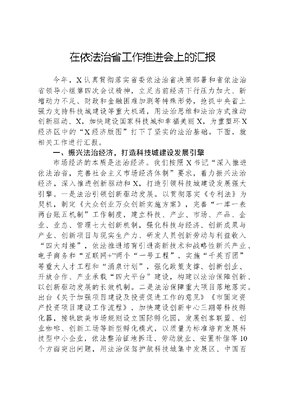 在依法治省工作推进会上的汇报今年,X认真贯彻落实省委依法治省决策部署和省依法治省领导小组第四次会议精神,立足当前经济下行压力加大、新增动力不足、财政和金融困难加剧等特殊形势,抢抓中央省上强力支持科技城建设等重大机遇,用法治思维和法治方式推动创新驱动、X,加快建设国家科技城和幸福美丽X,为重塑环X经济区中的X经济版图打下了坚实的法治基础。下面,就相关工作进行汇报。一、振兴法治经济,打造科技城建设发展引擎市场经济的本质是法治经济。我们按照X书记深入推进依法治省,完善社会主义市场经济体制要求,着力振兴法治经济,深入推进创新驱动和X,打造引领科技城建设发展强大引擎。一是法治引领创新驱动发展。以贯彻落实《专利法》为契机,制定《大众创业万众创新实施方案》,完善一库一表两台账五机制工作制度,建立科技、产业、市场、产品、企业、业态、管理七大创新机制,强化科技与经济、创新成果与产业、创新项目与现实生产力、研发人员创新劳动与利益收入四大对接,依法推进培育引进高新技术和战略性新兴产业、电子商务和互联网+两个一号工程,实施千英百团等重大人才工程和涌泉计划,强化政策支撑、创新创业、开放合作、产业承载四大平台建设,构建以法治保障创新、以创新驱动发展的长效机制。二是法治保障重大项目落地落实。出台《关于加强项目建设及投资促进工作的意见》《市固定资产投资项目建设工作流程》,加快建设创新中心三期等科技孵化器,接轨欧美市场规则设立国际孵化园,发展创客联盟、创业咖啡、创新工场等新型孵化模式,以质量为标准培育发展科技型中小企业,依法整治征地拆迁、劳动就业、安置补偿等10个方面突出问题,用法治保驾护航科技城集中发展区、中国百合花国际博览园等重大项目建设落地,获得总理肯定性批示。三是法治推动X。建立并落实《中国(X)科技城X创新驱动先行先试政策措施》,以法治园区为支撑推进中物院军民结合产业示范园、兵装集团58所汽车电子产业园等X产业园建设,打造X技术创新和成果转化平台,探索开展X改革创新示范区(实验区)试点,将3个国家重大科技专项、14个重大产业项目纳入国务院对科技城发展批复,逐步解决国防知识产权解密转化、X投融资等1+5体制机制问题。二、推进依法行政,优化科技城建设政务环境今年以来,我们按照有境界、有担当、有规矩、有作为有底线的要求,深入推进依法行政,着力加强法治政府建设,为科技城建设创造优良政务环境。一是健全落实依法决策机制。出台《市重大行政决策程序规定》《市行政决策合法性审查规定》,制定重大决策与政协协商、提请人大审议和向党委报告制度,探索建立行政决策过错纠正和责任追究制度,坚持行政首长出庭应诉制度,开展依法行政决策专项督查,各级政府聘请法律顾问覆盖率达100﹪,有效解决了一些地方决策中不科学、不民主问题。二是依法履行行政职权。制定《深入推进依法行政加快建设法治政府的意见》《关于做好精简审批事项规范中介服务完善企业投资项目并联审批制度工作的通知》,深化商事制度改革和行政审批制度改革,开展行政执法裁量权试点和综合行政执法体制改革试点工作,深入落实五个严禁,市级行政许可项目在承诺时限基础上平均提速75.4﹪,党政领导干部离任生态环境审计被央视《新闻联播》和新闻频道专题报道,成为中央改革办改革案例。三是全面深入推进政务公开。制定《市人民政府2024年度推进依法行政工作安排》《公共资源交易目录》,建立完善外来企业投诉服务对接和情况通报机制,推行一窗式三集中三到位政务服务模式,80%以上项目纳入集中交易,为政府节约资金4.6亿元,食品药品安全监管成为全省示范典型,《阳光政务》栏目获全国电视民生影响力10强品牌。三、强化基层治理,筑牢科技城建设稳定基石国家科技城建设首先需要一个和谐稳定的社会环境。过去一些地方存在社会治理一阵风头痛医头、脚痛医脚治标不治本等突出问题。为此,我们把依法解决突出问题作为社会治理的重中之重,着力夯实基层法治基础,营造良好社会法治环境。一是依法治理突出问题。出台《关于创新社会治理方式进一步深化网格化服务管理工作的实施意见》,开展防邪禁毒、涉枪涉爆、医闹医患、安全生产行政执法监督检查等专项整治,集中攻坚清理5422件执行积案,依法解决全市12.42万失地农民进社保问题,得到省委充分肯定。二是强化法治意识。出台《关于加强法治X宣传阵地建设指导意见》,制定并通过法治X建设宣传工作决议,开展四大班子领导带头向宪法集体宣誓行动,统一设置道德·法治讲堂,将强化法治意识融入三严三实专题教育全过程,集中推进X司法政务微博普法活动,被司法部评为全国十大司法微博。三是夯实基层法治基础。印发《关于进一步加强村(居)务公开工作的通知》《关于进一步完善村规民约居民公约的通知》,建设
