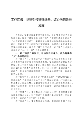 工作汇报:党建引领建强堡垒,红心向阳助推发展近年来,X街道高度重视党建工作,立足X是红色热土的独特优势,围绕建强堡垒专项行动党建引领提升行动创五好评星级活动,着眼街道全域党建的集成融合和整体谋划,创设了红心向阳365党建载体,为经济社会发展提供坚强的组织保障。着力在建上下功夫,在强上求实效,具体抓好人、钱、事三个关键要素。一、抓两委带队伍,激活队伍战斗力,着力解决有人办事的问题。在用人上。坚强实干的两委队伍和党员队伍为重点是基层党组织发挥作用的重要基础。X街道始终坚持以选优配强村居主干班子结构为重点,通过2021年村级组织换届,共选出183名两委班子成员,25个村(社区)全面实现一肩挑,队伍学历层次明显提升,平均年龄明显下降,结构比例更加合理。在教育上。重点用好X革命摇篮XXXXXX16次莅临指导全国首个侨办工业村等独特资源,打造以中共X县委成立旧址和X村主题教育研学点为核心的两条研学路线,用家门口的资源,让党员接受最近的教育,真正做到教育常态化长效化。在管理上。重点落实好《市村(社区)干部管理监督和服务保障办法》,对两委干部进行全方位管理,用制度来管人,真正把村干部当干部。在激励上。重点落实相关待遇,落实社区干部五险一金,完成村两委干部养老保险全覆盖;出台村级绩效量化考评指标,按考核等次兑现绩效补贴;出台村财增收奖励机制,不高于村财增长收入部分的30%可作为两委干部的激励部分补贴。二、抓招商壮村财,强化造血能力,着力解决有钱办事的问题。发展壮大集体经济是基层党组织建设的一项重大任务,也是增强党组织凝聚力、向心力的重要内容。截至2023年底,X22个村经营性收入全部迈过10万元门槛,其中20个村超过20万元,溪头、奎岭两个村超过100万元。同时预计2024年将有11个村突破50万元,占比50%,X村可达到200万元。各村主要依靠留用地补偿款和乡贤捐资的村财完成初步积累,通过购置资产、盘活资源发包出租形成造血能力。近年来X街道着力拓宽村财增收渠道,发挥临近工业村优势,鼓励各村开展招商引税工作,把新增税收地方留成部分的30%返还奖励给相关村居,充分调动村居的积极性,平均每村可获得招商引税奖励10万元。三、抓发展促稳定,着力解决能干事、干成事的问题。建强堡垒的主要目的是推动发展,X街道坚持把能干事、干成事作为建强堡垒成效的重要检验。近年来,X街道经济社会发展任务比较繁重,先后启动了洪宽片区提升改造工作,全面推进园区配套和主导产业提档升级;谋划包装了政府专项债,推动了乡村振兴综合项目;完成了征交地工作,保障了基础设施和产业项目落地建设。这几年X街道每年征交地面积都在1000亩左右,今年随着双福高速、福耀全球出口基地等项目落地动建,征交地面积达2000亩,其中福耀全球出口基地700亩用地。X街道克服资金紧张、恰逢春节假期等困难,仅用两个多月完成征交地任务。在具体工作中,各村党组织发挥领头雁作用,主动担当作为,组织发动村两委和党员、干部、群众全力参与中心工作,与街道同频共振,协力攻坚,不仅在文可居文库——海量学习资料,手机电脑均可下载www.wenkeju.com实践中提升能力、激发活力,也在实践中检验建强堡垒的实际成效。下一步,街道将继续依托红心向阳365党建载体,持续深入开展建强堡垒专项行动,培育锻强政治过硬、组织过硬、队伍过硬、能力过硬、作风过硬的基层组织战斗堡垒,为加快建设现代化国际化海滨山水城市,打造最优最佳卓越超越的最X贡献X力量。文可居文库——海量学习资料,手机电脑均可下载www.wenkeju.com