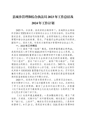县城乡管理和综合执法局2023年工作总结及2024年工作计划2023年,在县委、县政府的正确领导下,县城管执法局始终坚持以XXX新时代中国特色社会主义思想为指导,坚决贯彻落实县委、县政府各项决策部署。全面贯彻执行上级有关城乡管理和综合执法的政策、要求,严格履行法律法规赋予的职责,围绕中心、服务大局,有效有力推进城乡管理和综合执法工作。一、2023年工作情况(一)落实第一议题制度,不断丰富党建工作内涵。我局党组深入学习贯彻XXX新时代中国特色社会主义思想,认真落实XXXXXX重要指示批示精神和党中央重大决策部署,把不忘初心、牢记使命作为全体班子成员的终身课题,增强四个意识、坚定四个自信、做到两个维护,不断增强政治判断力、政治领悟力、政治执行力。2023年,我局党组以党组会议、党组理论中心学习组、全体干部职工会议等形式共集中XXXXXX重要指示批示及论述精神21次;召开党风廉政专题会议2场,党组书记讲党课;邀请县纪委监委驻住建局纪检监察组组长到会并作警示讲话。2023年,我局共开展专题党课5次、主题党日活动8次、党史专题学习5次、学习各项重要条例(规定)3次,及时传达了学习上级文件精神,做实了业务知识培训等工作,并根据《关于推动党史学习教育常态化长效化的意见》专题研究了常态化党史学习的下步工作。(二)扎实开展主题教育。一是加强统筹计划。建立周安排、月调度、定期评估闭环管理机制,制定落实了主题教育四计划、三清单,确保各项任务落细落到位。二是科学部署学习。9月25日,局党组审定通过《XX县城乡管理和综合执法局关于深入开展学习贯彻XXX新时代中国特色社会主义思想主题教育的实施方案》,并召开动员部署会议,传达学习了县主题教育动员部署会议精神。2023年,以党支部为单位开展主题教育,重点围绕8+1+1内容组织学习。局党组书记带头讲党课4次,支部书记跟进讲党课3次,党组成员讲党课2次。三是做好调查研究。根据县委组织部《关于开展小切口深调查真研究解难题调查研究工作的通知》有关要求,全体党组成员结合工作实际,各自选题、领题,积极开展调查研究,形成调研成果。将11月6日召开了调研成果转化会议,共同探讨了存在的问题,促进调研成果共享和传播,进一步提高了主题教育的质量和水平。四是务实开展党员建功立业三岗活动。选出了一批优秀党员干部为典型,充分利用党员先锋模范作用,在工作实际中、与社区共建中广泛开展正能量宣传活动,讲好了新时代城管故事。(三)坚持党建引领、发挥堡垒作用。局领导班子成员带头规范党内政治生活,带头以普通一员参加所在支部党员活动,利用学习强国政务微信等渠道分享重要文章、作学习研讨。结合两学一做学习教育,局支部保持了每季度党员大会讨论和党课学习最新中央精神、XXXXXX重要讲话不动摇,坚持三会一课不落空,大力宣传学习党的XX大精神。严格按照省委、市委、县委《加强党的基层组织建设三年行动计划实施方案(2021-2023年)》精神,大力加以落实。一是抓支部建设。局党支部制定印发《XX县城管执法局2023年党建工作要点》,制定了党建工作计划,实行党员领导干部一岗双责制度,进一步明确了党支部委员的职责分工和任务要求。二是落实管党责任。做好以党建为引领,推动职能范围的目标任务、重点工作分解到党员干部,发挥不定期的督促检查,及时分析情况,协调解决问题,落实推进措施,充分发挥了党员干部的先锋模范和业务骨干作用,增强了基层党组织的战斗力。三是加强党员管理工作。现有党员31名,注重做好党员发展、党费收缴和流动党员管理等工作。与党员之间关爱谈话(提醒)6人次,通过谈话谈心了解党员最新思想动态,更好地推进各项工作落实。四是开展党旗领航,部门下沉结对共建活动。带领支部党员到结对社区北门社区开展了我为群众办实事公益行动、城管服务进社区等一系列活动4次,慰问困难党员、困难儿童、困难家庭16人;到地派镇英洞村慰问社区困难、低保、重病家庭人员5人;前往东郊场社区、城南社区、北门社区,小塘村、晨光村党群服务中心开展城管服务进社区活动,活动派发宣防溺水,垃圾分类,有限空间、建筑垃圾、惠民便民、燃气安全使用手册传单张5000余份,设置宣传栏6个,并对社区工作人员讲解城管领域法律法规,并做好市民宣传指引工作。以实际行动诠释责任担当,履行建设幸福绿色美丽示范县环境的社会责任,解决了一批群众急难愁盼的环境卫生问题,进一步提升了机关与社区党建工作的联动,提升党组织堡垒作用。(四)两违整治及无违建镇(街)创建工作成效。两违拆除。全县累计拆除两违建筑XX万㎡,完成市下达任务(XX万㎡)的XX%,居全市排名第三,全部镇、街完成市、县下达的工作任务。建(构)筑物图斑。2022年,全县图斑总数XX宗,核查率XX%,办结