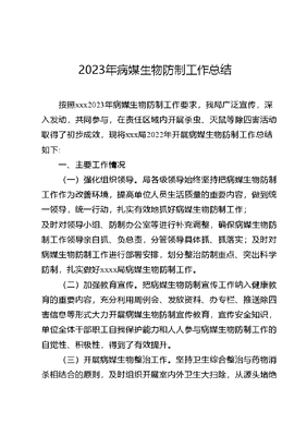 2023年病媒生物防制工作总结按照xxx2023年病媒生物防制工作要求,我局广泛宣传,深入发动,共同参与,在责任区域内开展杀虫、灭鼠等除四害活动取得了初步成效,现将xxx局2022年开展病媒生物防制工作总结如下:一、主要工作情况(一)强化组织领导。局各级领导始终坚持把病媒生物防制工作作为改善环境,提高单位人员生活质量的重要内容,做到统一领导,统一行动,扎实有效地抓好病媒生物防制工作;及时对领导小组、防制办公室等进行补充调整,确保病媒生物防制工作领导亲自抓、负总责,分管领导具体抓、抓落实;及时对病媒生物防制工作进行部署安排,划分整治防制重点、突出科学防制,扎实做好xxxx局病媒生物防制工作。(二)加强教育宣传。把病媒生物防制宣传工作纳入健康教育的重要内容,充分利用周例会、发放资料、办专栏、推送除四害信息等形式大力开展病媒生物防制宣传教育,宣传安全知识,单位全体干部职工自我保护能力和人人参与病媒生物防制工作的自觉性、积极性,得到了有效提升。(三)开展病媒生物整治工作。坚持卫生综合整治与药物消杀相结合的原则,及时组织开展室内外卫生大扫除,从源头堵绝了病媒生物的滋生;加强垃圾清运管理,垃圾及时清运、日产日清,保持厕所清洁卫生,无异味,无污垢。对照职责、任务、标准,列出整治重点和难点,常态化集中力量对停车场、水沟、卫生间等死角进行整治。(四)确保病媒生物防制工作取得实效。按计划针对夏季苍蝇、蚊虫较多,春秋季老鼠活动频繁等实际,集中组织全体干部职工针对性开展消杀活动;对垃圾箱、下水沟、楼道、厕所、绿化地带等孳生地进行杀虫剂滞留喷洒,有效控制蚊、蝇、蟑螂密度,预防传染病发生;同时利用网格值守、爱国卫生大扫除众参与活动等,及时对区域内毒饵站、病媒生物孳生地等每周进行自查,有效杜绝病媒生物滋生。二、存在不足(一)病媒生物防制教育宣传工作不够深入。(二)常态化落实病媒生物防制工作检查机制不够有效。三、下一步工作计划(一)持续组织开展好病媒生物防制工作。大力开展环境卫生整治行动,常态化进行消杀,清除卫生死角和四害孳生地。对办公区域、xxxx等人员较多、容易滋生四害隐患的地方进行特别关注,杜绝四害孳生环境条件。(二)加大病媒生物防制教育、宣传力度。大力开展形式多样的宣传教育活动,进一步提高广大干部职工参与病媒防制工作的自觉性、积极性,做到家喻户晓,人人皆知,确保病媒生物防制工作顺利开展。(三)及时整改存在不足。针对工作中暴露出来的突出问题继续下大力进行整改,充分运用各种有效方式和载体,深入开展病媒生物防制的宣传工作。xxxxxxxxx2023年12月xx日