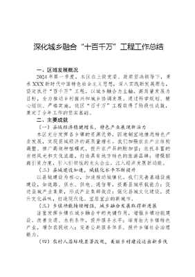 深化城乡融合十百千万工程工作总结一、区域发展概况2024年第一季度,本区在上级党委、政府坚决领导下,秉承XXX新时代中国特色社会主义思想,深入实践新发展理念,坚定执行百千万工程。以城乡融合为主轴,高质量发展为目标,全力推动乡村振兴和城乡协调发展。通过科学规划、精心组织、严格实施,我区百千万工程取得了阶段性成就,奠定了全年工作的坚实基础。二、主要成就(一)县域经济稳健增长,特色产业展现新活力本区充分发挥各乡镇的资源优势,因地制宜地推进特色产业发展,实现县域经济的高质量增长。我们加强农业产业结构调整、推广高效种植模式,提升农产品的附加值;依托丰富的自然风光和文化底蕴,打造具有地方特色的旅游品牌;增强招商引资力度,引入引领性的龙头企业,注入经济发展新动能。(二)县城建设加速,城镇化水平不断提升以县城建设为核心,加速推动城镇化。我们完善基础设施建设,如道路、供水、供电、通信等,提高县城承载能力;促进县城产业集聚,形成产业集群效应;强化县城文化建设,提升文化品味,打造现代化、宜居宜业的新城市。(三)乡镇功能持续增强,城乡融合发展取得新进展注重发挥乡镇在城乡融合中的关键作用,增强乡镇功能建设。改善交通、水利条件,提升服务水平;培育壮大乡镇特色产业,增加农民收入;完善公共服务体系,提升乡镇社会治理能力。(四)农村人居环境显著改观,美丽乡村建设迈出新步伐坚持生态优先、绿色发展的理念,推进农村环境整治。加强垃圾处理,推广垃圾分类与资源化利用;建设污水处理设施,改善水环境;加大绿化美化力度,提升村庄绿化率,打造美丽宜居乡村。(五)城乡区域统筹发展加力,空间布局优化强化城乡区域统筹发展,优化空间布局。推动城乡规划一体化,实现规划衔接;推进土地集约利用,提升土地效率;促进人才、资金、技术等要素在城乡之间有序流动,推动城乡融合。三、存在的问题与改进措施尽管在百千万工程推进中取得成效,但仍面临挑战和问题需解决。部分乡镇发展不均衡,特色产业尚需培育;县城基础设施有待完善,承载能力需增强;农村环境治理任务重,长效机制待健全;城乡区域协调需加强,一体化水平亟待提升。我们将深入调研分析,制定针对性规划,加大政策扶持,加快基础设施建设与更新,强化乡镇功能建设,深化农村环境治理,并加强城乡区域统筹协调,以实现更高水平的区域协调发展。四、未来工作规划(一)深化县域经济发展,壮大特色产业我们将继续强化县域经济发展,优化产业布局,培育壮大特色产业。深化农业供给侧结构性改革,加快农业产业升级;积极发展乡村旅游和文化产业;增强招商引资工作,引进优质项目和企业,推动经济健康持续增长。(二)加速县城建设,提升城镇化水平继续推进县城建设,完善基础设施和公共服务,提升承载能力和吸引力。促进县城产业和人口聚集,构建区域发展核心引擎,注重文化和社会治理创新,营造宜居宜业的现代化城镇。(三)增强乡镇功能建设,发挥联动作用加强乡镇功能建设,提升服务和治理水平。投入基础设施建设,改善交通、水利条件;推动产业发展,壮大乡镇特色产文可居文库——海量学习资料,手机电脑均可下载www.wenkeju.com业;创新社会管理方式,提高治理效能,发挥乡镇在城乡融合中的纽带作用。(四)持续改善农村人居环境,打造美丽乡村不断深化农村环境整治,推动环境持续改善。加强垃圾和污水处理设施建设,提升环境治理水平;推进绿化美化工作,提升村庄风貌;加强公共设施建设,提高公共服务水平,打造美丽宜居乡村。(五)加大城乡区域统筹力度,促进资源集约利用进一步加力城乡区域统筹,优化空间布局。强化城乡规划编制与执行,实现一体化管理;推进土地管理与利用,促进土地整治;加强要素流动与配置,推动城乡融合。通过加大统筹力度,实现资源集约利用和共享。总结而言,在百千万工程实践中取得显著成果的同时仍需面对诸多挑战。下一步,我们将深化经济发展、加快城镇建设、增强乡镇功能、推进环境整治及强化统筹力度等方面工作,以期百千万工程取得更大突破,为城乡融合发展及高质量成长贡献新的更大力量。文可居文库——海量学习资料,手机电脑均可下载www.wenkeju.com