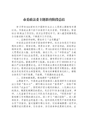 市委政法委主题教育阶段总结学习贯彻XXX新时代中国特色社会主义思想主题教育开展以来,市委政法委不折不扣落实中央及省委、市委要求,紧密结合XX政法工作实际,抓实全员理论学习,深入基层破解难题,全力推动振兴发展,不断提升工作质效。一、坚持深学细研,理论学习全员覆盖市委政法委领导班子坚持领学带学,机关全体党员干部全程参加研讨、同学共研,原原本本学、逐字逐句读,深刻领会精神实质、准确把握核心要义,用XXX新时代中国特色社会主义思想武装头脑、指导实践、推动工作。以书香政法为载体组织学习XXX法治思想,发表百篇读书体会文章,开展青年干部读书分享会、自我革命大家谈、青年理论学习小组读书会等系列活动,营造浓厚学习氛围。结合深入学习XXXXXX关于全面从严治党的重要论述,召开市委政法委机关党风廉政建设工作会议,邀请派驻纪检监察组组长作警示教育专题报告,通报政法系统违纪违法典型案例,用身边的事教育身边的人,增强全体党员干部不敢腐、不能腐、不想腐的政治自觉。二、坚持破解难题,精准调研全程跟进主题教育中,市委政法委坚持将深入基层调研作为谋划政法工作的基本功、倾听群众诉求的直通车、检验干部本领的试金石。紧盯维护安全稳定的难点、人民群众关注的热点、制度机制建设的落点,先后召开XX余次基层法官、律师、人民监督员等法治工作队伍代表座谈会,同题共答汲取破解工作难题的源头活水。深入学习浦江经验,深入困难较多、矛盾突出的基层一线,组织委机关党员干部开展周末全员下访接访,面对面倾听群众诉求,切实准确掌握一线呼声,梳理形成问题清单、任务清单、责任清单和成果转化清单,边调研边整改边建章立制,形成《律师与法官良性互动互评实施办法》《持续优化法治化营商环境公开承诺XX条》等一批制度创新成果。三、坚持服务大局,推动发展全力保障市委政法委将推动发展作为主题教育的着力点,聚焦深入实施全面振兴新突破三年行动和振兴新突破、我要当先锋专项行动,紧紧围绕着力提高市域治理能力,在统筹发展和安全上实现新突破和着力优化法治环境信用环境,在打造法治XX上实现新突破两条赛道任务,全力实施全市政法系统X+X专项行动,坚持清单化、项目化、工程化推进。深化零事故、零案件、零纠纷社区(村)建设,打造一站式专业化工作室,化解矛盾纠纷X.X万余件,夯实城市平安建设底座。切实抓好检视整改,制定《XX市损害法治化营商环境案件评查办法》《XX市损害法治化营商环境行为认定标准》等指导性文件,推进营商环境问题万件清理专项监督行动,依法保护各类市场主体合法权益。深化领导干部进企业、服务振兴新突破专项行动,组团式开展政法系统与商(协)会企业面对面等服务活动,市委政法委机关服务企业干部诉求办结率达XXX%。