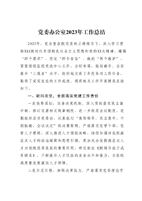 党委办公室2023年工作总结2023年,党办室在院党委的正确领导下,深入学习贯彻XXX新时代中国特色社会主义思想和党的XX大精神,增强四个意识,坚定四个自信,做到两个维护,紧密围绕医院党政中心工作,当好参谋,做好助手,全面提升三服务水平,较好地完成了年度各项工作任务,取得了实实在在的工作成效。现将相关工作开展情况总结如下。一、靶向攻坚,全面落实党建工作责任一是统筹谋划,完善决策机制。深入贯彻落实民主集中制,修订完善相关规章制度,进一步规范会议制度,定期组织召开党委会,认真执行集体领导,民主集中,个别酝酿,会议决定的决策原则。严格落实党管干部、党管人才原则,深入推进人才强院战略,持续加强对我院高层次人才的政治凝聚和思想引领,更加充分发挥高层次人才对我院改革发展的重要作用,研究制定《院领导班子成员联系》,不断提升人才队伍的业务水平和能力,为医院高质量发展提供人才保障。二是示范引领,加强决策能力。严格落实党委理论学习中心组学习制度,组织开展集中学习24次,深入学习贯彻党的XX大精神,不断提升能力水平。通过走出去的方式,组织保健院理论学习中心组学习中级人民法院抓机关党建经验做法。认真组织开好民主生活会,在卫健委党组的指导下,认真召开党史学习教育专题民主生活会,结合医院实际,坚持问题导向,认真剖析根源,查摆出6个方面的问题,梳理出15件具体整改问题清单,并积极推动整改。三是压实工作责任,推动提质增效。与各支部书记签订《党支部2023年党建工作目标责任书》,形成一级抓一级、层层传递压力和责任的党建工作格局。明确党建工作标准,将党建工作指标从定性转向定量,组织医院党委委员分片挂点党支部,建立党支部工作台账标准,每个支部确定有自身技术服务特色的支部工作法,着力特色党建品牌。二、夯基固本,切实加强党的组织建设一是加强党支部建设。组织开展星级党支部考评活动,切实把推行党支部星级评定管理作为夯实基层党建基础、提升基层党组织能力的重要抓手,围绕巩固拓展党史学习教育成果,全面促进党支部标准化、规范化建设,形成一批班子坚强、作用彰显、特色鲜明、影响广泛的党支部,打造一支政治坚定、干净担当、作风过硬、充满活力的党员队伍,用实实在在的举措点亮支部建设的五颗星,不断拓展一支部一特色一品牌的新内涵。不断总结经验做法,健全完善相关机制,强化制度执行力,形成长效机制,切实以党史学习教育引领党支部锻造成为坚强战斗堡垒,助推医院高质量发展。二是加强党务干部队伍建设。通过定期开展院内培训邀请外聘专家上党课等多种形式,组织全院小组长以上党务干部进行专题培训,重点提高基层兼职党务工作者的责任心和工作能力,筑牢党支部建设基石。同时,组织各支部开展智慧党建手机APP注册学习工作和党员先锋公众号关注学习工作。三是加强党建基础工作。按照市直工委党的建设工作指导委员会工作要求,深入开展我是党员我带头,防控疫情当先锋活动,并建立党员先锋指数评议体系,让党员的日常管理实现量化考核,有效地激发了党员队伍的生机与活力。严格党员基本信息采集数据校核录入注重培养严把党员入口关,今年确定入党积极分子6名,2名同志被接收为预备党员,3名预备党员按期转正,接转党员2名,有效做到按时足额上缴党费。结合医院特点,组织开展丰富多彩、形式多样的特色活动,围绕八一建军节开展祖师善美家风故事汇,组织开展助推电动车上牌倡导安全文明出行活动、喜迎XX大健美我的家主题实践活动以及学习贯彻党的XX大精神,踔厉奋发开新局红色电影节暨主题党日活动,自11月19日起共组织全体党员干部观看10场电影,并组织物业、保安人员观看2场。四是加强党员管理。深入贯彻落实沧州市卫健委《关于围绕六比六不比开展解放思想、奋发进取大讨论活动的实施方案》,切实把落实上级精神与做好当前疫情防控工作紧密结合起来,组织开展六比六不比疫情防控工作座谈23场,引导广大党员把理论学习研讨和做好当前工作相结合,围绕六比六不比,讲政治、讲担当讲奉献,把自己摆进去、把职责摆进去、把工作摆进去,在XX大精神指引下深刻查摆自身在思想观念、工作标准、责任落实、作风纪律等方面的突出问题和短板不足,在全院上下形成一种思想作风大转变、大提升的热潮,充分发挥党员先锋模范作用,促进加快保健院高质量发展步伐。五是加强志愿服务工作。研究制定《党建引领护佑健康志愿服务活动方案》,积极组织开展防疫情助创城共建文明狮城倡导文明家风共建文明家庭强国复兴有我防灾减灾困境儿童智慧助老医疗健康疫情防控、环境保护科学普及全国爱眼日社区防灾减灾应急知识等志愿服务活动24场次,参与人数达2000人次,并积极组织上报2022年度省学雷锋志愿服务先进典型。六是深度参与创城创卫工作。累计迎接创城、