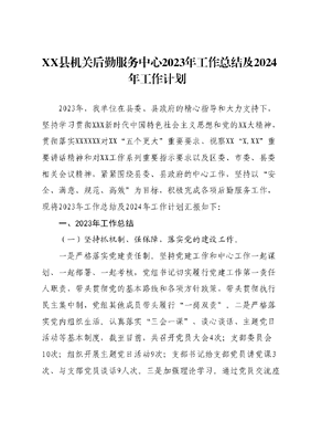 XX县机关后勤服务中心2023年工作总结及2024年工作计划2023年,我单位在县委、县政府的精心指导和大力支持下,坚持学习贯彻XXX新时代中国特色社会主义思想和党的XX大精神,贯彻落实XXXXXX对XX五个更大重要要求、视察XXX.XX重要讲话精神和对XX工作系列重要指示要求以及区委、市委、县委相关会议精神,紧紧围绕县委、县政府的中心工作,坚持以安全、满意、规范、高效为目标,积极完成各项后勤服务工作,现将2023年工作总结及2024年工作计划汇报如下:一、2023年工作总结(一)坚持抓机制、强保障,落实党的建设工作。一是严格落实党建责任制。坚持党建工作和中心工作一起谋划、一起部署、一起考核,党组书记切实履行党建工作第一责任人职责,带头贯彻党的基本路线和各项方针政策,带头贯彻执行民主集中制,党组其他成员带头履行一岗双责。二是严格落实党内组织生活。认真落实三会一课、谈心谈话、主题党日活动等基本制度,截至目前,共召开党员大会4次;支部委员会10次;组织开展主题党日活动9次;支部书记给支部党员讲党课3次、与支部党员谈话9人次。三是加强理论学习。通过党员交流座谈、集中研讨、个人自学的学习形式,学习贯彻落实XXX新时代中国特色社会主义思想和党的XX大精神,充分运用学习强国八桂先锋等学习平台,定期公布党员积分学习排行情况,激发党员干部自主学习热情。四是丰富党建活动载体。2023年春节七一组织党员到XX镇XX村慰问生活困难党员、老党员活动党组书记到挂点联系单位上党课等;五是加强党风廉政建设。定期组织党员干部开展党风廉政专题学习,开展节前廉政谈话,开展清风肃纪强化作风整治工作,开展清廉机关建设工作,开展领导干部利用职权或影响力插手工程项目谋私贪腐问题专项整治工作,组织党员以及年轻干部到XX镇重温入党誓词、参观廉政教育基地廉政主题教育活动等。(二)严谨细致,及时到位,高效做好后勤保障工作。一是加强基础设施维保工作。坚持做到小修不过夜,大修不隔天。积极做好行政中心、汇一联商务楼、老政府生活区、周转楼的水、电、发电机等的管理服务、日常维修、设备更新添置等工作,为干部职工提供舒适的办公和生活环境。截至目前,办公区和生活区维修达225次,办结率达100%。做到零投诉、零事故二是认真做好各项会议会务及县重大活动后勤保障工作。坚持把保障县重大活动作为政治任务来抓,完成各项重大活动的会务、接待、车辆等后勤保障工作。截至目前,我单位共完成各项大小会务保障工作六百余场次。三是加强安全保卫工作。通过组织对保卫人员安全、消防等方面的培训,加强保安人员安全意识,提高警觉性。严格门卫登记制度,做好行政中心、汇一联办公区的日常巡查,对上访群众做好有序引导,确保行政中心、汇一联办公区安全稳定,不发生群体性等不安全事件,以确保机关工作区域管理安全有序。截至目前,我单位协助政府、信访局共接待来访群众70批,2749人次。(三)坚持原则,健全机制,细致周到做好公务接待工作。一是加强公务接待管理。认真落实中央八项规定,严格执行公务接待事先审批制度,严格接待标准,统筹做好各项公务接待工作。二是充分发挥机关食堂的优势。对餐厅服务人员实施规范服务、微笑服务、温馨服务,加强对膳食服务人员的业务技能培训,注重菜色品种的增加和调整,严把采购关、验收关、储藏关和操作关,确保饭菜安全卫生营养。县四家班子、常委部门的公务接待基本安排在食堂,截至目前,共接待来鹿宾客378批次4584余人次,仅机关食堂就有167批次1899余人次。(四)完善管理制度,规范有序做好公务用车管理工作。根据政府机构的需求和公务用车管理规定,制定了科学、合理、高效的公务用车使用和管理计划。工作目标是提高公务用车的使用效率,降低用车成本,确保公务用车安全、环保、节能。一是建章立制,强化日常监管。为确保公务用车运行规范有序,我单位制定了公务用车管理制度,公务用车的日常运行维护由办公室统一调度,实行车辆定点停放、定点洗车、定点维修,严格执行公务用车油卡管理制度。对公务车辆的使用范围、出车原则有关纪律等进行了明确规定,规范了司机职责,杜绝乱停乱放等违章现象,同时强化日常监管,按照XX县车改领导小组要求,及时补充完善了《XX县党政机关公务用车管理实施细则》。二是落实安全教育。紧紧围绕安全、高效、优质的车辆保障目标,组织全体驾驶员认真开展安全教育,每月召开安全例会,并制定驾驶员考核奖惩制度,对公务用车交通行为实行常态化管理。三是落实好公务用车监督管理工作。根据自治区的要求,开展关于做好2022年度党政机关公务用车统计报告系统填报工作;同时监督各单位在公务用车管理平台上对无车辆任务出行的单位进行提示,并要求整改,保障公务车辆在平台上更加规范的使用;根据柳州市机关事务管理局的要求,开展了XX县关于违规