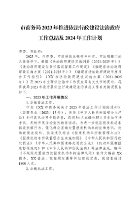 市商务局2023年推进依法行政建设法治政府工作总结及2024年工作计划市委、市政府:2023年,在市委、市政府的正确领导和省、市法制部门的具体指导下,根据《法治政府建设实施纲要(2021-2025年)》《法治政府建设与责任落实督察工作规定》《福建省法治政府建设实施方案(2021-2025年)》《福建省法治政府建设年度报告工作指引》《XX市法治政府建设实施方案(2021-2025年)》及2023年全面依法治市工作要点等有关文件的要求,现将我局2023年度开展依法行政建设法治政府工作有关情况报告如下:一、2023年工作开展情况1.加强普法工作。印发《XX市商务局关于2023年普法工作计划的通知》(岩商务业〔2023〕15号),开展《中华人民共和国安全生产法》和行政执法等专题讲座,组织34名在编公职人员参加学法考试,积极开展法治宣传教育活动。为进一步规范报废机动车回收拆解行为,强化群众正确处置报废机动车的法律意识,我局政策法规科、执法支队综合《报废机动车回收管理办法》《报废机动车回收管理办法实施细则》《中华人民共和国行政处罚法》《中华人民共和国道路交通安全法》《机动车强制报废标准规定》和《中华人民共和国民法典》等法律法规,编写《不规范处置或驾驶报废机动车的法律风险》宣传文稿在XX商务、XX普法、微信朋友圈等网站推送发表,阅读量超过1800人次。2.加强执法工作。一是双随机、一公开执法检查情况。年初制订《XX市商务局2023年度双随机、一公开抽查工作计划》,拟对报废机动车回收拆解、拍卖、汽车销售、二手车交易、餐饮、家庭服务、成品油经营、美容美发、洗染业、对外投资信息报告等11个行业开展行政监督检查。在监督过程中严格依照各行业相关法律、法规、规章的有关规定对相关企业进行检查,及时将检查结果在门户网站和互联网+监管平台公布。二是以商务行政执法支队为依托,始终把商务行政执法作为一项主责主业来抓,依法办理行政案件。2023年7月接上杭县商务执法大队报告群众举报其境内一废品回收站存在非法回收拆解报废机动车行为。对此局决定市、县联合开展前期调查,根据调查情况及时予以立案,经过调查发现上杭县刘领废品回收站(经营者刘领)确实存在未经资质认定,擅自从事报废机动车回收拆解行为,经集体讨论并根据《报废机动车回收管理办法》《报废机动车回收管理办法实施细则》《中华人民共和国行政处罚法》相关规定,对上杭县刘领废品回收站(经营者刘领)处以没收非法回收的报废机动车,没收非法所得XX元,并处2万元罚款的行政处罚。3.持续做好放管服工作。一是持续优化行政审批事项。今年我局的行政审批服务事项已由先前的27个优化至25个,均按照五级十五同标准化目录进行统一细化梳理,并安排专人负责后续的实时动态更新工作。目前全部事项均实现一趟不用跑及线上沟通线下邮寄的办理方式,所有事项均进驻福建省网上办事大厅,网上可办率达到100%、全程网办率100%、一趟不用跑占比100%、好评率达100%。二是全面落实并严格依照清单实施行政许可。根据《福建省行政审批制度改革工作小组办公室关于公布福建省行政许可事项清单(2023年版)的通知》,调整本级行政许可事项清单,并及时在福建省网上办事大厅公布。4.做好规范性文件审核清理工作。印发《XX市商务局行政规范性文件管理办法》(岩商务综〔2023〕4号),进一步加强了我局规范性文件管理工作。审查规范性文件的合法性3份;清理以市商务局名义发布拟继续有效的规范性文件7份。5.落实法律顾问制度。聘任单位法律顾问,并根据相关科室要求,对我局重大合同、执法程序等复杂和重要事项提前介入指导,从法律层面提出合理性建议。6.加强行政应诉能力建设。一是加强依法行政工作,加大商务领域法律法规的宣传力度,有效预防和化解行政争议。二是强化重大事项前期风险研判。局政策法规科与外聘法律顾问根据相关科室要求,对本单位重大合同、执法程序等复杂事项提前介入指导,从法律层面提出合理性建议。截至目前,无行政复议和行政诉讼案件。二、存在问题回顾过去的一年,我局虽然取得了一定的成绩,但与先进单位相比,与市委市政府要求,还存在一些不足和差距,主要表现为:一是学习XXX法治思想形式较单一,仅开展集中学习,党组成员未结合分管领域谈心得体会;二是行政执法不够规范,存在取证不规范、集体讨论不规范、案卷管理不规范等问题。三、2024年工作思路1.继续深化依法行政。一是深入学习XXX法治思想,开展党组成员谈心得体会活动。二是继续贯彻落实中共中央国务院《法治政府建设实施纲要》和《福建省法治政府建设实施方案(2021-2025年)》,推动相关工作任务落实。三是健全学法用法制度。推动领导干部关键少数带头尊法学法守法用法,增强运用法治思维和法治方式推动商务发展。四是建立完善商务局重大行