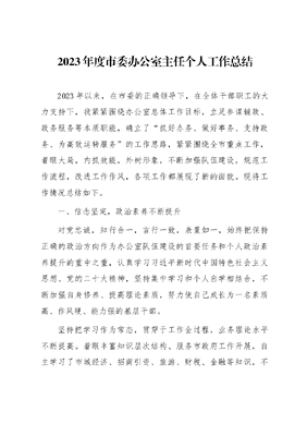 2023年度市委办公室主任个人工作总结2023年以来,在市委的正确领导下,在全体干部职工的大力支持下,我紧紧围绕办公室总体工作目标,立足参谋辅政、政务服务等本质职能,确立了抓好办务、做好事务、支持政务、为高效运转服务的工作思路,紧紧围绕全市重点工作,着眼大局,内抓效能,外树形象,不断加强队伍建设,规范工作流程,改进工作作风,各项工作都展现了新的面貌。现将工作情况总结如下。一、信念坚定,政治素养不断提升对党忠诚,知行合一,言行一致,表里如一,始终把保持正确的政治方向作为办公室队伍建设的首要任务和个人政治素养提升的重中之重,认真学习习近平新时代中国特色社会主义思想、党的二十大精神,坚持集中学习和个人自学相结合,不断加强自身修养、提高理论素质,努力使自己成长为一名素质高、作风硬、能力强的基层干部。坚持把学习作为常态,贯穿于工作全过程,业务理论水平不断提高。着眼丰富知识层次结构、服务市政府工作开展,自主学习了市域经济、招商引资、旅游、财税、金融等知识,不断提升辅政能力。坚持修德为先,把道德修养作为立身根本和立业基础,努力培养高尚品德,始终保持谦虚谨慎,时刻把心思和精力用在干事创业上。在思想上、政治上、行动上始终严格要求自己,主动向领导学习、向有经验的老同志学习、向身边的优秀同事学习,进一步担当作为,锤炼踏实务实的作风、狠抓落实的定力,全面提升自身业务水平。二、尽职尽责,服务市域发展大局坚持把工作重心和着力点放在服务全市大局和推动工作落实上,带领办公室人员五加二、白加黑,既当参谋,又搞服务,既抓政务,又抓事务,围绕建立健全全方位、宽领域、多层次的立体化服务体系,积极适应政府提速和市政府对办公室工作的新要求,全面强化参谋助手、督促检查、综合协调等职能,促进政府工作高效协调运转。一是以文辅政创精品,精心当好参谋助手。积极按照主动性、前瞻性、科学性的思路,领会领导意图,当好领导的外脑。时刻关注国家大政方针、关注全市经济发展动向、关注基层发展过程中的矛盾和问题,积极开展调查研究,及时掌握经济运行中的矛盾和制约因素,特别是针对招商引资、工业调整振兴、全域旅游发展、基础设施建设等重点工作,广泛调研,有针对性地提出可行性意见。累计组织撰写调研报告*多篇,为政府领导有效指导全市经济社会发展提供了第一手资料,增强了政府决策的科学性和可行性。牢固树立精品意识,坚持高标准、高要求、高质量,组织做好重要文字材料的起草工作,累计组织起草《政府工作报告》和全市经济工作会议、市委理论中心组读书会、市级领导干部务虚会议领导讲话等重要综合性文字材料*多个,都得到了领导的高度评价。严把公文处理程序关、审核关、质量关和时限关,不断提高公文运行质量和效果,保证了政令畅通。二是跟进重点促落实,及时做好督促检查工作。建立健全市政府重大决策立项督查、重点工作月调度、重点项目跟踪落实等制度,形成了定期督查、专项督查、现场督查、跟踪督查配套联动的督查落实机制,对《政府工作报告》部署的工作和重要会议领导安排的工作进行立项督查,对全市重点项目建设、财政收支、招商引资、工业经济运行等情况进行定期督查通报,对市政府常务会议、市长办公会议议定事项、市长批示事项进行专项督查,对惠民工程及群众关心的热点、难点问题进行跟踪督查通报,有力推动了全市重点工作和市政府重要决策的落实。在职期间,累计组织开展重要问题督查活动*多次,办理领导批示件*多件,有效促进了热点、难点问题的解决和全市面上工作的开展。三是注重细节抓服务,充分发挥综合协调作用。以服务领导、服务基层、服务机关为开展工作的出发点和落脚点,时刻想大局、顾大局,严谨细致地抓好各项活动、会务的组织协调工作,密切与市几大班子办公室的联系,形成整体联动、互相配合的良好局面。坚持从大局出发,加大对上沟通协调力度,勤请示、多汇报,做到了上情下达、下情上报。在全市重大活动中,协调各方,统筹安排,精心组织,保障了各项活动顺利开展。在近年来组织的经济工作会议、各类节会赛事、重要领导接待等活动中,均顺利完成工作任务,未出现任何纰漏,得到了各级领导的认可和好评。三、机制创新,机构运转更加规范选贤任能,建立科学激励机制。按照德才兼备、以德为先的要求,打破论资排辈、平衡照顾、注重资历的定势,注重选拔品德高尚、实绩突出、想干事、会干事的干部,推进干部能上能下、能进能出,树立起正确的用人导向。把忠诚服务作为立室之本,大力实施素质工程和精品工程,定始终坚持工作第一,高调做事、低调做人,一门心思干工作抓落实,不搞拉拉扯扯、吃吃喝喝等庸俗关系;坚持做实功、求实效,对工作雷厉风行、立说立行,带动办公室内部形成了低调内敛、甘于吃苦、务实向上的工作作风。规范内部管理,保障日常事务顺利开展。制定出台了《市政府办公室关于补充修订有关职