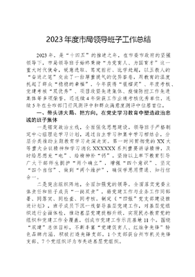 2023年度市局领导班子工作总结2023年,是十四五的推进之年,在市委市政府的坚强领导下,市局领导班子始终秉持为党育人、为国育才这一重大时代使命,锐意进取、笃定前行、比学赶超,以玉教人的奋进之笔交出了一份厚重提气的优异答卷,用教育的温度托起了群众稳稳的幸福,今年获得银榴奖、年度考核、党建考核双优秀、项目攻坚先进集体、疫情防控工作先进集体等多项荣誉,还连续4年荣获工作业绩考核优秀单位,连续5年在全市部门行风测评中和群众满意度测评中位居首位。一、带头讲大局、把方向,在党史学习教育中塑造政治忠诚的班子集体一是锚定政治主线,全面强化思想建设。领导班子严格制定中心组理论学习计划,通过自主学习和集中学习相结合,分层分类推动主题教育学习走深走实。第一时间贯彻党的XX大等重大会议精神和学习消化XXXXXX系列重要讲话精神,及时给思想充电、给精神补钙。坚持以上率下教育引导广大干部师生拥护两个确立,增强四个意识、坚定四个自信、做到两个维护,确保学思用贯通、知行信合一。二是突出组织阵地,全面加强党的领导。全面落实党委主体责任和班子成员一岗双责,将党建工作与业务工作同部署、同落实、同检查、同考核。制定《四强党支部建设推进计划》,班子成员下沉一线督导基层党建工作,对基层党组织进行全面体检,推动基层党建提档升级,实现民办教育党的组织和党建工作全覆盖,创成市党建工作示范基地11个。围绕双建总体目标,不断丰富党建促育人、红烛争先锋特色品牌内涵,积极打造先锋支部,1个支部获台州市机关先锋支部、7个党组织评为市先进基层党组织。三是改进工作作风,全面营造廉洁生态。领导班子坚持做到廉政建设、反腐败工作与各项工作同部署、同落实,严格抓好三重一大议事决策、审计监督、政治巡查、校级领导述职述廉等工作制度,不断推进清廉机关清廉学校建设,创成市清廉示范学校、清廉学校子单元超20个,我局在**市清廉学校建设会议上作典型发言。班子成员深化三服务活动,结合疫情防控、开学检查、专题调研等工作,深入基层、深入学校,倾听一线心声,切实解决学校实际困难。主动接受两代表一委员监督,认真做人大政协党代表提议案办理,人大议案办理满意率第一,政协四见面提案办理民主测评全市第二。二、带头讲担当、破难题,在提质推进之年中打造能力过硬的班子集体一是紧扣教育质量生命线,有力提升区域竞争力。坚持质量第一质量立校的理念,发挥班子成员作用,实施有效教学与质量监测并重的过程性管理,进一步稳固龙头带动、两翼协同的教育质量发展体系。**人被浙大等名校录取。中考优秀率、合格率、平均分等多项指标位居全市前列,各项成绩屡创历史新高。二是抓牢项目建设牛鼻子,不断增强资源供给力。在共同富裕示范先行市建设引领下,局党委牵头成立聚焦现代化、争当先行者10个工作专班,全面掀起大抓大干、大建大美的攻坚热潮,全年完成项目投资**亿元,**中心小学榴榕路校区等10个项目如期投用,市委市政府在集中投用仪式上颁发了金钥匙。成功创成省标准化学校1所、省现代化学校6所、一级园1所、二级园6所。进一步提高经费投入保障,全市义务教育中小学生均公用经费补助标准提高至小学每生850元/年、初中每生1050元/年,确保该项指标走在全市前列。三是聚焦教师发展主引擎,持续激发队伍源动力。面对教师编制不足的困境,班子成员积极想办法、谋策略,主动对接上级部门和市委编办,成功从市级部门统筹调剂的104个中小学教师编制中争取到95个,率先出台《公办幼儿园劳动合同制教职工管理办法》,进一步有效缓解缺编难题。不断加大师资人才引培力度,带动提升教师干部的业务素质和专业能力。全年全职引进500精英B类人才1人,柔性引进500精英C类人才1人、省特级教师10人、名校长工作室3家,引才、育才工作获市委书记批示肯定。三、带头讲责任、抓落实,在办好幸福教育中展现实干有为的班子集体一是创特色、促内涵,全面把握综合育人发展导向。班子成员深入落实立德树人根本任务,有效联动思政课堂、校中书院、研学实践基地等,打造立体式的未成年思想建设体系,相关工作得到时任省委常委、宣传部部长批示肯定。依托全国儿童青少年近视防控试点市创建工作,大力实施爱山爱海爱眼工程,全市学生近视率为52.75%,较去年下降1.14个百分点,相关工作先后被**教育报等主流媒体刊登报道,身心健康工作在全省教育工作大会上作典型发言。精心创设劳动基地、有效发挥载体功能,劳动教育众筹众创共同体建设上榜中央电化教育馆试点项目。二是抓均衡、促提升,全面推进各类教育协调发展。持续加快乡镇第二中心园建设,稳步推进公办园扩容和薄弱园改造。一年来,共投用幼儿园6所,公办园覆盖面达52%、普惠