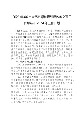 2023年XX市自然资源和规划局政务公开工作总结和2024年工作计划2023年以来,在安庆市局党组、市委、市政府的正确领导下,在市政务公开办的业务指导下, XX市自然资源和规划局始终坚持以XXX新时代中国特色社会主义思想为指导,认真贯彻落实《中华人民共和国政府信息公开条例》及中央、省、市政务公开工作要点精神,以保障高质量发展资源要素为中心,聚焦群众关注热点问题,强化重点领域信息发布,围绕基层政务公开标准化、规范化试点推广和政府信息主动公开、不断完善信息公开制度,拓宽公开领域,深化公开内容,切实加大政务公开力度,提升政务公开质量,推进政务公开工作,现将2023年具体工作情况总结如下:一、政务公开工作开展情况(一)主动公开情况。2023年,市资规局依托市政府信息公开网站主动公开政府信息数511条,主要涉及行政许可,土地出让等自然资源领域。发布时,注重公开信息的质量,及时、准确的反映工作情况,全年未出现信息发布空白月。(二)依申请公开情况。认真贯彻落实《条例》对依申请公开事项办理的新要求,修订依申请公开工作流程和时限规定,进一步完善政府信息公开指南,不断规范依申请公开工作2023年,我局受理依申请公开申请3件,均已办结。(三)政府信息管理。根据《中华人民共和国政府信息公开条例》,以及2023年政务公开重点工作任务要求,制定《市资规局2023年政务公开重点工作任务分工》,严格按照主要领导负总责、分管领导具体抓,责任到科室,落实到人头的工作机制,确保各项工作落实到位。(四)政府信息公开平台建设。严格按照市直部门政府信息主动公开目录规范进行栏目设置,明确专人负责政府信息公开平台运营维护等工作。(五)监督保障。明确1名局领导负责全局政务公开工作,及时分析研究工作难点和问题,有效加以解决。积极派员参加参加市政务公开办组织召开的政务公开工作相关会议和培训,及时了解做好政务公开工作的最新要求,不断补缺补差,持续提升我局政务公开工作水平。二、存在问题一是认识不足,知识缺乏。相关人员缺乏对政务公开工作有关知识的学习,对公开的内容、程序和原则知之甚少。二是奖惩不严,追责不够。各部门职责范围不够明确,考核奖惩不够严格。政务公开工作还没有真正纳入领导干部的政绩考核,并同评先评优、选拔任用紧密挂钩。一旦发现问题一般只是口头批评,不会动真格严肃追究相关人员的责任。三、下步工作1.强化主动发布机制。进一步组织学习《中华人民共和国政府信息公开条例》,对照条例,认真梳理我局政务公开事项,查漏补缺,编制更加科学规范的公开目录,做到应公开尽公开。2.落实组织领导制度。明确推进政务公开的目标任务。要把政务公开工作作为经常性工作列入重要议事日程,将政务公开工作纳入领导干部的年底评优中,真到做到有奖有惩。3.丰富政务公开形式。在完善我局政务公开专栏的基础上,通过973热线等媒体形式,主动公开老百姓所关心的工作。4.优化监督保障方式。通过设立投诉箱、监督投诉电话等形式,进一步扩大接受广大群众监督的力度,做到立行立改。5.加强基层政务公开。进一步落实《关于印发安徽省自然资源领域基层政务公开标准目录的通知》文件要求,加强基层政务公开的检查、指导。