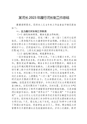 某河长2023年履行河长制工作总结根据调研要求,现将本人近1年来工作自查自评情况报告如下:一、全力履行河长制工作职责(一)强化组织领导,健全完善工作机制。一是进一步完善区、街道(镇)、村(居)三级河长组织体系。二是加强河长办力量建设和资金保障。分别成立了以区政府分管水务工作的副区长担任主任的领导小组办公室、区河湖保护中心、区级流域河长;区级财政匹配了河长制工作经费匹配42万元。三是完成2022年度区级河长制考核工作。(二)强化部门联动,形成整体合力。一是加强监督检查。今年以来,下发工作提示5件,河长令2起,整改完成2起,河长制工作交办单11件,整改完成10件,整改完成率90.9%,剩余1件正在有序整改中,确保各类水生态环境问题得到有效解决。二是加强问题督办整改。办结销号第二轮中央环保督察涉及河湖案件2件。今年收到市级河长令3起,河长制工作交办单5件,市级交办其他事项3件,均已全部完成。三是强化一河一策目标任务落实。我区市级河流涉及整改问题共11个,已全部整改完成,任务完成率100%。四是落实河湖日常管护。今年以来区河长办开展河道巡查159次,发现问题及时下发通知,及时处置。区河长办与*区河长办共同建立了跨界河湖管理保护联防联控机制。五是加强河长制宣传培训。借助世界水日中国水周节水宣传周、生态日河长大巡河活动等多形式开展河长制宣传活动进行宣传;组织相关执法部门参加阿哈水库饮用水源地联合执法专项行动;7月,通过线上线下方式,向全区73所中小学开展了防溺水宣传活动,受益学生10余万人,同时,联合辖区水库管理单位开展防溺水应急救援演练培训,并向小关湖库、黔灵湖水库周边游玩市民发放防溺水宣传相关资料,以提高市民预防溺水、珍爱生命的高度意识。(三)强化河长履职尽责,落实主体责任。一是区副总河长、副区长组织召开2023年河长会暨河长制工作部门联席会议,对2022年河长制工作进行总结,对2023年河长制重点工作任务进行安排部署;二是在区级层面实行河长会议制度及部门联席会议制度,及时研究解决河湖保护管理中的重点难点问题,组织推进河长制工作落实。今年以来,区政府组织召开涉河专题会6次,专题研究解决河道管护中的重点难点问题,确保相关工作有力有序推进。三是区级河长带头深入一线加大巡查力度,累计巡河20次,示范带动各级河长履职尽责。街道级河长累计巡河180余人次,村居级河长累计巡河1500余人次,对发现的水环境问题及时报告处置,2023年辖区河道水质持续稳定达标。(四)加强执法监管。一是今年区水政监察大队开展了防汛保安、打非治违、河湖清四乱等多次专项执法行动,共出动执法人员360余人次,及时制止处理河湖四乱问题8起。二是加大水环境违法行为执法力度。下达处罚决定书1份,对1家企业进行了立案处罚,处罚金额共计20万元。三是强化检察机关在河长制工作中的检察监督、司法介入、公益诉讼等职能,河长+检察长开展联合巡河6次,移交线索2起,区检察院下达涉河《检察建议书》2份。二、全力完成高质量任务高质量发展绩效评价指标涉及2项,分别为城镇生活污水处理率和最严格水资源管理指数。其中城镇生活污水处理率为市级指标。地下水管控、水量分配等水资源刚性约束,用水总量、用水效率方面。一是实行用水统计工作。全面监督名录库内5家取用水单位按照季度完成取用水数据填报,及时完成县级审核,前三季度行业重点取用水户填报审核完成率100%,且未出现超计划、超许可情况。二是市级分解区2023年总用水量考核目标值为1.51亿m3,根据用水统计调查系统结果,2023年前三季度各行业合计用水量为11332.61万m3,未超总量限值。三是严格执行用水计划管理,开展辖区自备水源单位计划用水年度审核与下达。四是实施关停自备水源,严格控制用水总量。按照《市城乡公共管网覆盖范围内地下水取水工程关停实施方案》要求,全面完成医科大学附属医院、海恒农副产品批发市场有限公司、打渔寨电灌站3户取水工程关停任务,注销取水许可证,注销地下水取水许可量112万m3、地表水取水许可量70万m3。五是规范取水许可日常管理,开展取用水户落实用水台账记录、计量设施运行、用户日常维护等方面取水许可监督检查9次,征收入库污水处理费2.74万元,水资源费2.1万元。三、问题不足及原因分析一是爱河护河意识仍需加强。目前,乡村两级河长占河长总数的多半,是河流保护治理的主力军和末梢神经。但一些基层河长对肩负的责任认识还不足,管河护河主体意识和履职能力不强,工作的主动性和创造性不够,河长制最后一公里还没有真正打通。一些群众参与河流管理主人翁意识还不够强,全民共管共治共享的河流保护局面尚未形成。二是河流管理保护存在薄弱环节。一些地方河道采砂管不住、管不好的问题依然存在,在中小河流偷采盗采现象时有发生,
