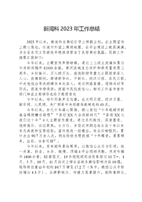 新闻科2023年工作总结2023年以来,新闻科在舆论引导上积极主动,在主题宣传上精心策划,在城市外宣上频频破圈,在平台建设上收获满满,为全县各项工作高效平稳推进营造了良好舆论氛围,现将工作简要汇报如下:今年以来,主题宣传声势磅礴。通过上三级主流媒体累计刊发新闻稿件11000余篇,黄河流域生态保护和高质量发展三周年、乡村振兴、万人助万企、疫情防控等重大主题报道深入人心。疫情期间,邀请新华社、中新社、经济日报、农民日报、中央电视台等央级媒体9次深入,通过网络直播、现场采访等形式,报道市场保供,提振市民抗疫信心。相关工作省市宣传部门和县主要领导也给予高度肯定今年以来,对外形象声名远播。在光明日报、经济日报、新华网、人民网、央广网等中央级媒体高频亮相43次。今年以来,非凡十年凝心聚德。精心策划十年砥砺开新篇奋楫扬鞭启新程喜迎XX大奋进新时代喜迎XX大我们这十年4大主题宣传报道,通过系列微信、深度报道、视频展示、访谈聚焦,全方位、多层式回顾总结全县十年以来非凡成就和宝贵经验,宣传报道一经播出,社会反响强烈,累计点击90.7万余人次,网友纷纷点赞祝福十年蝶变,累累硕果,出彩,未来可期。今年以来,发布矩阵喜结硕果。以微信公众号为引领,统一采集,抖音、头条、微博、顶端4平台同频共振,共发布稿件1800余篇,32篇图文、19条短视频阅读观看超过10万+,1月、5月、10月、11月四次上榜全省政务微信影响力前10强,矩阵粉丝量由年初的10.7万增至17.2万(其中,微信公众号粉丝增长4.3万),品牌影响力、传播力显著提升,矩阵集群化、协同化效应突显,为全县疫情防控和经济社会发展凝聚了强大网络政能量。今年以来,自媒大V通力配合。统筹乡镇搜集县域自媒体及网红抖音账号76个,召集9家较有影响力新媒体代表召开座谈会,了解掌握我县自媒体运营现状。组织自媒大V开展2022年美丽乡村建设采风活动。疫情期间,开展自媒体运营情况调研,帮助解决疫情期间面临的难题困境,动员协调他们在关键时刻积极发挥群众宣传优势、展示网络时代担当,共同为全县疫情防控添砖助力。本轮疫情期间,县域自媒体平台共发布疫情防控图文信息137篇,短视频39条。其中,由网拍摄的《Ta们》三起来主题短视频,全网播放量超过57万;摄影爱好者井宪涛拍摄的短视频《希望》,被航拍协会作为优秀作品进行全网展播。今年以来,舆论空间清朗明阔。全县舆论控导工作始终坚持正能量是总要求,管得住是硬道理、用的好是真本事网信工作总基调,抓主责、守底线、树导向、强素质,全方位、多维度提升管网治网能力,网络空间持续风清气正,为全县经济高质量发展和社会和谐稳定提供了强大的网络舆论支持、可靠的网络安全保障和有力的信息化支撑。一是舆情监控无空档。新闻科排专人、专职利用大数据24小时实时监测涉县敏感网络舆情,做好网上信息巡查,净化网络空间,夯实网络舆论引导主阵地。今年以来对全县1200余家网站及单位开展了全县网络安全核查、规范网络信息传播秩序专项治理活动、安全生产风险隐患排查、属地网站、重点自媒体账号及移动客户端基本情况摸底统计、全县关键信息基础设施保护检查、网络安全隐患自查自纠、清朗专项行动、信息系统源代码泄露风险排查等工作。二是舆情处置无延误。动态梳理可能影政治安全和社会稳定的舆情风险点,建立预警舆情信息库,及时通报相关单位和部门,一般舆情要求当天办结、当天回复;重大舆情成立由县领导牵头的临时网络舆情处置工作领导小组,统一指挥协调,研究制定舆情处置方案,最大程度将舆情风险化解在萌芽阶段。三是舆情应对有温度。坚持走好新时代网上群众路线,特别是在疫情防控期间,进一步拓展通过网络听民意、汇民智、聚民心的渠道,正确看待网络舆情和网民诉求,科学采纳网民意见、妥善处置各类诉求216件,办结率100%,在全市排名第一。今年以来,新闻科共妥善处置负面舆情326件,开展网评13万余人次,共同画好了线上线下同心圆,为党的二十胜利召开营造了清朗的舆论环境,并有效维护了对外形象,维护了全县社会大局稳定。四是强化队伍建设。为做好网络舆情控导及值班值守工作,今年6月中旬,县网络应急指挥中心正式挂牌。目前县网络应急指挥中心办公地点设在县委1003房间,已初步达到作战条件。下一步,新闻宣传和舆论引导工作将围绕四个着力,全力构建全县大宣传格局,为县域经济高质量发展营造良好舆论环境。一是着力策划重大主题宣传报道。围绕学习贯彻落实XX大、弘扬红旗渠精神、黄河流域生态保护和高质量发展4周年、乡村振兴、万人助万企等重大主题,结合优秀传统文化资源,用心策划选题,用情展示把握新发展阶段、贯彻新发展理念,加快推进高质量发展,人民群众获得感幸福感安全感不断增强的亮点成效。动员和激励全县广大干部群众使命担在肩,奋楫向前行,为加快建设现代化国家中心