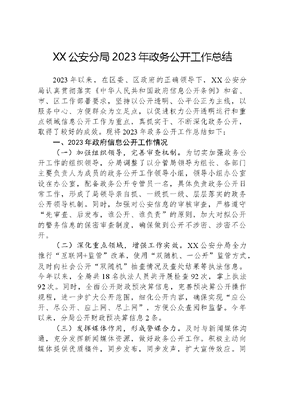 XX公安分局2023年政务公开工作总结2023年以来,在区委、区政府的正确领导下,XX公安分局认真贯彻落实《中华人民共和国政府信息公开条例》和省、市、区工作部署要求,坚持以公开透明、公平公正为主线,以服务中心、方便群众为立足点,以促进权力公开透明运行和重点领域信息公开工作为重点,真抓实干、不断深化政务公开,取得了较好的成效。现将2023年政务公开工作总结如下:一、2023年政府信息公开工作情况(一)加强组织领导,完善审查机制。为切实加强政务公开工作的组织领导,分局调整了以分管局领导为组长、各部门主要负责人为成员的政务公开工作领导小组,领导小组办公室设在办公室,配备政务公开专管员一名,具体负责政务公开日常工作,形成了局领导亲自抓、一级抓一级、层层落实的政务公开领导机制。同时,加强对公安信息的审核审查,严格遵守先审查、后发布,谁公开、谁负责的原则,加大对拟公开的警务信息的保密审查制度,确保做到公开不涉密、涉密不公开。(二)深化重点领域,增强工作实效。XX公安分局全力推行互联网+监管改革,使用双随机、一公开监管方式,及时向社会公开双随机抽查情况及查处结果等执法信息。今年以来,全局共18名执法人员共开展检查92次,掌上执法92次。同时,全面公开财政预决算信息,完善预决算公开操作规程,进一步扩大公开范围,细化公开内容,确保实现应公开、尽公开、应上网、尽上网,方便公众查阅和监督。今年以来,分局公开财政预决算信息2条。(三)发挥媒体作用,形成警媒合力。及时与新闻媒体沟通,充分发挥新闻媒体资源,做好政务公开工作。积极主动向媒体提供优质稿件,同步发布,同步发声,扩大宣传效应。同时,大力推进互联网政务信息发布平台建设,建设和运用好官方认证的XX警方新媒体公众号。线上听取群众意见建议,线下解决群众烦心揪心,做到媒体互动日常化、常态化、良性化,今年以来解决群众问题56条。今年以来,推送发布新媒体410条,营造了良好的宣传氛围。二、政府信息主动公开情况2023年,我局主动公开政府信息共98条。主要侧重以下几个方面:一是公布内部机构设置及其相关工作职能;二是工作动态及时发布;三是重点领域户籍相关政策对外公开;四是文件及政策解读及时公开。三、政府信息依申请公开情况依据政府信息公开工作规程,优化完善政府信息公开申请办理流程,畅通信函申请、互联网申请、当面申请渠道,加强依申请公开规范化、痕迹化管理,做好答复工作。设立政府信息公开电话及电子邮箱,接收社会公众对信息公开工作的咨询及意见建议。今年以来,收到依申请公开申请0件。四、申请行政复议、提起行政诉讼情况我局没有发生针对本部门有关政府信息公开事务的行政复议案;没有发生针对本部门有关政府信息公开事务的行政诉讼案。五、下一步工作计划(一)进一步加强政务公开日常管理。按照公开为原则,不公开为例外的总体要求,定期维护好部门政府信息公开专栏,聚焦政策解读,深化重点领域信息公开。不断扩大政府信息公开内容和范围,保证公开信息的完整性和准确性,保证广大市民的知情权。(二)进一步加强政务公开信息质量。加强对《中华人民共和国政府信息公开条例》的学习,结合公安业务,有针对性地发布政策解读、规范性文件、户籍服务等方面信息,把涉及人民群众切身利益的各类事项作为信息发布重点,做到多平台、高频次发布公安政务信息,确保政务公开信息有效实用。(三)进一步加强政务公开制度建设。学习借鉴其他机关政府信息公开工作的先进经验,与公安工作实际紧密结合起来,不断完善创新工作机制。努力开创政务公开的公安特色,把分局政务信息公开工作不断推向规范化、制度化的新局面。XX市公安局XX分局办公室2023年12月27日