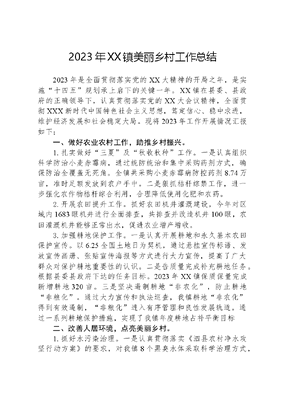 2023年XX镇美丽乡村工作总结2023年是全面贯彻落实党的XX大精神的开局之年,是实施十四五规划承上启下的关键一年。XX镇在县委、县政府的正确领导下,认真贯彻落实党的XX大会议精神,全面贯彻XXX新时代中国特色社会主义思想,笃定信心、稳中求进,维护经济发展和社会稳定大局。现将2023年工作开展情况汇报如下:一、做好农业农村工作,助推乡村振兴。1.扎实做好三夏及秋收秋种工作。一是认真组织科学防治小麦赤霉病,通过统防统治和集中采购药剂方式,确保防治全覆盖无死角。全镇共采购小麦赤霉病防控药剂8.74万亩,准时足额发放到农户手中。二是狠抓秸秆综禁工作,进一步强化农作物秸杆综合利用,合理降低使用化肥和农药。2.开展农田提升工作。抓好农田机井灌溉建设,今年对区域内1683眼机井进行全面排查,共排查并改造机井100眼,农田灌溉机井能够正常出水,促进农业增产增收。3.加强耕地保护工作。一是认真开展耕地和永久基本农田保护宣传。以6.25全国土地日为契机,通过悬挂宣传标语、发放宣传画册、张贴宣传海报等方式进行大力宣传,提高了广大群众对保护耕地重要性的认识。二是告质量完成补充耕地任务。根据县委县政府下达的任务目标。2023年XX镇保质保量完成新增耕地320亩。三是坚决遏制耕地非农化,防止耕地非粮化。通过大力宣传和执法巡查,我镇耕地非农化得到有效遏制,非粮化进入有序管理和良性发展轨道。通过一系列耕地保护措施,实现了我镇年度耕地占补平衡目标二、改善人居环境,点亮美丽乡村。1.抓好水污染治理。一是认真贯彻落实《泗县农村净水攻坚行动方案》的要求,对我镇8个黑臭水体采取科学治理方式,消除污染来源,建立长效机制。目前治理已见成效,预计明年底全面整治完成。二是认真开展清河行动。我镇动员村级河长、巡河员、公益性岗位,开展清河行动。重点对老濉河XX段水面的枯死水体,漂浮物进行清理,全镇今年共清理9.2km河道,垃圾840m³、枯死水草1565m³。2.抓好农村人居环境整治,我镇组织开展农村人居环境专项整治活动,重点对全镇村庄全域环境进行集中整治,着重解决路边、沟边、塘边杂草丛生,村庄秸秆乱堆乱放、生活垃圾乱倒乱放、房前屋后乱堆乱放,环境卫生脏、乱、差等突出问题,增强群众环境健康意识。3.开展最美家庭评选活动。在全镇范围内评选出最美家庭,以布局美、清洁美、绿色美、家和美为环境标准,以遵纪守法、诚实守信、移风易俗、互敬互爱为家风标准评选出全镇115个自然庄共230户最美家庭,以小美庭院扮靓大美乡村,助力宜居宜业和美乡村建设。