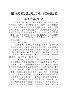 县财政局国资委金融办2023年工作总结暨2024年工作计划2023年是党和国家历史上极为重要的一年,在县委、县政府集中统一领导下,县级财政、国资、金融部门深入贯彻党的XX大精神,坚持稳中求进工作总基调,完整、准确、全面贯彻新发展理念,加快构建新发展格局,靠前实施各项财政政策,推动经济总体回稳向好。截至9月31日,全县一般公共预算收入XX万元,同比增收XX万元,增长125.3%。一般公共预算支出XX万元,同比下降9.0%,发展质量稳步提升,保持了经济社会大局稳定。一、工作开展情况(一)保基本、兜底线,有效增进民生福祉。坚持以人民为中心的发展理念,统筹人民需要和财力可能,持续加强基础性、普惠性、兜底性民生建设,保障重点民生支出,截至9月31日,全县民生支出XX万元,占比77.7%。教育投入XX万元,医疗卫生与计划生育投入XX万元,社会保障和就业投入XX万元,公共安全支出XX万元。(二)保资金、助三农,深入推进乡村振兴。牢固树立新发展理念,积极发挥转移支付、财税政策等作用,整合涉农资金XX万元。对实际种粮农民发放补贴179万元。财政衔接推进乡村振兴补助资金规模继续增加,衔接资金支出XX万元。(三)明目标、抓落实,深入落实财税任务。深入贯彻落实县委十三届五次全会精神和全年财税工作任务,狠抓财税增收工作。一是初步清理家底。对全县2019年至今851个项目税收情况进行了全面梳理,进一步掌握近年项目实施后的税收收入流向。二是压实各单位责任。组织县税务、自然资源、9个乡镇和7家银行签订了财税目标任务责任书,明确每项任务责任单位、人员、时限、标准等。三是执行红黑榜制度,强化责任落实。实行周调度、月分析、季通报制度,形成任务部署、推进实施、考评验收的工作闭环,制定印发《XX县区推动财税工作红黑榜奖惩工作机制(试行)》,并对工作情况进行全县通报。四是强化信息共享。结合各乡镇的发展规划和目标,每月将税收收入完成情况分别推送至各乡镇。五是加强人员培训。将税收业务知识印成宣传册在人大、政协全会上进行了发放宣传;组织各单位、乡镇农场领导和工作人员开展财税工作培训;深入勐满镇、勐捧镇、勐仑镇、易武镇、象明对非税收入征收管理和税收业务基础知识进行培训,切实增强了相关人员协税护税意识。(四)明责任、强监督,严肃规范财经纪律。一是强化会计管理。组织开展会计人员继续教育,财会人员业务及财经纪律培训,安排人员深入勐满镇、县农垦局讲授财经纪律;做好会计人员信息采集和审核,完成信息采集1455人,审核通过1317人;发放会计专业资格证书57张;做好代理记账资格审批、年度备案和监管服务,现场解答咨询5次,电话咨询40次,审核批准代理记账机构2家,注销2家,督促21家完成年度备案;组织全县157家预算单位开展2022年度行政事业单位内部控制报告编报及抽查检查。二是严肃财政监督。深入推进清源行动,以及财经纪律整治;对XX县集中式饮用水源地曼旦水库周边农村环境综合整治项目进行监督检查并对整改结果进行跟踪;对4家代理记账机构开展部门联合双随机、一公开监督检查、对2家预算单位开展2023年会计信息质量监督检查,对23家代理记账行业开展违法违规专项整治;对188家预算单位开展2022年决算公开监督检查,对183家预算单位开展2023年预算公开监督检查;开展2022度财政收支真实性自查自纠;组织对全县预算单位开展2023年预决算公开工作考核。三是深化绩效管理。组织全县61个预算部门完成2023年部门整体绩效目标的填报审核;组织开展2023年1-6月和1-9月运行监控填报、审核,并进行重点监控审核;组织预算单位对2022年部门整体和项目支出开展绩效自评,并进行抽查审核,筛选2022年10个重点项目和部门支出作为财政绩效重点评价对象开展重点评价;对2023年3个重点项目开展绩效评估并应用于预算安排;将重要成果报送政府等部门,推进问题整改、管理提升,开展结果应用;面向全县行政事业单位开展2次绩效管理培训;组织对全县一级预算单位开展2023年绩效管理公开考核。(五)促合作、防风险,金融市场绿色健康发展。一是充分发挥桥梁作用深化政银企合作。走访16家企业,提供融资贷款等金融政策上门服务;组织银行业金融机构与县级部门、平台公司开展4次座谈会。成功协商解决了供销社资产管理中心贷款到期调头、田野公司中长期贷款业务、天邦公司和旭东公司融资贷款事宜。二是切实防范金融风险。组织成员单位通过走进村寨、网格区、机关等累计开展防范非法集资宣传教育活动210场次,覆盖群众4余万人次,发放宣传资料1.60万余份,发送风险提示函24条;强化日常风险排查,共摸排了投资类公司、农业科技公司、金融类字样公司等各类市场主体126家;着力整治行业乱象,开展了伪金交所、打击解债类非法集资等专项整治活动;加强对