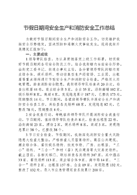 节假日期间安全生产和消防安全工作总结为做好节假日期间安全生产和消防安全工作,切实维护我街安全形势稳定,坚决预防和遏制火灾事故发生,现将我街开展情况汇报如下:一、主要成效1.领导带队检查。为认真贯彻落实上级工作部署,切实做好节假日期间各项安全防范工作,结合我街辖内当前安全形势,由街党工委书记、街道办事处主任,各分管领导带队到辖内商业综合体、娱乐场所、劳动密集型生产经营场、工业园、出租屋等重点场所进行节前安全生产和消防安全检查,严格用火用电管理,排查消除安全隐患,我街领导带队检查共20余次,检查出租屋44栋,商业综合体3家,企业35家,沿街商铺102家,娱乐场所8家,商超4家,发现隐患累计187处,已整改173处,限期整改14处。节日期间,各值班领导带队开展安全生产和消防安全检查工作,共检查各类场所68家,发现隐患82处,已整改78处,限期整改4处。2.安全夜查行动。每晚值班领导带队开展消防安全夜查行动,节日期间,值班领导带队检查共8次,检查出租屋22栋,沿街商铺23家,酒店2家,娱乐场所8家,商超3家,发现隐患累计38个,已整改38个。3.节日安全检查。节假期间,我街深化消防安全重大风险隐患大检查大整治,严格排查人员密集场所、高层公共建筑、商业综合体、餐饮娱乐场所、批发市场、厂房、出租屋、三小场所、三合一和村(居)民自建房等火灾易发场所。截止目前,各相关部门、联社排查各类场所347家,其中酒店33家、餐饮场所113家、商业综合体9家、商市场14家、三合一场所2家、出租屋157栋、企业19家,发现隐患132处,整改了132处。录入市应急管理巡查系统累计200宗。4.危化企业专项检查。节假期间,根据区应急管理局《转发〈市应急管理局关于加强节假日重点时段危险化学品化工医药烟花爆竹企业安全生产管控的通知〉》要求,综合执法办值班人员到辖内加油站进行安全检查,共出动10人次,检查5个加油站,暂未发现安全隐患问题,现场要求各加油站做好节假日期间安全防范、值班值守工作,严格落实24小时带班制度,并加强设施设备日常维护管理。5.强化微站应急值守。为全力做好节假日期间各项执勤备战工作,确保社会面火灾形势和队伍管理双稳定。节前,我街组织辖内微型消防站进行节前应急拉动演练,开展车辆器材装备安全检查及调试维护保养工作。节假期间,各微型消防站,严格落实24小时值班值守,每日调派前置执勤力量9支,消防车9辆,共计54人,确保一旦发生警情,灭火救援力量第一时间能够拉得出、冲得上、打得赢。6.强化安全宣传教育。根据上级关于节假日期间宣传工作的有关要求,我街积极发动辖区各有关单位,广泛利用各类户外屏幕、广播电视,每天滚动播放节假日火灾防范消防公益广告或警示教育片,提醒市民群众时刻注意消防安全意识。我街累计播发消防公益广告310条次,发送宣传单张500余张。二、下一步工作我街将持续保持安全隐患排查整治高压态势,一是广泛深入辖内各类经营场所,开展复工复产安全生产和消防安全检查指导,指导单位做好复工复产期间安全管理各项工作,督促单位提高对各类事故的防御能力,深入排查安全隐患,进一步夯实复工复产企业的安全根基。二是加强宣传警示教育。持续转发安全每日提醒,定期推送火灾事故和风险警示片到安全生产和消防安全工作群、企业群、居民群等,加大宣传,提升群众的消防安全意识;每月梳理2类典型案例进行通报,警示教育引导经营单位严格落实主体责任,及时消除了事故隐患,做到举一反三。三是结合近期消防形势,深入推进消防专项行动。深刻吸取近期各类火灾事故教训,持续开展好各项消防安全大排查大整治行动。加大对重点场所的消防安全隐患排查整治力度,加强对三合一、电动自行车违规停放、充电等消防违法行为的执法力度,对查处存在突出火灾隐患和消防违法行为的场所保持高压态势。