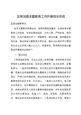 区局党委主题教育工作开展情况总结区委主题教育办:全区主题教育开展以来,我局党委高度重视,认真加强主题教育工作组织,坚决以高的站位、大的力度、严的标准、实的举措,扎实开展理论学习、调查研究、推动发展、检视整改各项任务,推动系统主题教育走深走实,推动XXX新时代中国特色社会主义思想入脑入心入行。根据安排,现将我局党委主题教育开展情况总结如下:一、做法成效1.加强组织领导,在见行见效上全程把握。始终把抓实党的领导作为首要政治任务,加强全过程领导、全方位指导、全覆盖参与。一是及时部署推动。及时传达全区主题教育培训会精神,迅速在全系统部署启动主题教育工作开展,明确各级书记责任,严明工作开展纪律,推动系统各级组织和全体党员把主题教育责任抓在手里、扛在肩上。二是深入动员参与。努力抓实全员参与,针对薄弱环节,为每个退休党支部配备党建联络员,协助支部负责人抓好主题教育组织实施;对年老体弱党员占主体的托管党员,采取上门、寄信、发短信、发微信等方式,推动全体党员始终跟进学习。三是详细制定方案。围绕上级要求、党委实际、党员需求,分层次、分重点、分领域,以求真务实的态度,反复研究制定了党委主题教育工作计划,绘就高质量开展主题教育的施工图。四是加强沟通调度。坚持在区委主题教育联络组的指导下同题共答、同频共振,准确领会主题教育开展要求,全面跟进和规范各项活动开展,利用集中学习的机会,定期分析研究面上工作推进情况,推动主题教育走深走实。2.强化理论学习,在学深悟透上持续发力。以全员参与、重点突破为目标,推动系统党员领导干部、普通党员深入学习领会XXX新时代中国特色社会主义思想的精神实质。一是抓实重点对象。紧紧抓住局领导班子和基层党支部两个重点,分别制定学习计划,及时报送每期活动计划,确保规定任务一个不少、学用结合不脱节、安排紧凑有实效,有力抓实重点学习教育和全员学习教育。二是突出领学示范。将局管中层干部和各支部负责同志纳入局领导班子集中学习扩大对象,每月开展专题学习共*次,领导班子成员分别作学习交流发言,分享学习体会、交流思考认识、畅谈工作打算。局党委主要领导和分管领导分别围绕相关专题开展辅导授课各*次。三是把牢学习质效。精心组织每期集中学习,深入学习领会XXXXXX对有关工作的重要指示和重要论述,开展交流研讨*次,邀请专家辅导授课*次,组织前往*等红色革命旧址现场研学*批次。开展督促检查,局党委有关领导、局组织人事科不定期前往各支部了解支部主题教育开展情况和普通党员学习情况,及时提示存在问题并督促改进。3.深入调查研究,在破解难题上找准突破。只有深入基层、直扑一线,才能明了问题、找准症结、提实对策,才有可能产生推动发展的真知灼见。一是深入走访调研。围绕摸清实情、了解变化、发现经验、排查难题、破解发展瓶颈,局领导班子成员深入弘扬四下基层优良作风,以现场走访、召开座谈会等形式分头开展调研,结合各自领域工作明确调研课题各*项,坚持边工作边调研,持续深入推进调查研究。二是树立典型启引。深入分析总结当前工作中的突出经验和教训,选取树立局领导班子正面、反面典型案例各*条,召开班子专题会议实事求是分别剖析经验启示和危害教训、分别总结推广举措和整改举措,努力以典型经验引领启示今后工作高质量开展。三是加强成果转化。牢牢把握调查研究的针对性,坚持目标导向,以严和实的工作作风,把问题找准、把措施找实,形成一篇篇高质量的资政辅政报告。聚焦影响发展的重大问题和关键领域,狠抓调研成果转化运用,把调查研究有关成果切实转化为推动发展的政策方案、举措办法,形成建议*条,制定政策性文件*件。4.大力推动发展,在担当作为上争做贡献。学习的目的更在于运用,只有思想上的解放,才有行动上的坚决;只有行动上的坚决,才有壮阔蓝图的顺利绘就。一是开展专题研讨。围绕XXXXXX关于江苏工作、关于树立和践行正确政绩观等重要指示精神开展牢记嘱托、感恩奋进,挑大梁、勇登攀、走在前专题讨论,进一步领会精神、明晰差距、树立方向、坚定决心,建言献策*条。二是推进产业强区。围绕区委提出的*发展布局,坚决扛起*发展主责,大力实施*行动计划,对照目标任务,强化领导统筹、指导协调、考核监督一体推进,累计梳理项目*个,总投资*亿元,产业人才*名。三是破除发展约束。针对发展粗放、土地利用效率不高制约了项目落地的情况,把闲置低效工业用地盘活利用作为当前一项重点攻坚项目,制定出台实施方案,综合推出六种模式鼓励低效工业用地二次开发,提高亩均产出效益,全年实际盘活用地*亩以上。5.严格检视整改,在对标对表上纠偏革新。不是每名党员进入队伍后都能始终提升党性修养、永葆先进性,只有时常深入开展检视整改,才能做到大事上不迷糊、小事上守好节。一是开展专项自查。局领导班子以高度的政治自觉,坚持严和实的标准,深入开展不担当不作为问题
