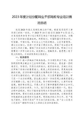 2023年度计划分配转业干部岗前专业培训情况总结我是2023年度从X部队转业的干部,根据X退役军人事务部门的统一安排,于2023年10月12日至2024年1月12日,在X党校参加X市计划分配军队转业干部岗前专业培训。为期近3个月的培训圆满结束,回顾培训,有国际国内形势分析,有国情、市情介绍,有社会主义市经济概论、公务员管理等。通过这次培训,我进一步丰富了理论知识,提高了对当前全市各项工作的了解,增强了抓好本职工作的紧迫感,明确了今后需要进一步努力的方向,收获颇大、感触很多,我思想上有了较大的转变,自身素质得到全面提升。一、收获感悟(一)进一步端正了转业态度。作为部队转业干部,为祖国的国防事业做出自己应有的贡献。面对转业,我也曾一度的难受过、彷惶过,但是这次的培训,我受益非浅。正确认识这次军转干部培训的重要意义,既是上岗前的培训,更是角色转换的关键,应该珍惜和把握这次难得的学习机会。记得部队一位老首长曾经说过:学习就是工作,而且是更重要的工作。学习是一个永恒的课题,因此我从培训一开始思想上就高度重视,自觉调整心态,端正学习态度,集中时间和精力,认真听好每堂课,做好每次笔记,尽最大努力了解和掌握更多的专业知识,提高自己的综合素质。今天,我们还是年富力强的一代,是社会的中流砥柱,所以不能有船到码头车到站的思想,应该重新振作精神,要把在部队长期养成的铁一般的纪律,过硬的思想和较高的政治素质和文化素质,带到地方的工作之中,把退伍不褪色、退役不退志作为自己的座右铭,把全心全意为人民服务继续作为自己工作的出发点和落脚点。(二)进一步展示了良好形象。作为部队培养的干部,思想上把国家和人民利益看成高于一切,把军人形象看成重于一切。脱下绿军装的那一天起,无论在哪个工作岗位上,我们应自觉保持发扬军人优良传统,保持优良作风,展示军人优秀品质。培训中,家里距培训地点比较远,本人能够克服困难,自觉遵守培训班的有关规定,坚持按时到课参加学习,没有请过一次假,也没有迟到、旷课和早退现象。同时,能够积极配合组长和班主任的工作,积极参加小组交流活动,自觉服从管理。尊重老师,团结参训学员,谈吐得体,举止大方,注意保持军人良好形象。(三)进一步拓宽了工作视野。由于我们长期在军队工作,对地方政府职能结构与运作、公共行政管理、国家公务员制度、公务员行为规范、管理心理学等专业知识,有的一无所知,有的一知半解。为了让军转干部尽快地掌握为履行职责所必须的基本知识,为今后工作做好准备,X退役军人事务部门科学制定教学计划,专门安排理论层次高、工作经验丰、研究成果深的专家教授给我们授课。培训中,我能够严格要求自己,坚持把学习作为自我完善和提高的重要途径。既认真聆听各位专家、教授的辅导讲座,又广泛利用课余时间通读培训教材,通过刻苦努力,使我对这些专业知识有了一定的认识和理解,自身素质得到进一步提高,为今后深层次学习和运用专业知识指导实际工作打下了较好的理论基础。XX老师的《全面从严治党》让我明白了党要管党,从严治党,全面从严治党永远在路上。XXX老师的《公共管理基本理论》让我懂得了服务形政府就是要把群众当做顾客,把自己当做服务员,倾听意见,明确标准,才能实现改善公共服务质量的目的。通过学习,我的思路打开了、视野变宽了。(四)进一步增强了发展信心。军旅生涯,成就了我不怕挑战、坚韧不拨、顽强拼搏的性格。尽管如此,封闭的部队生活使我对社会经济发展情况以及其它社会情况了解得不够透彻,总是会以为自己不能很好的融入社会,服务社会。在培训班里,专家教授们多次从能力培养、应急管理、经济发展等方面,对我们进行了解惑、指导,帮助我对社会对新岗位有了全新的了解和认识。我始终坚持把这次培训作为动力,作为新的起点,作为充电器和加油站。在部队工作期间,对经济发展规律、公务员行为规范等各方面情况知之甚少,通过参加培训学习,特别是听取了专家学者的辅导讲课后,加深了对地方经济发展情况和地方政府的运作情况的了解,不仅扩大了自己的知识面,而且更新了观念,清晰了思路,创新了思维,增强了下一步到地方做好工作的信心。我明白了,要有一种清零的心态,正确的定位,心甘情愿、脚踏实地当好一名新兵的态度,努力岗位知识、勤奋工作,融入新的集体和团队。要不断的跟上时代发展进程,及时的用新型理论知识武装头脑,才能真正成为一名合格人民公仆。(五)进一步树牢了法治思维。依法治国,建设社会主义法治是我国的基本方略。在当今时代,不懂法是无法适应形势发展需要的,作为一名机关工作人员,必须应该加强学法的力度,要做到真学、真懂、真用。只有时刻把人民放在心上,才能真正做到为人民服务,才能更好密切干群关系,密切党群关系。在本次培训过程中,法律法规是其中一个重要的学习内容,学习了依法行政论、综合执法能力培养、公务员法释义等内容,强化了自