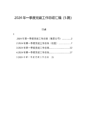 2024年一季度党建工作总结汇编(5篇)目录1.2024年第一季度党建工作总结(集团公司)..22.2024年第一季度党建工作总结(社区)73.2024年第一季度党建工作总结.124.2024年第一季度党建工作总结.175.2024年第一季度党建工作总结212024年第一季度党建工作总结(集团公司)2024年第一季度公司党委深刻把握增强四个意识、坚定四个自信、做到两个维护这一主线,高标准贯彻落实党的政治建设要求,推动公司安全稳定发展。一、坚定政治信仰,始终在思想上、政治上、行动上与党中央保持高度一致。始终坚持将党的建设作为发展的第一课题,从思想上、行动上始终与党中央保持高度一致。一是坚持用党的科学理论武装头脑。党委将XXX新时代中国特色社会主义思想、XXXXXX系列重要讲话精神作为第一议题进行学习、将党内法规条例、党的XXX精神作为必学议题深入学,第一季度学习系列讲话精神10份。系统学习《中国共产党支部工作条例(试行)》《中国共产党党组工作条例》《中国共产党农村基层组织工作条例》《中国共产党国有企业基层组织工作条例(试行)》《中国共产党党和国家机关基层组织工作条例》《中国共产党党员教育管理工作条例》等重要文件、条例。二是坚定执行党的政治路线,坚决站稳政治立场。始终坚持以党的政治路线为遵循,统筹推进债务化解、产业发展、安全生产、信访维稳,自觉对标党的政治路线,有人。始终围绕发展、生态、安全守好三条底线,及时贯彻落实中央、x各项决策部署和安排。党委牵头,对各类意识形态阵地进行督文可居文库——海量学习资料,手机电脑均可下载www.wenkeju.com查检查,党委负责人严格落实意识形态一把手责任制,组织召开意识形态专题调度会x次,专人负责意识形态和网络舆情监测,做到发现一起处理一切,确保了党的政治路线在公司高标准执行、严要求落实。二、坚持政治领导,切实做到政治上坚决维护、组织上自觉服从、行动上紧紧跟随。始终坚持党建治企的理念,始终做到政治上坚决维护、组织上自觉服从、行动上紧紧跟踪党中央。一是严格执行党内法规。严格按照《关于新形势下党内政治生活的若干准则》《中共中央政治局关于加强和维护党中央集中统一领导的若干规定》等党内法规,因地制宜落实好中央决策部署,做到讲规矩、讲政治。二是严格执行党的领导。始终坚持党委把方向、做决策、保落实的作用、不断强化公司内控管理、产业运营、公司文化等建设;严格落实三重一大议事前置,坚持民主集中制。三、提高政治能力,自觉担负起新时代历史使命、时代责任。致力于党的组织体系、工作体系、议事体系建设,不断提高政治能力。一是组织体系更加完善。以党建驱动扁平化管理、在一线产业板块缩减层级、提高效能,将党建工作与内控管理、债务风险防范、产业运营等持续深度融合、有效衔接,推动公司产业逐步实现扭亏为盈、国有资产进一步盘活优化,干部职文可居文库——海量学习资料,手机电脑均可下载www.wenkeju.com工政治判断力、政治领悟力、政治执行力得到全面提高,党在公司经营发展中的引领作用更加突出。二是工作体系更加规范。在工作体系上把工作理念从抓党建的封闭式向党建+的开放式转变;把工作格局从抓党建的单兵团向统揽改革发展全局的大党建转变;把工作方式从经验型向专业型转变,使党建成为公司发展生机勃勃的活力源和动力舱。及时结合实体化转型发展实际,与时俱进修订《三重一大事项议事决策制度》《党委委员主体责任落实实施方案》等x项党建制度,为实体化转型发展提供了强有力的制度保障。三是议事体系更加健全。严格落实三重一大事项议事前置,第一季度召开党委会x次,引导股东会、董事会、监事会和经理层依法行使职权,履行党委管干部聚人才、建班子带队伍、强监督正风气职责,推动各类重大事项决策科学化、规范化、程序化。四、加强政治生态建设,推动形成干部清正、公司清廉、政治清明的常态化局面。公司认真贯彻执行党章、廉洁自律准则和纪律处分条例,用好监督执纪四种形态,严格落实中央八项规定精神,持续开展六项严查和领导干部党风廉政画像评价工作,逢节必提醒必检查,进一步推动纪律要求落实落地。一是落实党风廉政建设。第一季度召开党风廉政建文可居文库——海量学习资料,手机电脑均可下载www.wenkeju.com设专题会x次、安排部署党风廉政建设工作x项,党委到产业一线督查安全生产、党风廉洁、产业运营、内控管理等工作x次,确保了旗