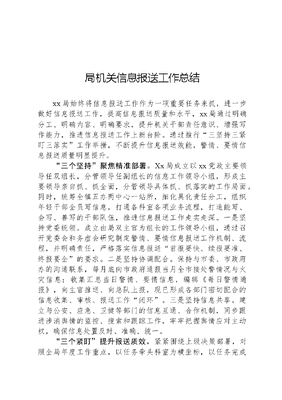 局机关信息报送工作总结xx局始终将信息报送工作作为一项重要任务来抓,进一步做好信息报送工作,提高信息报送质量和水平,xx局通过明确分工、明确内容、明确要求,提升机关干部责任意识、增强写作能力,推进信息报送工作上新台阶。通过推行三坚持三紧盯三落实工作举措,不断提升信息报送效能,警情、要情信息报送质量明显提升。三个坚持聚焦精准部署。Xx局成立以xx党政主要领导任双组长,分管领导任副组长的信息工作领导小组,形成主要领导亲自抓、抓全面,分管领导具体抓、抓落实的工作局面。同时,统筹全镇五办两中心一站所,细化具化责任分工,组织年轻干部全员写信息,打通各科室各项业务流程,打造能写、会写、善写的干部队伍,推进信息报送工作走实走深。一是坚持党委统领。成立由局双主官为组长的工作领导小组,通过召开党委会和务虚会研究制定警情、要情信息报送工作机制、流程,并明确责任,严格落实信息报送首报要快、续报要准、终报要全的要求。二是坚持协调配合。保持与市委、市政府办的沟通联系,每月底向市政府通报当月全市接处警情况与火灾信息;收集汇总当日警情、要情信息,编辑《每日警情通报》,向主官推送、向总队上报,现已形成各部门密切配合的信息收集、审核、报送工作闭环。三是坚持信息共享。建立与公安、应急、卫健等部门的信息互通、合作机制,同步跟进涉消舆情的监控、搜索和跟踪工作,牢牢把握舆情应对主动权,确保信息处置及时、准确、统一。三个紧盯提升报送质效。紧紧围绕上级决策部署,对照全局年度工作重点,以任务牵头科室为横坐标,以任务完成时限、重要时间节点为纵坐标,建立重要信息选题台账。各科室对照选题台账,以县委县政府关注的、思考的、有待了解的问题为切入点,把信息报送要求作为选题的风向标,抓住工作闪光点,总结提炼新亮点,提供及时、全面、高效、优质的信息服务。一是紧盯示教培训。先后邀请市委网信办、市公安局指挥中心、xx师范大学等单位专家、教授围绕信息报送方面内容进行专题授课,提升全市指战员信息报送能力水平。二是紧盯对标看齐。选派专人参加全市党委系统值班和紧急信息报送工作培训班,学习政府职能部门信息报送方面成功经验,建立互动学、互动讲、互动评信息报送工作座谈交流机制。定期组织调度信息助理及指挥中心接警员开展重大警情信息报送总结讲评。三是紧盯学习互助。将文秘人员能力提升纳入局文秘培训班和办公文秘岗位三带互助机制(局办公室带大队文秘人员、部门内勤带机关文秘人员、大队内勤带所属文员),通过培训考核倒逼文秘人员保持本领恐慌,提升文字功底。三个落实保障工作推进。明确信息报送行文要求、内容要求和规范格式,提高撰写人员的政务敏感度和汇编文笔能力。严格落实信息审核三审三校制度,严把政策关、内容关、文字关、时效关,确保报送信息方向正确、内容精确、文字准确。坚持落实领导审核制,上报信息必须经分管领导审核,将信息进行筛选、提炼和精华,做到表述清晰、内容精炼、亮点突出。一是落实工作督办。定期对文秘信息工作和警情、要情信息报送情况通报讲评,做到每月一通报,季度一小结。落实督办整改,尤其对涉及人员伤亡火灾数据录入和信息报送逐级审核,严格把关,狠抓督促。二是落实信息审查。狠抓信息甄别、收集、核实、报告等重点环节,确保信息报送流程规范、要素完整。信息报送时,紧盯事故发生时间、地点、出动力量、伤亡情况等要素,持续跟进事态进展,落实续报、总结报要求。三是落实即时即报。严格落实1小时信息报送要文可居文库——海量学习资料,手机电脑均可下载www.wenkeju.com求。各地重大警情、突发事件必须第一时间向局指挥中心报告,严格落实向总队事发20分钟内口头报告,1小时内书面报告的要求,经主要领导审核后,事发40分钟内书面报告市委、市政府。坚决杜绝迟报、瞒报、漏报现象发生。文可居文库——海量学习资料,手机电脑均可下载www.wenkeju.com