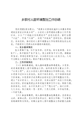 乡农村人居环境整治工作总结党的XXX报告提出,统筹乡村基础设施和公共服务布局建设宜居宜业和美乡村。自农村人居环境综合整治工作开展以来,乡以干部能力作风建设年活动为抓手,紧盯治理六乱、开展六清、实现四起来目标任务,因地制宜,务实创新,推动农村人居环境整治工作取得阶段性突出成效,不断提升人民群众的幸福感和满意度。一、全乡基本情况X乡隶属于X,位于X东部,北邻X,南与X相望。全乡X户),其中脱贫户X户X人,国土面积X平方公里,耕地面积X亩,草场总面积X万亩。全乡经济总收入达X万元,人均可支配收入达到X元;粮食产量达到X吨。其二、工作开展情况(一)抓统筹谋划,促人居环境整治布局更优。乡党委、政府高度重视人居环境整治工作,始终将其作为重点工作、头号工程,成立乡农村人居环境整治工作领导小组,形成乡党委书记和乡长亲自抓,包村干部负责抓,村干部具体抓的工作局面,乡党委班子成员蹲点各村攻坚人居环境整治工作,建立专片有专人、专人负专责、专责必落实共抓工作机制,结合实际,因村施策提出具体实施方案和工作计划,倒排工期、压茬推进,各村、各片区负责人立下愚公志,持之以恒、久久为功,真正做到一月一变样,三月大变样、半年有形象、一年新气象。(二)抓宣传教育,促人居环境整治氛围更浓。坚持逢会必讲、逢事必提,充分利用各种会议、微信工作群、下乡督导、实地调研等为契机,向群众宣传人居环境整治工作的重大战略意义和重要现实意义。持续加大宣传力度,通过悬挂横幅、张贴标语、入户宣传:全方位、立体式、多种形式广泛宣传,让群众在耳潘目染中不断增强生态保护意识,逐步实现群众要我于净到我要干净的思想蜕变,全面掀起农村人居环境整治的新高潮。(三)抓载体创新,促人居环境整治抓手更足。将人居环境整治同乡村振兴、新时代文明实践等工作一体推进。多次召开人居环境整治部署会,传达上级文件精神,对厕所革命生活垃圾治理村庄长效管护等内容详细安排,因地制宜制定工作举措,同时以积分制管理为重要抓手,按季度开展积分制评分工作,大大提高农牧民群众的积极性和主动性。同时,九龙乡新时代文明实践所结合实际指导各实践站制定村规民约,规范群众不文明行为,从人人有责变成人人尽责,从享受者变成守护者,多措维护村庄整洁常态化。(四)抓综合治理,促人居环境整治效果更好。用好用话人居环境整治工作十佳乡镇奖励资金,在好上进好,坚持月卫生评比的基础上,大力开展道路拓宽、墙体美化、美丽庭院评选等专项整治行动,循序渐进改善农村人居环境,宜居宜游XX印象初步彰显。(五)抓制度建设,促人居环境整治机制更全。坚持当下治与长久立相结合,探索实施五有机制保障即:有标准、有制度、有队伍、有经费、有督查评价的《乡关于深入推进农村人居环境整治提升健全完善长效管护机制的实施意见》,研究制定《书记抓人居环境整治实施细则》,探索实行红黑榜、流动红旗积分制,将农村人居环境改善纳入年度目标责任考核体系,将人居环境整治结果与村两委班子年度考核结果挂钩,切实推动农村人居环境整治提升工作常抓不懈、常抓常新,确保长效管理不松懈、严抓共管不放松,真正以人居环境整治村居新面貌,助推乡村振兴新成果。文可居文库——海量学习资料,手机电脑均可下载www.wenkeju.com(六)统一规划,打造人居环境新模式。坚持科学规划、因地制宜、民生优先、统筹布局、节约集约用地原则,结合规划和用地情况,通过项目建设、生态绿化等方式,分门别类利用好拆后腾出土地,合理布局生产、生活、生态三大空间,加快补上设施空白、补齐功能短板、补足生态弱项,实现优化生活空间,补充设施空白,拆除后的用地按规划实施,对腾出的土地按照宜园则园、宜林则林、宜建则建,做到即拆、即清、即整、即建、即美。三、存在问题及下一步打算今年以来,在县委、县政府的统筹安排下,乡坚持把农村人居环境整治作为乡村振兴、基层治理的重要抓手,下大力气整治辖区内环境卫生,不断加快宜居宜业的美丽乡村建设步伐,让X焕然一新。但仍存在一些不足:一是思想认识需提升。当前,随着乡村振兴战略全面实施,一些村居办没有真正把农村人居环境整治工作提高到目标要求上来,站位不高,持续推进农村人居环境综合整治工作动能不足,思想认识有待进一步提升。二是长效机制不健全。农村人居环境综合整治点多面广,受农村生产方式、生活习惯影响,部分村民缺乏保持环境卫生的意识,垃圾乱倒、污水乱泼、柴草乱堆、杂物乱放、乱搭乱建等问题仍一定程度存在。三是整治资金有缺口。人居环境整治工作是项长期工作,一方面城区基础设施不完善,整治需要大量的资金来保障。另一方面在农村,整治工作点多面广,农村村级集体经济薄弱,乡级财力均有限,整治资金严重不足。下一步,X将继续完善人居环