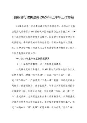 县综合行政执法局2024年上半年工作总结2024年以来,在县委县政府的坚强领导下,县综合行政执法局深入贯彻落实XXX新时代中国特色社会主义思想及XXXXXX关于城市管理工作的重要讲话精神,以党建引领城市管理工作提质增效。全面推进城市精细化管理,不断加强执法队伍建设,努力开创**综合行政执法工作高质量发展的新局面。现将工作开展情况汇报如下:一、2024年上半年工作开展情况(一)聚焦党建引领,进一步加强党的建设一是强化党组自身建设。以XXX新时代中国特色社会主义思想为指导,增强四个意识、坚定四个自信、做到两个维护。严格落实三会一课制度,不断提升政治判断力、政治领悟力、政治执行力。今年以来开展党组理论中心组学习5次,专题研讨3次。二是创建和美**城事先锋党建品牌。为实现党建和业务工作深融互促,以高质量党建推进全局各项工作全面发展,提升城市管理精细化水平,创建和美**城事先锋党建品牌。致力打造先锋标地,坚持将为民服务、依法行政、文明执法、防治结合、改革创新融入党建品牌体系,注入到综合行政执法的全过程,促进城市管理水平全面提升。三是贯彻落实党风廉政建设责任制。坚持重要节日、重大事项谈心谈话制度,不断增强队伍团结协作精神,在春节、五一、端午等重要节点开展了谈心谈话及廉政提醒。四是扎实开展党纪学习教育活动。制定《**县综合行政执法局党纪学习教育实施方案》,按照
