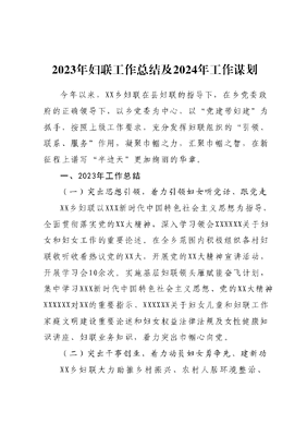 2023年妇联工作总结及2024年工作谋划今年以来,XX乡妇联在县妇联的指导下,在乡党委政府的正确领导下,以乡党委为中心,以党建带妇建为抓手,按照上级工作要求,充分发挥妇联组织的引领、联系、服务作用,凝聚巾帼之力,汇聚巾帼之智,在新征程上谱写半边天更加绚丽的华章。一、2023年工作总结(一)突出思想引领,着力引领妇女听党话、跟党走XX乡妇联以XXX新时代中国特色社会主义思想为指导,全面贯彻落实党的XX大精神,深入学习领会XXXXXX关于妇女和妇女工作的重要论述。在全乡范围内积极组织各村妇联收听收看热议党的XX大,开展党的XX大精神宣讲活动,开展学习会10余次。实施基层妇联领头雁赋能奋飞计划,集中学习XXX新时代中国特色社会主义思想、党的XX大精神XXXXXX对XX的重要指示、XXXXXX关于妇女儿童和妇联工作家庭文明建设重要论述和妇女权益法律法规及女性健康知识讲座、妇联业务知识,着力突出巾帼心向党。(二)突出干事创业,着力动员妇女勇争先、建新功XX乡妇联大力助推乡村振兴、农村人居环境整治、美丽庭院建设等工作,2023年,共创建美丽庭院XXX户精品庭院XXX户。开展十佳百优活动,评选十佳庭院1户。积极组织开展评选最美家庭、好媳妇、好邻居等活动,极大的激发她服务,号召她担当开展我是妇联执委大家评活动,激励妇联执委担当作为、履职尽责。(三)突出关心关爱,着力围绕妇女办实事、解难题XX乡妇联致力于传递温暖与爱,定期走访困境妇女、儿童。2023年,XX乡妇联组织各村妇联巾帼志愿服务队去困境妇女、儿童家中开展清洁、慰问等志愿服务活动对困境妇女进行入户走访,关心她们的生活情况,为困境妇女送上米、面油等慰问品;对困境儿童进行入户走访,关心他们的心理状态,陪他们一起读书、做家务,为困境儿童送去爱心小礼物,用实际行动让他们感受到妇联的关心与关爱,进一步增强困境妇女、儿童的幸福感和安全感当好新时代纾解忧愁的巾帼贴心人。开展执委进万家巾帼送温暖活动。要落实执委日走一户要求,进门看、坐下谈,进一次家,办多项事,将执委进家活动与XX大精神宣讲、美丽庭院创建、家庭文明建设、乡村振兴、基层社会治理等内容相融合,落实执委进百家门知百家情、解百家忧、办百家事要求。(四)突出组织建设,着力融入妇女新阶段、新格局组织开展全民阅读活动,进一步贯彻落实了XXXXXX关于注重家庭、注重家教、注重家风的重要指示精神,倡导全民阅读,充分发挥亲子阅读在传递良好家风、传播科学家教中的重要作用。组织开展妇女权益保障法、反家庭暴力法等普法宣讲活动,让广大妇女干部群众对于婚姻家庭纠纷调解等诸多法律条款有了深切地了解与认识,提高了妇女学法、守法、懂法的积极性,提高了依法维护妇女权益的服务能力和水平。二、2024年工作谋划(一)突出政治引领,凝聚妇女群众持续高质量开展学习贯彻XXX新时代中国特色社会主义思想主题教育,聚焦学习宣传贯彻党的XX大精神及XXX关于妇女儿童和妇联工作重要论述,深化百千万巾帼大宣讲活动、巾帼朗读者活动,开展形式多样的宣讲活动,团结带领广大妇女争做伟大事业的建设者、文明风尚的倡导者、敢于追梦的奋斗者。(二)强化责任担当,服务中心大局深化乡村振兴巾帼行动,引导广大妇女和家庭积极投身农村人居环境整治、乡风文明、乡村治理等等中心工作助力巾帼双创行动,大力支持妇女创新创业,引领广大妇女积极投身高质量发展大潮。(三)加强统筹协调,深化维权关爱加强民生关爱,积极推动两癌免费检查及两癌妇女救助工作,大力实施困境妇女儿童关爱帮扶行动健全多部门维权合作机制,加强部门联动,不断优化平安家庭创建、婚姻家庭纠纷多元化解机制建设,维护妇女儿童合法权益。(四)建设家庭文明,树立文明新风常态化开展家庭教育公益服务活动,深化家庭家教家风建设,发挥妇女在社会生活和家庭生活中的独特作用,以小家庭的和谐共建大社会的和谐。