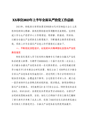 XX单位2023年上半年全面从严治党工作总结2023年,XX党委全面贯彻落实XXX新时代中国特色社会主义思想和党的XX大精神,紧抓疫情防控政策调整的发展契机,坚持党建工作与生产经营中心工作同谋划、同部署、同推进、同考核,以健全全面从严治党体系为重要抓手,不断推进主体责任落地见效。现将上半年全面从严治党工作开展情况汇报如下。一、不断优化顶层设计,以党的XX大精神强化全面从严治党责任落实XX党委反复深入学习党的XX大精神中关于健全全面从严治党体系的重大部署,专题学习XXXXXX在二十届中央纪委二次全会上关于健全全面从严治党体系的一系列具体要求,公司党的建设领导小组召开3次专题会议研究部署,制定出台了《XX单位关于健全全面从严治党体系的实施意见》,决定利用三年左右的时间从全链条责任机制、全覆盖责任事项、全过程责任考评入手,建立起一套具有XX单位业务特点的有机衔接、联动集成、协同协调的全面从严治党体系。《实施意见》自3月份出台后,XX党委组织座谈会X次、培训会X次,各级党组织开展宣贯活动XX场次,全面从严治党的氛围愈加浓厚。目前,细化之后的XX个责任主体均已编制了责任清单并开展了试点工作,收集了XXX项优化完善的意见建议各项相关工作推进有力,全面从严治党体系化程度明显提升。二、以政治建设为统领,时刻紧盯党中央决策部署落地见效XX党委把坚决贯彻执行党中央决策部署和上级党组织工作安排作为最重要的政治责任,在去年将其列为政治巡察和党建工作考核项后,今年进一步加大监督力度,通过月度自查、季度对标的方式确保时刻与党中央精神和上级党组织推进工作的进度对标对表,以实际行动将两个维护要求落到实处。4月份,结合学习贯彻XXX新时代中国特色社会主义思想主题教育部署,制定了包括主题教育开展、党的XX大精神学习宣贯等XX项工作在内的落实清单,细化了责任领导、责任部门、完成时间等要素,明确了贯彻落实党中央决策部署和上级党组织工作安排是党员领导干部的首要职责,在主题教育读书班中专设政治素质提升课程,将贯彻落实的方法论与有效提高政治判断力、政治领悟力、政治执行力的途径统筹起来,引导党员领导干部更好履职尽责。两级机关在6月份开展了机关党组织政治功能提升工程,各部门主动认领清单任务,系统推进工作落地。三、紧抓主题教育契机,坚持以XXX新时代中国特色社会主义思想凝心铸魂XX党委在充分总结党的十九大以来学习贯彻XXX新时代中国特色社会主义思想的实际情况,早在主题教育启动之前,就明确了XX个方面的学习弱项和X个方面需要再研究再深入的内容,结合党的XX大精神学习宣贯,在公司XX个党员活动阵地、XX处宣传栏中更新了以十个明确、十四个坚持、十三个方面成就为主要内容,以推进中国式现代化为中点内容的宣传矩阵。主题教育开展以来,结合新的学习部署和以往的学习成效,确立了马克思主义中国化时代化新境界、新时代新征程中国共产党的使命任务、党的创新理论立场观点方法等三个方面的研讨专题,党员领导干部相应开展中心组学习XX次,党支部开展集中学习研讨XXX次,各级党组织书记讲党课XX次,共有XXX条意见建议在学习研讨中被征集上来,结合主题教育调研查找的问题目前正在推进整改中。七一期间,策划开展了高质量发展论坛,以党的创新理论学习成果指导发展实践,深入分析疫情三年来对市场及利润造成的负面影响和当前国内国际复杂形势下的发展机遇,着力探讨打造中国式现代化XXX样板的可能性和实践途径目前已推进过半。四、聚焦领导作用发挥,推进把方向、管大局、保落实进一步走深在2022年度民主生活会前的征求意见中,很多基层单位反映了三重一大事项不够细化的问题,部分生产经营任务落实在细则中无法靠实。对此,XX党委高度重视,从去年12月份开始,全面梳理了XX种决策情形,新增了XX条细分事项,建立了定期研究分析、制度动态更新的工作机制,彻底解决了当前发展状况下的三重一大事项规范落实问题,党委领导作用的发挥得到了切实保证。上半年,XX党委《关于在两级机关机构改革中加强党的建设的实施意见》、《关于在重大突发性事件中有效发挥基层党组织战斗堡垒作用和党员先锋模范作用的指导意见》、《关于在重点工程建设中激励党员干部担当作为的指导意见》、《关于常态化开展谈心谈话等组织生活制度的实施方案》等一系列文件相继出台,较好地实现了党中央和上级党组织政策指示在本单位的制度化和长效化,党委把方向、管大局、保落实的作用更加具体务实、走深走实。五、着力夯实基层基础,持续增强基层党组织政治功能和组织功能XX党委始终把基层基础工作作为重中之重,大力实施机关党支部燃灯计划、一线党支部北斗计划,把党章赋予党组织的各项职责作为考核评价重点,完善了XX项工作机制、XX个工作流程,基层党支部规范化标准化水平不断提升。自去年下半年开