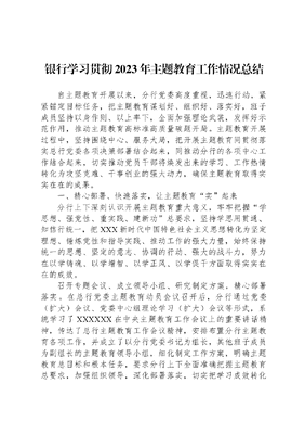 银行学习贯彻2023年主题教育工作情况总结自主题教育开展以来,分行党委高度重视,迅速行动,紧紧锚定目标任务,把主题教育谋划好、组织好、落实好,班子成员坚持以身作则、以上率下,全面加强理论武装,发挥好示范作用,推动主题教育高标准高质量破题开局。主题教育开展过程中,坚持围绕中心、服务大局,把开展主题教育同贯彻落实总行党委各项决策部署结合起来,同推动分行的各项中心工作结合起来,切实推动党员干部将焕发出来的学习、工作热情转化为攻坚克难、干事创业的强大动力,确保主题教育取得实实在在的成果。一、精心部署、快速落实,让主题教育实起来分行上下深刻认识开展主题教育重大意义,牢牢把握学思想、强党性、重实践、建新功总要求,坚持学思用贯通、知信行统一,把XXX新时代中国特色社会主义思想转化为坚定理想、锤炼党性和指导实践、推动工作的强大力量,始终保持统一的思想、坚定的意志、协调的行动、强大的战斗力,努力在以学铸魂、以学增智、以学正风、以学促干方面取得实实在在的成效。召开专题会议、成立领导小组、研究制定方案,精心部署落实。在总行党委主题教育动员会议召开后,分行通过党委(扩大)会议、党委中心组理论学习(扩大)会议等形式,系统学习了XXXXXX在中央主题教育工作会议上的重要讲话精神,传达了总行主题教育工作会议精神,安排布置分行主题教育各项工作,并成立了以分行党委书记为组长,其他班子成员为副组长的主题教育领导小组,细化制定工作方案,明确主题教育总目标和根本任务,要求分行上下全面准确把握主题教育总要求,加强组织领导,深化部署落实,切实把学习成效转化为推动分行高质量发展的强大力量和生动实践。强化理论学习,推动党的创新理论入脑入心。分行党委及各级党组织利用中心组理论学习、党支部三会一课等,通过读书班集中学习、个人自学、专家辅导、现场教学等形式,对党的XX大报告、党章、《XXX著作选读》《XXX新时代中国特色社会主义思想专题摘编》等必读书目进行认真研读学习,坚持原汁原味深入学,一篇一篇读、逐段逐句悟,做到全面学习、全面把握、全面落实。将每周四固定为分行党委集中学习日,每周二和四晚上固定为基层党支部集中学习时间,每次集中学习研讨不少于2小时,做到知其言更知其义、知其然更知其所以然。截至8月末,参加总行读书班集中辅导7次,专家讲座3次,各级党委中心组理论学习32次,党支部理论学习237次,专题党务培训1次,理论学习取得实效。大兴调查研究,推动工作作风持续向好。分行党委班子成员以上率下,主动发挥带头模范作用,结合总行2023年调查研究重点任务清单,明确调研内容,调研课题聚焦经营机构业务发展和经营管理中的难点、堵点,解决夯实客户基础、推动营收增长、打造经营特色等方面的问题,着力解决业务发展中遇到的瓶颈。共计深入基层调研15次,形成调研报告5份;收集梳理问题123个。对于收集到的问题明确了责任部门和整改要求,能力行立改的立即整改,需要持续性整改的细化工作措施、明确责任人和完成时限,分行工作作风得到进一步转变并持续向好。坚持党建引领,经营管理取得实绩实效。分行以XXX新时代中国特色社会主义思想为指导,坚持以高质量党建引领高质量发展全面落实XXX交给的五大任务,牢牢把握一核三体两翼发展思路,认真贯彻各级党委政府、监管部门的决策部署、总行党委的工作要求,坚定实施1234战略树牢擦亮三张名片,稳住基本盘、布局新赛道,经营效益逐步向好,资产质量保持稳定,各项工作取得了较好成效。坚持问题导向,推动检视整改落细落实。开好专题民主生活会是主题教育检视整改的一个重要载体,也是确保主题教育成效的一项重要举措。分行党委紧紧围绕学习贯彻XXX新时代中国特色社会主义思想主题,聚焦学思想、强党性、重实践、建新功总要求,对照凝心铸魂筑牢根本、锤炼品格强化忠诚、实干担当促进发展、践行宗旨为民造福、廉洁奉公树立新风具体目标,深入学习领悟以学铸魂、以学增智、以学正风、以学促干的丰富内涵和实践要求,认真开展政治理论集中学习,广泛开展谈心谈话40人次,征集意见建议90余条,积极检视差距不足,认真撰写对照检查材料,严肃开展批评与自我批评,明确整改方向和措施,逐条逐项抓好整改,推动检视整改落细落实。二、创新形式、丰富内容,让主题教育活起来建设一批红色合伙人,推动行内外共建学。分行党委及各级基层党组织充分运用红色合伙人平台,与政府单位、监管机构、我行重点客户等签署红色合伙人共建协议,以合伙模式引入社会多元化主体,立足以人民为中心的共同目标,本着互带互动、优势互补、资源共享、共同发展的共建原则,通过交流工作经验、分享工作资源、调研具体问题等方式,积极推动双方在政治理论学习、组织生活开展、活动阵地建设、发展思路谋划、廉洁文化宣贯等全方位的共建,着力推动业务合作的客户关