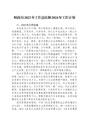 财政局2023年工作总结和2024年工作计划一、2023年工作总结财政收支运行平稳。建立财政收入调度机制,综合抓收,定期调度,以月保季、以季保年。预计全年完成地方一般公共预算收入X万元,同比增长X%,顺利完成年初预算目标。预计一般公共预算支出达X万元,同比下降X%。三保底线兜牢兜实,农业、教育、医疗等重点支出保障有力,财政收支运行平稳。牢固树立过紧日子思想,出台落实落细厉行节约坚持过紧日子X条工作举措,从印刷费、会议费、培训费、差旅费、三公经费等方面严控支出,从印刷纸张、空调使用、绿植摆放、出差标准等细节层面以硬措施推进过紧日子要求落地。全年统筹债券资金、上级专项资金、存量资金合计X亿元,确保全县重点工作、重点工程资金需求。统筹各级各类财政涉农资金X万元,集中财力办事,优先支持联农带农富农产业发展,统筹财政衔接资金和X后扶资金X万元支持县级重点产业发展,X万元用于一带两路两区人居环境集中整治。助力发展更加有为。修订《X县支持经济高质量发展若干政策(X版)》,有效推动全县经济高质量发展。安排中小企业发展专项资金X万元,支持中小企业提质增产增效。积极争取获批省级废气治理提升改造项目资金X万元,有力地支持了园区企业发展壮大。大力开展四送一服活动,为企业排忧解难。实施新的组合式税费政策,全县共有X户小型微利企业享受企业所得税低税率优惠政策和增值税阶段性减免优惠,总计减免各类税费X万元。积极对接省内外各类基金,县内功能膜首位企业累计吸收各类基金投资X亿元。国资管理提质增效。印发《X县县属国有企业提质增效行动方案》,开展县属国有企业提质增效行动,进一步提升企业效益。制定《X县企业国有资产监督管理办法》《X县县属国有企业经营业绩考核暂行办法》,建立完善的国企监管体系和覆盖所有县属国企的考核体系。X等实体项目运作稳步推进,建X司已经取得建筑和市政总承包二级资质,县X公共资源交易有限公司已完成代理项目X个,收入X万元,高铁南站智慧停车系统X月X日正式运行;深化县属国有企业监事会改革,加强县属企业内部监事会建设,全面取消县属企业外派监事X名;县X产业投资有限公司申报发行企业债券X亿元,打通直接X渠道;发X司积极谋划新型城镇化提质升级、农业综合开发、X片区水系综合治理等X项目X个,取得银行授信X亿元,提款X亿元。文旅集团谋划环湖民宿产业集群等X个重点项目,预计取得X亿元;开X司县经开区南扩片区开发(一期)弃土利用等X个项目申请X亿元。开展资产资源清查,盘活利用存量资产,处置工程项目产生砂石土资源项目X个,处置收益X万元;搭建政府公物仓平台,已累计从公物仓调剂X余项X万元资产;累计将县直各部门X处位于乡镇的闲置房屋土地划转至属地政府管理盘活,用于太商返乡创业,助力乡村振兴;牵头调剂X县资规局等X个单位办公用房。普惠金融高质量发展。建立企业上市工作包保调度机制,对企业上市实行月调度,推进上市进程,富印新材料X月已向省证监局申报辅导备案,绿动能源已完成首轮股权X万元,投后估值X亿元。开展五进走访活动,走访一级市场活跃主体X家,走访率X%。强化金融助企纾困,累计新增助企贷款X亿元。进一步加强农民专业合作社资金互助风险防范化解工作,X年关停资金互助业务共计X家,并实现了投放金、互助金双降目标。严格落实脱贫人口小额信贷政策,脱贫人口小额信贷余额X亿元,今年新增投放X户X万元。全县推进党建引领信用村建设工作,累计授信X亿元,用信X亿元,累计授信户数X户,用信户数X户。强化政府性X作用,县X公司在全省综合评价为A类。采取批量化X的新模式,创新推出链担通--黄牛贷特色业务品种,合作授信额度X万元。合理运用税融通业务品种,X年税融通信用X贷款企业X家,信用X额度X亿元,拓宽了企业X渠道,金融助企纾困工作成效显著。政策性农业保险工作扎实推进,防贫保综合保险试点稳步推动,全县X户农户参保,收取保费X万元。争资争项取得突破。将向上争资争项列入县综合绩效考核,激励各部门积极争资,解决X问题。成功争取X年中央财政支持普惠金融发展示范区和中央专项X公益金支持欠发达革命老区乡村振兴示范区建设项目两个国家级示范项目,共获中央财政资金X万。X年X月《X县大力发展普惠金融助企惠农暖民心》典型经验得到了省委主要领导批示。省委政研室、省财政厅、省X集团、省人民银行先后前来开展解剖麻雀式调研,以X模式为全省普惠金融发展探索路径。重点改革有序推进。全面实施零基预算改革,打破传统支出固化僵化格局,编制年度重点保障事项清单,引导部门立足全局谋划年度目标任务、科学申报预算。常态化加强中央直达资金、财政衔接资金、后扶资金、中央预算内投资和专项债资金支出进度调度,支出进度均达到序时目标。全面开展预算绩效管理工作,实现预算单位项目支出绩效自评和部门整体支出绩效自评全覆