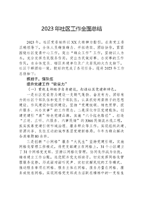 2023年社区工作全面总结2023年,社区党委始终以XX大精神为指引,在街党工委正确领导下,全体人员群策群力、开拓进取、团结协作,紧紧围绕社区党委中心工作,突出群众工作工作,坚持以人为本,充分发挥为民服务作用,突出为民做好事、办实事的工作作风,在全体党员、辖区共建单位及广大居民的大力支持下,社区干群团结一致,较好的完成了各项任务。现将2023年工作总结如下:抓班子,强队伍提升党建工作软实力(一)重视支部班子自身建设,打造社区党建新特色。一是社区党委努力建设一支朝气蓬勃、奋发有为、团结有力的社区干部队伍和党员干部队伍,认真抓好两委班子的思想建设、作风建设和组织建设,坚持党建统领、特色贯穿、提升服务、兴办实事的工作理念。二是深化市区党建载体,创建党建引鹿特色党建品牌,实施六个红色路径,打造三进、三听、六服务、六事民情的3366民情流水线工程,抓实抓靠党建引领市域治理、服务群众等工作,实现组织共建、资源共享、良性互动的城市基层党建新格局。今年为群众解决各类难题80余件。三是创新小网格服务大民生坚持党建引领,实施网格化管理工作模式,将党支部建立在网格上,31个小区建立了31个网格党支部。坚持以网格化管理,协同化作战为依托,精准建立工作台账,选优配齐党支部班子,切实发挥网格化管理服务优势,形成面对面听民声、实打实解民忧的工作模式,推动服务事项在网格、服务主体在网格、服务力量在网格、服务成效在网格,实现网格党支部成为活跃在楼栋中的一支有生力量,切实让基层党组织和工作纵向到底的服务体系更加坚实。四是搭建平台架起连心桥,继续充分发挥在职党员进社区的常态化机制,利用微信二维码系统提高在职党员服务社区的参与率。提高了党员为社区服务,管理社区事务的参与率;社区党委从发挥在职党员作用、服务人民群众实际出发,积极为在职党员搭建活动平台,开展各项活动,建立共建制度,搭建发挥作用的平台:社区党委定期召开社区共建会议,邀请共建参加会议,探讨党员活动载体和方式,发挥党员先锋模范作用;搭建起了在职党员、自管党员和共建单位党员下沉小区,开展共驻共建活动20余次,把工作做到群众心坎上。五是围绕廉政文化进社区活动,建设积极、乐观、向上的社区文化。建立社区廉洁文化建设领导小组,和宣传员队伍。制定切实可行的廉洁文化进社区工作计划,开展廉洁文化教育阵地申报工作1次。上半年向社区居民群众宣讲当前反腐倡廉建设的形势、任务、措施、成果3次。设立廉洁文化宣传栏,充分利用社区宣传橱窗、电子显示屏、广告牌、公园凉亭、长廊等阵地,张贴廉洁书画、广告,创设廉洁文化景观,利用社区楼道墙面宣传廉洁书法作品。建立廉洁文化网络平台。利用社区网站或微信公众号开辟廉洁文化专栏,开设廉洁文化论坛,引导社区居民增强廉洁、诚信、守法意识,营造浓厚社区廉洁文化氛围。使纪检监察工作再上新台阶。六是把握意识形态工作主动权切实守好意识形态建设主阵地,紧紧围绕安全生产、环境整治、精神文明等中心工作任务,找准立足点,发挥思想引领、舆论推动、精神激励的重要作用。坚持学习制度,将学理论、学业务、党建专题知识讲座有机结合起来,努力创建学习型党组织,做到计划、讲座、心得和考勤相结合。以支部为单位,在每月期开展党员活动日活动,上半年共开展集中交流研讨2次,召开意识形态领导小组会议1次,召开意识形态工作联席会议1次,开展党课业务大讲堂3次。加强党风廉政教育,结合党委专题学习和党员政治理论知识学习任务,在社区微信群、公众号、政务微博等新媒体平台推送学习教育及宣传内容10余条。(二)继续深入学习XX大精神,全力抓好党支部建设。一是抓好学习。通过党委会议、党委理论学习、心组学习会议等形式集中学习研讨,基层党组织依托三会一课、支部例会、主题党日等活动载体深入开展学习。发挥党员模范先锋作用,适时分层分批组织广大党员干部学习培训,年初以来,共开展集中学习6次,观看各类专题片3部,观看红色电影2部,组织参加各类培训3次。二是抓实教育。海兰街鹿源春党委灵活搭建和应用各种学习载体和平台,在提高学习质量上下真功,突出针对性、增强实效性。建强教育阵地。我社区利用党群服务中心,根据自身特点设置党性活动室、阅览室、微课堂、开放式学习区等特色学习阵地,并充分利用党课开讲了、业务大讲堂等阵地,满足不同党员的学习需求。依托区党群服务中心阵地资源,组织党员和群众集中培训。通过参与政治理论学习和现场交流研讨的党课形式,进一步坚定理想信念,增强党性修养。三是创新手段。精心打造3课堂模式,即红色宣讲员每月党课我来讲,年轻党员日常远程微党课,流动党员时常随身小课堂。创设党课进社区业务大讲堂,由身边人讲,现场录,利用微课堂进行线上和线下党课结合,全社区党委党员和群众无论在单位还是在家里,通过