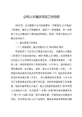 公司人才强企专项工作总结2023年,公司着眼于公司发展需求,不断强化人才强企工程建设,健全人才管理体系,制定了一系列措施,进一步提高了员工归属感和干事创业的积极性。现将一年来开展的工作情况总结如下:一、重点提炼工作亮点(一)统筹谋划,建立党建与人才双向奔赴理念年初制定了《公司人才强企行动计划》,对整体人才强企工作进行了全面归纳分析。树牢党管人才理念,形成党委书记担任人才工作领导小组组长亲自抓,分管领导直接抓,一级抓一级、层层抓落实的工作推进机制。4月26日,稳步推动三项制度改革,设立赫山、益南、益北三个党支部(片区),并根据行政区域结合站点分布情况将各加油(气)站以及机关党员划分到各党支部(片区),深入基层标准化管理。5月9日,召开专题党委会听取人事工作汇报,并研究申报创新工作室事宜;组织开展专项人才盘点,在人力资源系统完成了39名专项人才的标识工作。全力推进一支部一品牌党支部品牌建设和一课一片一实践活动,每月设置主题,开展特色化主题党日活动,先后安排325人次下站帮扶,解决加油站急难愁盼问题;注重党建带团建工作,要求青年团员积极参加党委活动,组建青年突击队和党员突击队,下站帮扶10余次。(二)技能培养,树立一专多能人才发展目标2023年,分公司培养本地大学生3人,统招大学生1人,重点做好师带徒工程,强化大学生职业生涯规划;组织4名优秀站经理和客户经理到常德赋能培训,5名高级工到辽宁参加技师培训,新增技师5名,技师通过率100%,完成了党委与7名技师的结对工作。全年加油站管理人员晋升11人。组织分公司党务工作者和党支部书记共4名同志在长沙板仓学院参加了2023年基层党支部书记培训班,认真学习如何做好五心三会党支部书记,积极参加研讨和情景演绎,获得冠军队称号,参训者全部通过党支部书记资格认证。切实做好经验分享工作,召开大学生座谈会1次,专业线调研座谈会4次,油品和非油品销售开发经验进行交流1次。制定中国石油开放日及技能比武方案,8月4日,在秀水加油站开展中国石油开放日活动暨第三届技能比武大赛,3个片区27名选手参与,掀起了比服务、练技能的热潮。(三)创新主导,搭建引领共学人才建设平台分公司汇聚各专业线骨干力量,打造任沙沙青年创新工作室,以技改革新、技能攻关、技艺传承为抓手,注重青年员工发展,搭建创新发展平台,2023年10月通过省公司创新工作室评审。工作室领衔人秀水站任沙沙被选拔为集团公司内训师,参与分公司技能比武的初赛裁判员评审中,成为技能鉴定的主导培训师,持续促进员工队伍能力培养及技能操作水平的提升。工作室成员团委书记吴静选拔为湖南销售首届青年讲师团成员。切实发挥宣传喉舌作用,人才强企稿件《浅谈如何使用基层骨干》《公司:外包员工转编激活春水增动能》在省公司首页上稿。在省公司纪委组织开展的首届廉洁文化作品征集活动,公司获评优秀组织单位;工会征集合理化建议23条,有5条在分公司得到了实施。二、人才工作典型经验做法打破壁垒,树立人才一站式服务标杆。针对调研发现的外包员工对转编愿望较为迫切,希望增加晋升机会,加快考核进度的问题,制定了《外包员工转编方案》和《外包员工转编考核规则》,下发了《关于组织开展外包员工转编考评的通知》,定期向省公司争取适当名额,畅通外包员工入系统的渠道。以基本素质、主要业绩、工作作风三个方面考核,13名员工参加到外包员工参与转编报名,2名优秀员工经过层层选拔获得外包转编机会。前期优秀外包员工刘毅、王君2名员工转变后均走到站经理岗位。业务经营部通过神秘顾客访问、现场检查、视频扫站等多种方式,增强对员工实时管控,发现确有不符合管理岗位要求的员工及时调整,让刘博、段海文等3名外包员工走上管理岗位,外包员工周尹刘峰将米油卖到了桃江学校食堂,为加油站增加非油收入3万余元。切实解决了技术人才储备少、加油站员工年龄结构偏大、人才断层等人事用工矛盾。让加油站在需要人才更替的期间,外包储备管理人员能够召之即来、来之能战、战之能胜,从制度上彻底规范了加油站的用工难题。三、对公司人才工作的意见建议根据人才强企工作,有如下建议:一是建议专业线员工增加到其他省份或者地市分公司学习交流机会,能够学习其精华,取长补短,切实增加专业技能水平;二是建议增加新媒体相关培训,让综合办公室、业务经营部员工、基层加油站员工能掌握新技能,增加分公司销售经营和宣传新路径;三是建议内训师开展课题研究、讲课技巧等提升培训,多渠道培养内训师的讲课技能,做到培养一个人,教化一群人,激励整个公司的作用。