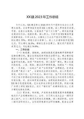 XX镇2023年工作总结今年以来,XX镇坚持以XXX新时代中国特色社会主义思想为指导,全面贯彻落实党的XX大精神,深入贯彻落实省委、市委、县委全会精神,全面推进百千万工程,锚定高质量发展目标任务,抢抓机遇,凝心聚力,不断开创XX镇高质量发展新局面。今年1-9月,全镇规上工业总产值实现XX亿元,同比增长35%,增速位居全县第二,规上工业增加值实现XX亿元,同比增长31.5%,增速位居全县第三。固定资产投资完成X亿元,同比增长54.8%。一、工作总结(一)抓党建、强组织,治理效能在完善机制中创新提升坚持党建引领,整合各领域现有网格及治理平台,建立镇村组网格大巡查系统,建设全科网格员队伍,建立网格员量化监督考核机制,按照网格吹哨、部门报到模式,建立巡查问题发现、上报、跟踪、解决闭环管理机制,构建起一网统管、一员多能、一站统办的全科网格治理模式,打通基层治理最后一米。全面规范农村自治组织,深入开展清产核资,收回片区、生产队权力,推动片区、生产队这类不规范、不利于集中管理的组织彻底消除,党对村组工作的领导力得到有效加强,村、组运转更简洁高效,治理效能得到提升。开展XX镇示范党校创建,充分发挥地方特色资源优势,积极对接广州理工学院XX校区,实行镇村校共建师资队伍,打造乡镇党校特色品牌。(二)育企业、优环境,产业实力在集聚发展中高歌猛进电动车产业规模持续壮大,台铃、小刀两大龙头企业一期项目满工满产,小刀二期项目用地完成摘牌,进入建设阶段,台铃二期项目即将动工,台铃超级电摩项目即将摘牌,配套企业厚华动力完成上规,今年1-9月,全镇电动车行业实现规上工业产值XX亿元,同比增长97.7%,对全镇规上工业总产值的增长贡献率达82.9%,占全镇规上工业总产值的比重达到43.5%。项目建设提质增速,建立XX镇重点项目全过程跟踪清单,将研究重点项目推进作为镇三套班子会议的重要议题,实行项目建设周调度、月研判,家宜家居项目顺利封顶,新星、深缆等项目加快推进。高标准规划制造业工业园,规划编制、征地、高压线迁改、占林审批等土地前期工作加快推进,为项目落地谋足空间。(三)抓绿美、重建管,城乡面貌在不断改善中提档升级深入推进植树增绿、农房风貌管控提升和人居环境整治三大攻坚行动,坚持党员干部带头、企业群众参与,全镇完成村道绿化3.4公里,完成植树6.6万棵,铺设草皮26.9亩,建成口袋公园3个,完成农房风貌管控提升342栋,全镇绿美生态水平显著提升。纵深推进乡村振兴战略,发动3684人参与人居环境整治,清理乱搭乱建61处,拆除危废弃泥砖房(残垣断壁)34间共961平方米。大力推进非农化非粮化整治,完成撂荒耕地图斑复耕复种253.4亩,全镇现存草皮已清理完毕,面积达到744亩,累计清理占用耕地种植的桉树365.95亩。(四)补短板、强功能,民生福祉在共建共享中持续增进完善圩镇基础设施,加快广汕路两侧升级改造、圩镇道路白改黑项目,加快新自来水厂、新卫生院等民生工程建设。加快推进村(居)级综合性文化中心建设,现已建成或基本建成村级(社区)综合文化服务中心8个,覆盖率73%。稳步推进新时代文明实践,开展理论学习、政策宣讲、节庆赛会、关怀慰问、惠民活动、环境整治、技术培训交流会等新时代文明实践志愿服务活动超200场,共计覆盖参与达8000人次,极大得丰富了辖区村民的文化生活。切实抓好安全生产各项工作,围绕有限空间、危险化学品、工矿商贸、环保油、燃气、使用危险化学品等重点行业开展安全隐患排查整治,排查各类生产经营单位330家次,发现各类问题及安全隐患186项,下达整改指令93份,整改到位率达100%。二、2024年工作计划2024年,我镇将深入学习贯彻党的XX大精神,全面推进百千万工程,全面贯彻新发展理念,推动经济运行稳中向好。一是加快推进重点项目建设,加快推进小刀二期、台铃二期、台铃超级电摩等项目建设,开展产业链招商选资,持续优化营商环境,全力培育壮大电动车产业。二是深入实施乡村振兴战略,坚决完成粮食生产任务,积极培育乡村特色产业,发展壮大村集体经济,深入开展农村人居环境整治。三是强化医疗、教育、供水、道路等基础设施建设,加强精神文明建设,持之以恒抓好安全生产工作。四是全面落实新时代党的建设总要求,坚定不移推进全面从严治党,努力把各级党组织锻造得更加坚强有力,为XX高质量跨越式发展提供坚强政治保证。