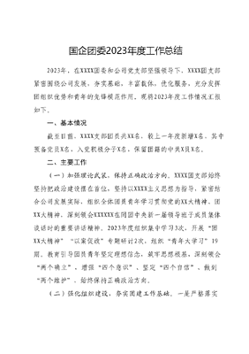 国企团委2023年度工作总结2023年,在XXXX团委和公司党支部坚强领导下,XXXX团支部紧密围绕公司发展,夯实基础,丰富载体,优化服务,充分发挥团组织优势和青年的先锋模范作用。现将2023年度工作情况汇报如下。一、基本情况截至目前,XXXX支部团员共XX名,较上一年度新增X名,其中预备党员X名,入党积极分子X名,保留团籍的中共X员X名。二、主要工作(一)加强理论武装,保持正确政治方向。XXXX团支部始终坚持把政治建设摆在首位,坚持以XXXX主义思想为指导,紧密结合公司发展实际,组织全体团员青年学习贯彻党的XX大精神、团XX大精神,深刻领会XXXXXX在同团中央新一届领导班子成员集体谈话时的重要讲话精神。2023年度组织集中学习3次,开展团XX大精神以案促改专题研讨2次,组织青年大学习19期。教育引导团员青年坚定理想信念,筑牢思想根基,深刻领会两个确立,增强四个意识、坚定四个自信、做到两个维护,始终保持正确政治方向。(二)强化组织建设,夯实团建工作基础。一是严格落实三会两制一课制度。团支部结合XXXX发展实际,引导全体团员青年紧跟形势学,结合岗位学,2023年度,召开团员大会3次,集中学习3次。结合学习贯彻XXXX主义思想主题教育,组织开展参观XXX爱国教育基地XXX,开展品读红色经典、赓续五四精神微朗读、学雷锋义务植树等丰富多彩的主题团日活动,切实把学习宣传贯彻XXXXXX重要讲话精神、团XX大精神焕发出的政治热情转化为推动公司改革发展的强大动力。二是严格落实推优入X工作。始终牢记团组织是广大青年在实践中学习中国特色社会主义和共产主义的学校,是X的助手和后备军,2023年为公司党组织培养预备X员X名,入X积极分子X名,切实把优秀青年、先进分子吸收到X内来,选优储备一批年富力强、素质优秀的青年人才,为公司发展储备后备力量。三是深化青年突击队典型选树工作紧紧围绕X组织和XX公司实际,动员广大优秀团员青年,扎根基层务实重干,教育引导全体团员青年立足本职岗位,争做先锋模范不断提高工作质效。(三)加强群团建设,凝聚工作合力。一是践行社会责任,彰显国企担当。根据XXXX党委关于对口帮扶的工作安排,积极与XXXX村开展结对帮扶、义务植树、消费扶贫等志愿服务,引导团员青年履行社会责任,彰显为民担当。二是扎实开展主题教育实践活动。结合公司学习贯彻XXXX主义思想主题教育和公司发展实际,组织全体团员青年参观AI国教育基地XXX和省博物馆,组织观看《志愿军》,教育引导团员青年弘扬爱国主义精神,传承红色基因,坚定理想信念,凝聚奋进力量。三是结合XXXX团委承办第五届职工运动会,XXXX支部组织全体团员参加运动会开幕式节目表演《XXXX》,引导团员青年紧跟形势强学习,立足岗位创业绩努力为公司改革发展贡献力量。(四)加强廉洁教育,落实全面从严治团。一是持续开展作风建设,结合公司开展的以案促改专项整治活动,组织全体团员深入学习《XXXXXX关于全面从严治XX和作风建设的重要论述》《中国共产党纪律检查委员会工作条例》以及中央八项规定精神及其实施细则,组织开展党风廉政专题学习4次。通过党支部书记讲廉政党课、观看警示教育片、参观廉政教育基地等活动。二是盯紧重要节点,严明纪律要求,组织召开节前廉政警示教育会,开展谈心谈话等,并通过发送廉洁家书、廉政提醒,引导团员青年坚定理想信念,保持廉洁从业,筑牢拒腐防变思想防线。二、存在不足一是开展理论学习还不够深入。仍然存在重理论学习,轻工作实效的问题,开展学习与工作实际结合还不够紧密。二是团支部标准化建设还不足。团支部成立时间不长,支委工作经验不足,团支部服务青年的手段和方法比较单一,结合青年特点开展工作存在能力不足、方法不多等问题。四、下一步工作计划(一)持续在党支部组织凝心聚力上下功夫。贯彻落实XXXXXX重大要求和省第XXX次党代会精神,切实发挥党支部战斗堡垒作用,不断提升党支部抓党建、抓治理、抓服务能力,积极探索关心下一代工作载体,促使青年职工树立正确价值导向,努力为企业改革发展贡献力量。(二)持续在基础工作强基固本上下功夫。切实发挥基层党组织战斗堡垒作用和党员先锋模范作用,坚持党建带团建,加强团员青年教育培养,严把发展党员入口关,努力把优秀青年先进分子吸收到党内来,不断推动基层党组织创新发展。(三)持续在基本能力达标提升上下功夫。强化教育培训,聚焦XXXXX建设要求,有针对性地开展团员青年基本能力培训和岗位练兵活动。继续完善青年干部选拔培养机制,选优储备一批青年优秀人才,努力为公司改革发展提供强有力人才队伍支撑