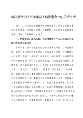 政法委书记在平安建设工作推进会上的总结讲话刚才,XX三位同志分别就平安XX建设相关工作作了安排部署都讲得非常细,操作性也很强,我都赞同,请大家务必抓好贯彻落实。下面,我再强调几点意见。一、认清形势,提高站位,切实增强做好平安XX建设各项工作的责任感和紧迫感今年以来,全市各级各部门坚持以发展促平安,以平安保发展,紧扣平安建设各项部署要求,扎实推进平安XX、法治XX建设全力巩固发案少、秩序好、社会稳定、群众满意的良好局面平安XX建设各项工作取得了阶段性成效。我们既要看到成绩,戒骄戒躁。在大家的共同努力下,全市社会治安防控体系建设全面加强,见巡率见警率管事率不断提升;法治螺钉机制不断健全,矛盾纠纷调解成功率保持在99%以上;常态化推进扫黑除恶斗争,重拳打击民生领域犯罪,治安、刑事案件立案数同比下降46.49%和41.22%;重点对象管理服务工作扎实列管社区矫正对象、社戒社康人员、在册严重精神障碍患者均实现100%常态严密管控;揭牌建立全省首个以法治建设服务营商环境为宗旨的县级片区(综合)法务区,市镇村三级综治中心实体化运行稳步推进。更要看到差距,奋起直追。去年,我市在全省平安建设群众满意度测评中排名虽然位列XX第一名,但在全省185个被考核县(市、区)中仅仅排在117名,今年我们的目标任务是进入全省前100名,每前进1名都需要付出巨大的努力,因为你想往前赶,前面的更是想方设法要保持住。从近期给我反馈的一些数据来看,我感到效果很不理想,形势十分严峻,一些去年扣分项不仅没有补齐短板,还跟其他地方的差距越来越大,考核标准一变今年可能又要被扣分,比如,反诈App的注册率与完成得好的地方相差10%以上;一些常规工作抓得不紧不实,比如,近期XX针对平安建设宣传氛围营造开展了暗访督导,我市已有部分镇、村被通报。从目前整体情况来看,无论是短板扣分项的工作还是亮点加分项的工作,我们都还有一定差距。还要看到机遇,乘势而上。刚刚召开的XX全会明确指出要以县域为重要切入点推进城乡融合发展,作出了重点在县域、难点在乡村的重大判断,提出的7个方面部署安排就包含了提升城乡基层治理现代化水平。今年以来,我市从矛盾纠纷多元化解禁毒环保整治道路安全等镇级突出问题着手,率先在XX镇开展了综治中心实战化作用提升试点工作,取得了显著成效。只要我们乘势而上、顺势而为,按照由点及线、由线到面、由面到片的思路精准发力、真抓快干,就一定能在加快形成县乡村联动、构建共建共治共享的城乡基层治理格局中跑出加速度、实现新突破。面对当前的压力和挑战,要想高标准、高质量完成全年目标任务,唯有放手一搏拼、求真务实干。今天,我们把各牵头单位和责任单位的主要领导、分管领导都请来了,就是希望大家务必统一思想、凝聚共识,以时时放心不下的责任感和慢不得、等不起的紧迫感,全力以赴向着既定目标冲刺,不负市委厚望,不负时代大考,不负民心期盼。二、聚焦问题,紧盯目标,找准抓实平安XX建设各项工作任务的突破口和着力点近期,在XX市安全、环保和平安建设工作推进会上,XX书记亲自安排部署平安建设突出问题专项整治工作,强调要以七大突出问题专项整治行动为抓手,做到三个必须,即必须不折不扣抓好落实,必须对标对表整改到位,必须彻底扭转当前局面,全力推动平安建设工作进入全省第一方阵。落实好XX书记的指示要求,我认为也要在三个方面发力,那就是始终坚持三个导向,即问题导向、目标导向、结果导向,找准工作突破口,抓实工作着力点。一是要始终坚持问题导向,确保问题全覆盖销号清零。前期根据XX工作要求,我市结合实际印发了《平安XX建设突出问题专项整治行动方案》,为了细化工作任务,又相继印发了七个分方案。刚才,XX院长已经作了详细安排部署,这里,我就不再赘述但是其重要性我还是想要再强调两句,10月份,XX书记针对七大突出问题专项整治亲自安排亲自部署;近期,又将专题听取各县(市、区)一把手汇报七大突出问题专项整治工作推进情况干工作,就是要学会抓重点,我相信今年的考评,七大突出问题专项整治行动成效一定是重中之重,希望大家一定要扭住问题不放手,对照问题一项一项整改到位。另外,各牵头单位、责任单位要组织专班对近3年测评情况,特别是去年扣分较多的工作进行深入剖析、梳理分析,举一反三全面排查整治影响群众安全感的突出问题,围绕问题短板找准问题症结、明确工作责任,制定整改措施,所有问题原则上年前必须全部整改销号。市平安办要牵好头,每周对整改情况进行调度,对整改进度较慢的单位及时督促提醒,相关整改情况定期报各牵头单位分管市领导掌握,确保该项工作一分不丢。二是要始终坚持目标导向,确保考评全过程稳中求进。刚才XX检察长就《平安XX建设工作考评指标体系》进行了详细解读,哪些工作要保分、加分