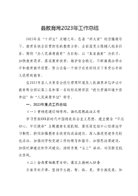 县教育局2023年工作总结2023年是十四五关键之年,在县四大家的坚强领导下,教育系统全面贯彻党的教育方针,全面落实立德树人根本任务,围绕办人民满意教育为目标,以某某教育为抓手,加快教育改革,落实教育扶贫,维护安全稳定,不断提高办学水平和教育教学质量,努力让每一个孩子在党的阳光下享受公平而又优质的教育。在2023年县人大常委会优化营商环境及人民满意单位评议中教育局分别以第三名和第一名的好成绩荣获优化营商环境十佳单位和人民满意单位称号。一、2023年重点工作总结(一)重视党建引领作用,强化思想政治工作学习贯彻XXX新时代中国特色社会主义思想,建立健全不忘初心,牢记使命主题教育长效机制。落实局党组中心组理论学习制度,持续加强教育系统党的政治建设,深入推进党建争先创优活动。加强对学校党建工作的领导和指导。加强思政课建设,加强纪律建设和作风建设,持续开展五上活动,切实转变机关作风。(二)全面贯彻教育方针,落实立德树人任务全面开科开课,坚持学生德、智、体、美、劳全面发展,加强卫生教育及健康教育。落实双减政策,加强学生作业、睡眠、手机、读物、健康五项管理,实现义务教育学校课后服务全覆盖,切实减轻学生课业负担和家长经济负担,办公平、优质、人民满意教育。(三)争取县委政府重视,确保教育优先发展近年来,县委、县政府高度重视教育工作,始终把教育摆在优先发展的地位,财政优先保障了教育供给,实现了教育经费两个只增不减。今年为新三中迁建供地650亩,全面加强城区及农村重点学校建设,三年内,将为城区百姓提供学位5000个,基本满足就学需求。2023年,共补充新教师145人,教师紧缺及老龄化问题逐步得到缓解。(四)加快教育项目建设,大力改善办学条件2023年教育共有17个项目在推进。其中迁建、改扩建的东一小学启航校区、东二小学校区、中心小学等已建设完成并投入使用;新建的实验小学、思源小学、新时代学校等正如火如荼建设中;迁建新三中也已写进本次党代会报告中。新学校的建成,将极大改善办学条件,消除义务教育学校大班额,满足优质均衡就学需求。(五)加强教师队伍建设,提高教师整体素质教育大计,教师为本。教育局始终把抓实师德师风建设,拓展教师专业成长通道,内练教师素质,外塑教师形象,作为教育发展的先决条件。组织学党史、立师德、铸师魂、做合格人民教师主题教育活动,集体宣誓,重温教师誓词,不忘教育初心首创师德讲堂活动,形式新颖,内容充实丰富,在全市颇有影响。颁布师德师风六条禁令,对违纪违规严肃处理。开展教育干部五上活动,服务基层学校,改进干部工作作风。加强教师业务培训,提升教师教育教学能力,引领教师专业成长。五年来,全县共招录新教师580人,组织各级各类培训18945人次城乡学校交流支教461人,511人被评为省市县优秀教师、师德标兵。(六)深化改革增添某某,优化布局促进发展一是推进普通高中适应高考综合改革,制定高中课程实施和教学组织管理指导意见,实施普通高中学生综合素质评价制度,推进普通高中育人方式改革,落实湖北省高考综合改革实施方案要求。二是全力打造某某教育品牌,推动课堂教学改革,优化教学方式,全面提升教学质量。三是实施县域内城乡义务教育一体化改革,促进教育优质均衡发展。城区实行集团化办学,小学形成某某小学、某某实验小学、某某小学三大办学集团;初中形成某某中学、某某中学两大办学集团。乡镇实行学区化办学,重点办好各乡镇初中、中心小学、中心幼儿园。(七)拓展延伸校外教育,做实学校红十字工作近年来,学生研学实践、校外活动基地、红十字进校园工作成为特色教育名片。教育局加大中小学生综合实践基地建设力度提升校外活动中心软硬件实力,依托校外活动中心、综合实践基地,以及研学旅行基地,创新校外教育模式,培养学生的个性特长,提升学生的实践能力。中小学生综合实践基地,多次荣获省教育厅表彰。教育局积极响应红十字进校园工作,红十字会先后为教育系统培训400名应急救护员和500名兼职校医。二、面临的问题和困难一年来,我县教育工作虽然取得了一定成绩,但也存在诸多的困难和问题。一是我县教育整体发展相对滞后,教育发展谋划还有待进一步完善;二是群众对优质教育的需求与我县教育的现实还有差距,城区学位紧张,农村优秀教师短缺问题还很突出;三是政府对教育投入的缺口依然较大,办学条件、教师待遇有待进一步改善;四是教师队伍编制结构、年龄结构、学科结构失衡问题仍然存在,义教阶段全面开科开课仍有困难,高中阶段选课走班压力较大;五是教育系统线长面广,安全维稳任务很重教育管理压力很大。三、2024年工作计划(一)落实双减政策,让教育回归本真积极落实双减政策,做好课后服务,促进学生全面发展提升全面质量,构建教育良好生态,让教育回归本真。努力提升学校育人水平