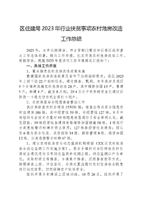 区住建局2023年行业扶贫事项农村危房改造工作总结2023年,本单位按照省、市主管部门要求和区委区政府重点工作总体部署,强化工作举措,扎实开展农村危房改造工作。根据安排,现就2023年度该项工作开展情况汇报如下:一、具体工作开展1、重点推进农村危房改造政策实施根据国家危房改造政策及省市下达的指标要求,我区2023年上级下达22户指标任务,通过排查、甄别,本年度涉及我区9个乡镇共实施农村危房改造28户,其中维修加固19户,重建5户,新建4户。截至8月初,29.4万元中央补助资金已通过区财政一卡通支付方式全部打卡到户。2、农村房屋安全隐患排查整治工作我区共排查农村自建房155031栋;排查出存在安全隐患农村自建房186栋,其中经营性59栋,非经营性127栋。9月中旬组织专业技术力量对93栋隐患房屋进行了安全等级认定。截至目前,59栋经营性自建房采取维修加固措施58栋,1栋实行分类悬挂警示标牌并停止使用;127栋非经营性自建房:经认定6栋为安全住房、采取拆除34栋、拆除重建8栋、维修加固12栋、分类悬挂警示标牌67 栋。3、建立农村住房安全动态监测机制根据《XX区农村住房安全动态监测工作实施方案》,要求乡镇村对全区所有农村住房安全情况进行日常动态监测并定期上报。动态监测以户为单位,采取村级日常排查、乡镇集中排查、区级督查指导方式,按照排查上报、评估鉴定、分类处置流程对农村住房安全隐患进行动态清零,切实保障农户住房安全。组织开展乡村建设工匠培训班。10月26日,组织开展了XX区乡村建设工匠培训班,参训人员有各乡镇街规划建设管理办公室工作人员、18个乡镇街乡村建设工匠,近120人。课程涵盖农村危房改造政策解读、建筑识图、一眼识别危险自建房、农村自建房安全常识、农房施工技术、农房建设质量与安全等内容。授课采取知识讲解结合案例分析方式围绕乡村建设工作重难点展开,加大了安全生产宣传教育力度,提高了参训人员乡村建设理论水平和实操技能。4、抓好历史建筑保护。根据上级工作部署,今年主要开展传统建筑调查及修缮情况统计摸底及传统村落、古民居两类潜在保护对象摸底工作。截至9月底,我区共统计出自2021年以来修缮传统建筑22间(主要集中在毛坦厂镇明清老街古民居),修缮面积945平米,修缮资金约340万元。传统村落、古民居两类潜在保护对象摸底工作目前尚在摸底上报中。5、完成系统审核上报工作。3月、5月、7月、10月指导17个乡镇不断完善全国村镇及村庄统计系统的基本情况、住房、基础设施、建设管理等基础数据录入工作,并通过上级部门的审核;截至11月2日,我区实施的28户农村危房改造信息已全部通过国家住建部危房改造信息系统开工及竣工审核,同时已将今年参加培训并取得《培训证书》的近100名乡村建设工匠同步录入到全国乡村建设工匠信息系统中。二、2024年重点工作谋划1、巩固拓展脱贫攻坚成果。继续做好农村危房改造工作,目前正在开展摸底上报,对符合条件的农户将纳入下年度危改计划。2、持续开展农村房屋安全隐患排查整治工作。在建立农村住房安全动态监测机制的基础上,要求乡镇村对全区所有农村住房安全情况进行日常动态监测并定期上报。按照分类处置流程对农村住房安全隐患进行动态清零,切实保障农户住房安全。3、强化乡村建设工匠培训和管理。继续组织开展乡村建设工匠培训。加强对乡村建设工匠等技术力量的培训和管理,提升房屋建设管理水平,为农房的日常维护与管理提供技术支持,增强农户住房安全意识和农民工匠施工安全意识,防范农村住房和施工安全事故发生。全面提升农房建筑质量和农村建筑风貌,助力乡村振兴。
