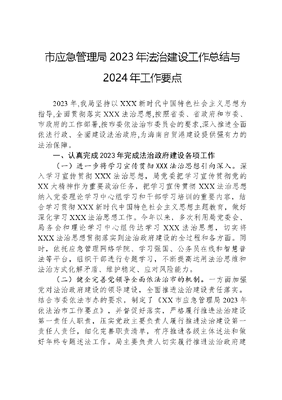 市应急管理局2023年法治建设工作总结与2024年工作要点2023年,我局坚持以XXX新时代中国特色社会主义思想为指导,全面贯彻落实XXX法治思想,按照省委、省政府和市委、市政府的工作部署,按市委依法治市委员会的要求,深入推进全面依法行政、全面建设法治政府,为海南自贸港建设提供强有力的法治保障。一、认真完成2023年完成法治政府建设各项工作(一)进一步将学习宣传贯彻XXX法治思想引向深入。深入学习宣传贯彻XXX法治思想,局党委把学习宣传贯彻党的XX大精神作为重要政治任务,把学习宣传贯彻XXX法治思想纳入党委理论学习中心组学习和干部学习培训的重要内容,结合学习贯彻XXX新时代中国特色社会主义思想主题教育,做好深化学习XXX法治思想工作。今年以来,多次利用局党委会、局务会和理论学习中心组传达学习XXX法治思想,切实将XXX法治思想贯彻落实到法治政府建设的全过程和各方面。同时,依托应急管理网络学院、学习强国、公务员在线和智慧普法等平台,组织干部进行专题学习,不断提高运用法治思维和法治方式化解矛盾、维护稳定、应对风险能力。(二)健全完善党领导全面依法治市的机制。一方面加强党对法治政府建设的领导建设,全面推进法治建设责任落实。结合市委依法市办的要求,制定了《XX市应急管理局2023年依法治市工作要点》,并督促好落实,严格履行推进法治建设第一责任人职责,压实党政主要负责人履行推进法治建设第一责任人责任,细化完善职责清单,有序推进各级主体述法和做好年终专题述法工作。局主要负责人切实履行推进法治政府建设第一责任人职责,每月召开月度工作调度会研究推进法治政府建设工作要点事项。截至目前,市政府2023年法治政府建设工作要点我局牵头的2个事项已按时间节点推进和积极推进《法治XX建设规划(2021-2025年)》《XX市法治政府建设实施方案(2021-2025年)》《XX市法治社会建设实施方案(2021-2025年)》任务落地落实,认真做好一规划两方案中期评估现场督察检查工作。另一方面加强理论研究和舆论宣传方面。我局充分运用新闻媒体和政府网站、微信公众号等宣传媒介,广泛宣传我局在法治政府建设工作中的先进经验和典型做法,同时,每年都将局法治政府工作报告在网上公布,充分发挥全国法治政府建设示范市的引领示范带动作用,积极传播高质量高标准建设海南自由贸易港的省会担当的时代强音,营造全社会关心、支持和参与法治政府建设的浓厚氛围,进一步提高了广大干部群众的法制观念。(三)不断提升立法工作质效。完善立法机制加强重点领域立法。围绕XX市高质量发展需求,坚持问题导向、效果导向,把有限的立法资源用在解决突出问题上,增强立法的针对性、适用性、可操作性,制定出台短条例。配合做好市人大常委会、市政府年度立法计划编制工作,加强市区立法联动,健全对话榕树下民主立法工作机制,深入开展制度廉洁性评估试点工作,持续深入开展立法后评估工作,今年我局无立法任务,配合相关部门立法征求意见47件,加大规范性文件审查纠正力度,提升规范性文件备案审查工作实效,根据工作需要,为了做好我市安全生产工作,充分发挥社会监督作用,目前,正在完善《XX市安全生产举报奖励实施办法》相关工作。(四)持续提高营商环境法治化水平。为建设好海南自由贸易港,发挥XX的引领作用,落实好《XX市营商环境提升行动方案(2020-2025年)》工作,提升我局营商环境建设质量。一是强化XX市优化营商环境工作专班作用。开展高质量建市的提升行动,优化营商环境问题处置机制,深入推进涉案企业合规改革,持续强化对监管行业市场主体的平等保护。二是推进社会诚信建设。落实好信用分级分类监管制度,全面实施审管法信一体联动机制,推进审批、监管、信用数据共享和业务协同,实现重点行业领域信用监管全覆盖,探索实施政务失信赔偿机制。三是做好公平竞争政策实施工作。深入推进公平竞争政策实施,强化公平竞争刚性约束,认真落实好公平竞争审查制度,积极开展有妨碍公平竞争清理工作,今年我局开展对合同、公告等进行公平竞争审查26次,有效地保护应急管理监管的市场主体合法权益,加强重点行业领域的反垄断监管工作。(五)加快推进法治政府建设。一是严格依法全面履行政府职能。全面落实应急管理权责清单制度和动态调整,认真履好我局的监管职责工作。二是加强局法律顾问队伍规范化建设,进一步做好法律顾问等参与局重大行政决策、规范性文件等合法性审查工作,落实政府令第114号要求,继续做好规范性文件的动态管理工作,(截止11月20日)对我局的文件、规章制度、合同、公告等文件进行合法性审查746份,出具法核意见155份,正在修改完善1份规范性文件,高质量做好局涉法事务合法性审核工作,把握好局重大事项决策合法性审查关,为局里各种工作依法有序开展提供法律保障。制定局重大行政决策(今年我局无