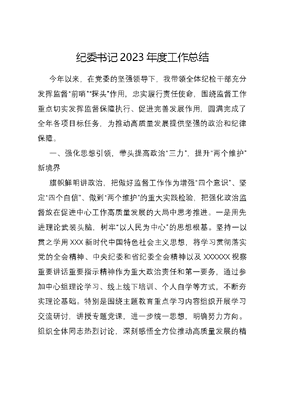 纪委书记2023年度工作总结今年以来,在党委的坚强领导下,我带领全体纪检干部充分发挥监督前哨探头作用,忠实履行责任使命,围绕监督工作重点切实发挥监督保障执行、促进完善发展作用,圆满完成了全年各项目标任务,为推动高质量发展提供坚强的政治和纪律保障。一、强化思想引领,带头提高政治三力,提升两个维护新境界旗帜鲜明讲政治,把做好监督工作作为增强四个意识、坚定四个自信、做到两个维护的重大实践检验,把强化政治监督放在促进中心工作高质量发展的大局中思考推进。一是用先进理论武装头脑,树牢以人民为中心的思想根基。坚持一以贯之学用XXX新时代中国特色社会主义思想,将学习贯彻落实党的全会精神、中央纪委和省纪委全会精神以及XXXXXX视察重要讲话重要指示精神作为重大政治责任和第一要务,通过参加中心组理论学习、线上线下培训、个人自学等方式,不断夯实理论基础。特别是围绕主题教育重点学习内容组织开展学习交流研讨,讲授专题党课,进一步统一思想,明确努力方向。组织全体同志热烈讨论,深刻感悟全方位推动高质量发展的精髓要义,使XX大精神落地生根,形成生动实践。坚决贯彻总体国家安全观,严格落实《党委(党组)国家安全责任制规定》,坚持不懈学懂弄通做实,使全组同志政治三力不断提高,践行XXX新时代中国特色社会主义思想更加自觉。二是认真履行支部书记抓党建主体责任,推进支部标准化规范化建设。我坚持支部三会一课制度,以普通党员身份参加组织生活。严格落实意识形态责任制,按季度分析研判每一位党员思想动态,坚持鲜明地舆论导向。认真学习《实施条例》等法律法规,提升依法监督能力,依规依纪依法安全文明办案。给全体干部讲授七一党课。全年共组织支部党员专题学习共*次,研讨交流*次,开展主题党日活动*次、专题组织生活会*次。积极开展我为群众办实事活动,带队赴直属单位调研督导*次,为群众解决急难愁盼问题*件。多种形式推动主题教育入脑入心,推动主题教育成果巩固深化。二、聚焦主责主业,推动工作走向严细深实,增强三不一体新效能(一)深化政治监督,坚持党中央重大决策部署到哪里,政治监督就跟进到哪里今年以来,我紧紧围绕贯彻落实XXXXXX重要论述、党中央和省委重大决策部署、部门落实全面从严治党主体责任、主题教育、巡视整改等重点工作,组织开展政治监督专项检查,以强有力的监督保障各项决策部署落实落地。对政治监督台账所列*项重点工作、*项具体内容定人、定期、定效对账跟踪。一是督促厅党委切实增强落实主体责任的政治自觉、思想自觉和行动自觉。今年共*次召集有关牵头室汇报听取工作进展情况,针对一些市县、部门和单位认识不高、重视不够、组织不力等突出问题,明确提出了整改意见和工作建议。督促出台一批制度意见,强化制度保障,防范化解风险。二是开展谈心谈话。今年以来,我同有关部门*余人进行了提醒谈话;先后*次召开有关处室工作会议,听取工作情况,及时向党委提出工作建议*条;围绕安全责任落实、严肃工作纪律和精准执纪问责等方面开展了监督检查,引导全体党员干部在完成急难险重任务中践行两个维护,深入一线、靠前监督,开通了24小时热线联系电话。(二)强化日常监督,确保政治生态风清气正今年以来,我主动深入实地调研,开展靠前监督,充分发挥派驻近距离、全天候、常态化优势。一是强化对重点人、重点事的监督。认真贯彻落实《中共中央关于加强对一把手和领导班子监督的意见》,推动党委严格落实全面从严治党主体责任,对照班子及其成员全面从严治党责任清单,对执行情况逐项督促问效。在日常监督检查中,全年共主动发现问题*件,提出工作建议*份,并督促整改到位。通过会议监督,确保三重一大决策科学规范。截至12月底,全年共参加、列席党委会*次、办公会17次,对党委研究的直属事业单位机构改革、干部选拔任用、专项经费支出、年度个人有关事项报告重点查核及处理意见等重点事项认真监督,确保集体决策真正发挥作用、不走过场。二是持之以恒推进作风建设。除了把好落实中央八项规定精神的节日廉洁关口之外,我亲自带队对机关差旅费报销单据、公车管理、值班费发放等情况进行了重点抽查。三是精准把脉部门政治生态状况。开展政治生态分析研判暨政治画像工作。半年以来,围绕践行两个维护情况、落实两个责任情况、执行民主集中制情况、选人用人情况等*方面*项指标,结合日常监督检查、谈心谈话、廉政意见、档案管理等工作成果,对政治生态状况开展分析研判,总结出*方面*个问题,明确了今后工作的着力点,使政治生态分析与日常监督工作双融合、双促进、双提升。(三)扎紧织密制度的笼子,一体推进不敢腐、不能腐、不想腐今年以来,我重点围绕部门在行政审批、执法检查、项目资金使用等方面的职责权限摸排查找问题,补充、修订重点关键领域的权力运行制度