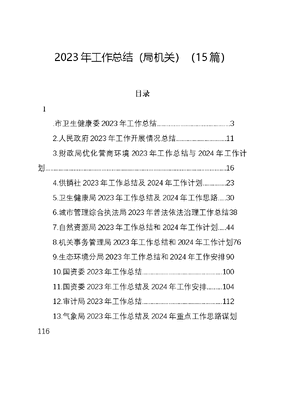 2023年工作总结(局机关)(15篇)目录1.市卫生健康委2023年工作总结..32.人民政府2023年工作开展情况总结113.财政局优化营商环境2023年工作总结与2024年工作计划.164.供销社2023年工作总结及2024年工作计划..235.卫生健康局2023年工作总结及2024年工作思路..306.城市管理综合执法局2023年普法依法治理工作总结387.自然资源局2023年工作总结和2024年工作计划..448.机关事务管理局2023年工作总结和2024年工作计划769.生态环境分局2023年工作总结和2024年工作安排9010.国资委2023年工作总结10011.国资委2023年工作总结及2024年工作安排10412.审计局2023年工作总结11213.气象局2023年工作总结及2024年重点工作思路谋划11614.自贸改革创新局2023年度工作总结及2024年工作谋划12215.应急管理局2023年工作总结和2024年工作思路132市卫生健康委2023年工作总结2023年全市卫生健康系统坚持以XXX新时代中国特色社会主义思想为指导,全面贯彻落实党的XX大精神,以人民健康为中心,以高质量发展为主线,以公共卫生安全为底线,以医药卫生体制改革为抓手,努力为人民群众提供全方位全周期的卫生健康服务,创建全国生育友好工作先进单位通过省级评审、公示,已上报国家卫生健康委,普惠托育建设工作获省政府2022年度真抓实干成效明显地区激励表彰,是xx市唯一上榜的县市区。一、高点定位,筑牢公共卫生屏障1.完善体系建设,强化应急指挥能力。先后出台《关于进一步加强县域公共卫生应急管理体系建设实施意见的通知》《关于进一步建立健全村(居)公共卫生委员会运行机制意见(试行)的通知》《xx市突发公共卫生事件应急预案(2023年版)》等,进一步健全卫生应急管理体系。积极构建平战结合、医防协同、联防联控新型工作机制,实体化运行村(居)公共卫生委员会,推动所有公立医院设置公共卫生科,与市疾控中心形成紧密有效的防治结合体系;xx市应急医院已正式开诊,配备xx排CT、呼吸机和PCR实验室等设施,有效增强突发公共卫生事件应急救治和防控能力。2.强化重点监测,提升传染性疾病防治水平。高标准推进血吸虫病、艾滋病、结核病、病毒性肝炎等传染病防治工作,各项指标均能达标。扩大医疗机构及羁押人群检测、老年人体检HIV抗体范围,初筛发现抗体阳性xx例,确证阳性xx例,成功转介治疗xx例。常态化开展新冠病毒感染、流感样病例和肺炎支原体监测,对就诊人次显著增加的时段,增配备门急诊诊室、导医及安保人员,确保就诊运行安全有序。3.推进国家试点,优化慢病防控管理能力。巩固慢性病综合防控示范区建设成果,国家慢性病患者健康管理服务标准化试点项目成功入选国家标准化委员会第九批社会管理和公共服务综合标准化试点项目,xx月xx日接受了国家卫生健康委现场调研;肿瘤登记工作连续获国家癌症中心优秀奖并首次入选世界卫生组织癌症研究机构(IARC)《五大洲癌症发病》数据库。高质量完成国家第九期、第十期心血管病高危人群早期筛查和综合干预项目。二、持续发力,深化医药卫生体制改革1.医疗卫生改革纵深推进。印发《关于调整xx市深化医改暨省级综合医改试点工作领导小组成员的通知》等文件,推动形成科学有序、分层分级的医疗体系和系统连续的诊疗格局。市人民医院、中医院深入推进江苏省公立医院高质量试点单位建设,积极参与医药卫生体制改革,在紧密型医共体的基础上,成立两家医疗健康集团,帮助基层医院解决发展过程中遇到的难题。不断加强人才队伍建设,评选xx名医培养对象xx名、中青年卫生健康骨干人才培养对象xx名;推选省优秀基层卫生骨干人才xx名、市基层卫生骨干人才xx名。探索高层次和紧缺岗位人才一次公告常年招聘模式,赴xx医科大学、xx大学医学院等院校开展校园招聘,xxxx年招录事业人员xxx名,其中研究生xx人。2.诊疗服务体系日趋完善。着力提升城乡医疗资源配置和服务均衡性,已初步建成x家市级公立医院、xx家区镇(