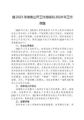 镇2023年政务公开工作总结和2024年工作思路2023年以来,XX镇认真贯彻落实《中华人民共和国政府信息公开条例》文件精神,严格按照上级文件要求,加强组织领导,完善工作机制,扎实推进政务公开工作,较好地完成了政务公开各项工作,现将2023年的工作情况和2024年的工作思路报告如下:一、主动公开情况2023年1月1日起至今,政府信息公开网站共更新主动公开政务信息27条。针对公众关切的问题,及时、主动、全面、准确地发布权威政府信息进行回应,增进公众对我镇工作的了解和理解,及时公开需要社会公众广泛知晓的信息,并通过和谐新XX微信公众号和宣传栏的形式向社会公开。同时,全面规范网站内容发布管理,整体工作由办公室主任负责分管,3名具体经办人员具体抓落实,全镇各相关科室负责提供相关信息和落实相关领域的依申请公开工作。时刻把关政府信息公开网站无效链接、错别字等情况,对存在严重错误的情况,进行及时通报,杜绝出现死链错链错字,确保信息的准确。另外,严格按照上级要求,对政务新媒体宠聚XX微信公众号进行运营。二、依申请公开情况由镇综合办设置专人负责依申请公开的受理、登记、审核办理、归档等环节,确保各个申请公开合理合规按期答复2023年1月份至今,XX镇共受理政府信息公开申请件3件,已全部办结;被提起复议政府信息公开案件0件。三、监督保障安排专职工作人员持续加强监督管理,实现常态长效。积极配合不定期巡检网站、季度检查和年终考核工作,认真对照测评进行问题查摆和整改。同时参考县政府政务公开科,将办公室信息公开落实情况和各科室配合情况列入考核范围,在年终开展考评,并进一步明确具体的考核细则,确保各项工作落到实处。四、工作中存在的困难和问题一是政策公开时效性需要增强,对于省市县下发应主动公开的信息还没有做到第一时间在网站上进行公开;二是政务公开网站的宣传力度需要加强,部分群众对该网站的认知度还不够高,大部分基层群众还不了解有关公开信息的查询途径;三是信息公开队伍建设需要加强,部分科室没有专门负责政务公开的工作人员,且人员变动频率高,常常导致工作脱节,无法及时完成工作任务。五、2023年工作思路一是强化工作督查。制定XX镇信息公开考核办法,建立完善的信息发布流程,进一步明确谁发布,谁负责原则,同时将信息公开纠错结果纳入年度考核,确保信息公开准确、严谨。二是加强工作指导,严格按照政府信息公开相关文件要求加强工作指导推进工作落实,做到信息公开数量充足,栏目齐全,更新及时,内容实用,切实提高公开信息的质量和水平。三是加强培训交流。一方面定期组织各科室工作人员加强对于政务公开工作有关要求和流程的培训学习,规范主动公开、依申请公开的工作程序,提升工作人员对政务公开有关细则和政策的把握能力,提高业务水平。