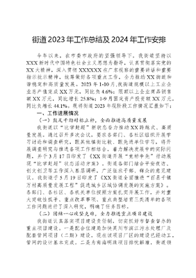 街道2023年工作总结及2024年工作安排今年以来,在市委市政府的坚强领导下,我街道坚持以XXX新时代中国特色社会主义思想为指导,认真贯彻落实党的XX大精神,深入贯彻XXXXXX在广东视察的重要讲话和重要指示批示精神,统筹做好各项重点工作,全力推动XX街道和谐稳定和高质量发展。2023年1-10月,我街道规模以上工业企业总产值完成XX万元,同比负4.6%;限额以上企业商品销售额XX万元,同比增长25.8%;1-9月固定资产投资额XX万元,同比负增长44.1%。现将街道2023年现阶段工作情况汇报如下:一、工作进展情况(一)鼓足干劲对标立杆,全面推进高质量发展我街道以比学赶超新状态奋力推动XX跨越式、高质量发展。通过召开多次会议,要求各部门、各社区组织开展学习讨论和调查研究,跟其他镇街比较、跟先进单位学习,将开展调查研究与推进各项工作相结合,着力解决发展中的实际问题,并于3月17日印发了《XX街道开展竞标争先行动展现比学赶超状态活动方案》。街道各部门结合平安夜访、创文创卫等工作深入基层调研,广泛征求干部、群众的意见建议。我街道于5月19日印发了《XX街道全面推进百县千镇万村高质量发展工程促进城乡区域协调发展的实施方案》。各部门、各社区、各机关单位按照方案扎实开展工作,并对重大突破性抓手、重点改革事项、重点典型培育三类清单的各项工作问题进行了深入研究,明确了任务目标。(二)团结一心攻坚克难,全力推进重点项目建设我街道认真落实项目建设责任制,切实抓好市督查督办的重点项目建设。一是配合住建局加快吴川市滨江污水处理厂及配套管网项目(二期)建设,现在该项目厂区的建设已经动工,管网的设计基本完成。二是为南海明珠项目排忧解难,街道领导带队多次到雅居乐明珠湾进行调研,汇总企业反馈的问题,积极向上级进行反馈,帮助企业解决难题,助力企业发展,现在雅居乐(二期)建设已经顺利启动。三是提前做好吴川市XX街道乡村振兴示范带基础设施建设项目、吴川市XX街道农田引调水基础设施建设项目的前期工作,计划争取利用债券资金,结合街道的区位优势和自然资源,继续培育打造新项目。四是扎实推进重点项目征地工作。吴川市公安局第一看守所约30.08亩土地用于监区扩建征地工作已完成;广湛高铁塔基征地项目涉及三条村庄8座塔基的征地工作已顺利完成;按时完成了吴川市羽绒产业基地(二期)项目的第一批200亩征地任务,第二批300亩征地已成立工作专班,责任到人,房屋拆迁正在有序推进;位于河东社区那贞村的吴川市保障性住房建设项目正在进行土地清表工作,我街道着力保障项目顺利动工建设。(三)加大专项整治力度,着力企业转型发展我街道着力于提高街道营商环境水平,优化产业结构、推动企业转型升级,引进新的经济增长亮点。一是深化安全生产专项整治。每月定期召开安全生产工作例会,深入企业开展安全生产大排查、隐患大整治专项行动。今年以来,共检查各类型企业共331家,合计463家次,出动检查人员共1911人次,督促整改隐患61项。加强街道主要路段安全隐患排查整治,有效保障人民群众生命财产安全。二是切实推进行政执法工作。坚决打击辖区内的违法用地行为,2023年1-10月份卫片执法新增非农违法用地总面积7.86亩,已完成58.27%。对2013-2017年打击毁林专项行动相关违法主体完成处罚共26宗,已全部完成整改,整改率100%。建立健全行政执法公示信息制度,今年以来的30宗行政处罚案卷均在广东省行政执法信息公示平台公示,及时率100%。三是切实抓好环境污染整治。加强对辖区内废旧塑料加工企业的巡查,确保两断三清。今年以来,共关闭废旧塑料加工企业和散乱污企业54间,投入整治资金10万多元,下乡执法共60多次,清理厂内产品、原材料等约270吨,坚决杜绝辖区内废塑料加工厂的死灰复燃,促进企业逐步向绿色环保转型。四是加大招商引资力度。精准谋划招商选资,组织到各地特色品牌企业开展考察,分别到广州江丰实业股份有限公司卓味家禽加工厂、广西新粤西楼食品有限公司进行实地调研。持续改善营商环境,深入开展暖企行动,各社区挂点干部坚持问题导向,主动问需于企、问计于企,截至目前共走访企业266次,共收集问题93项,已办结问题93项,办结率100%。五是引导企业申报高新企业和开展产业升级改造。我街道联合科工贸局主动上门给企业进行政策解读,分析企业的现状,引导企业申报高新企业,2023年吴川双胞胎弘昇饲料有限公司已完成企业数字化管理升级,大大提高了企业的生产和管理效率。同时,积极开展四上企业申报入库工作,本年完成了一间限额以上批发企业(裕丰达贸易有限公司)的入库申请。(四)扎实推动基建提档,助力建设美丽乡村我街道以百千万工程为抓手,立足沿海经济带、重点项目开发和道路交通的优势,实现强产业、美环境、优设施。一是撂荒耕地复耕