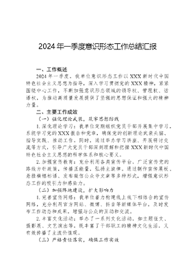 2024年一季度意识形态工作总结汇报一、工作概述2024年一季度,我单位意识形态工作以XXX新时代中国特色社会主义思想为指导,深入学习贯彻党的XXX精神,紧紧围绕中心工作,不断加强意识形态领域的领导权、管理权、话语权,为推动高质量发展提供了坚强的思想保证和强大的精神力量。二、主要工作成效(一)强化理论武装,筑牢思想防线1.深化理论学习:我单位定期组织党员干部开展集中学习,系统学习党的XXX报告和党章,确保党的创新理论武装头脑、指导实践、推动工作。同时,通过举办学习讲座、开展研讨交流等方式,引导广大党员干部深刻理解和把握XXX新时代中国特色社会主义思想的科学体系和核心要义。2.加强宣传教育:充分利用各类宣传平台,广泛宣传党的路线方针政策,传播正能量,弘扬主旋律。通过制作宣传展板、悬挂横幅标语、发布微信公众号文章等多种形式,增强意识形态工作的吸引力和感染力。(二)加强阵地建设,扩大影响力1.完善宣传网络:我单位着力构建线上线下相结合的宣传网络,充分利用官方网站、微博、抖音等新媒体平台,及时发布工作动态和成果,增强与公众的互动和交流。2.丰富文化活动:举办了一系列文化活动,如主题征文、摄影展、文艺演出等,既丰富了干部职工的精神文化生活,又有效传播了主流价值观。(三)严格责任落实,确保工作实效1.明确责任分工:我单位成立了意识形态工作领导小组,明确了各部门在意识形态工作中的职责和任务,确保工作有人抓、有人管、有人负责。2.加强监督检查:定期对意识形态工作进行督查检查,对发现的问题及时整改,确保意识形态工作各项任务落到实处。三、存在问题与不足尽管我单位在意识形态工作中取得了一定成效,但也存在一些问题和不足。(一)理论学习的深度和广度还需加强部分党员干部对党的创新理论理解不够深入,运用理论指导实践的能力有待提高。同时,理论学习的形式和内容还需进一步丰富和创新,以更好地满足干部职工的学习需求。(二)宣传教育的针对性和实效性有待提升在宣传教育方面,还存在一些内容与群众需求脱节、形式单一等问题,导致宣传教育的针对性和实效性不强。此外,新媒体平台的运用还不够充分,宣传教育的覆盖面和影响力有待进一步扩大。(三)阵地建设和管理水平需进一步提高虽然我单位在阵地建设方面取得了一定进展,但部分阵地设施还不够完善,管理水平有待提高。同时,对新兴媒体平台的监管和引导还需加强,以防范和抵御不良信息的侵蚀。四、下一步工作计划针对存在的问题和不足,我单位将制定以下工作计划,以推动意识形态工作再上新台阶。(一)深化理论武装,提升思想引领力1.加强学习培训:定期组织党员干部开展专题学习培训,邀请专家学者进行辅导讲座,提高党员干部的理论素养和思想觉悟。2.创新学习方式:探索运用互动式、体验式等新型学习方式,增强学习的吸引力和实效性。同时,利用新媒体平台开展文可居文库——海量学习资料,手机电脑均可下载www.wenkeju.com线上学习,方便干部职工随时随地进行学习。(二)强化宣传教育,扩大社会影响力1.丰富宣传内容:结合时事热点和中心工作,制定宣传计划,确保宣传内容贴近实际、贴近生活、贴近群众。2.创新宣传形式:运用短视频、直播等新兴媒体形式,增强宣传的生动性和互动性。同时,加强与主流媒体的合作,扩大宣传的覆盖面和影响力。(三)加强阵地建设,提高管理水平1.完善阵地设施:投入资金对阵地设施进行升级改造,提升阵地的硬件条件。同时,加强阵地日常管理,确保设施的正常运行和使用。2.强化监管引导:加强对新兴媒体平台的监管和引导,建立健全信息审核和发布机制,防范和抵御不良信息的侵蚀。同时,积极推广优秀网络文化产品,营造清朗的网络空间。(四)落实责任担当,确保工作实效1.明确责任分工:进一步细化意识形态工作责任分工,确保每项工作都有专人负责、有具体措施、有明确要求。2.加强监督检查:建立健全意识形态工作考核评价机制,定期对各项工作进行督查检查,对发现的问题及时整改落实。同时,加强与其他单位的沟通协作,共同推动意识形态工作取得新成效。五、结语意识形态工作是党的一项极端重要的工作,关乎旗帜、关乎道路、关乎国家政治安全。我单位将坚持以XXX新时代中国特色社会主义思想为指导,不断加强和改进意识形态工作,为推动高质量发展提供坚强思想保证和强大精神力量。同时,我们也清醒认识到意识形态工作面临的严峻形势和复杂任务,将始终保持高度警觉和清醒头脑,以更加扎实有效的措施推动意识形态工作不断取得新进展、新成效。文可居文库——海量学习资料,手机电脑均可下载www.wenkeju.com