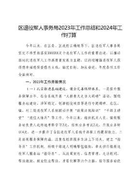 区退役军人事务局2023年工作总结和2024年工作打算今年以来,在区委、区政府正确领导下,区退役军人事务局坚定不移贯彻落实XXXXXX关于退役军人工作的重要论述,以推动新时代退役军人工作高质量发展为主题,以持续增强退役军人获得感幸福感荣誉感为主线,锚定目标、加压奋进,年度各项工作全面向好。一、2023年工作开展情况(一)扎实推进基础建设,健全完善保障体系。一是提升服务保障水平。在全系统开展大排查大走访大调研活动,围绕服务站建设、涉军稳定、创新创优项目等进行专题调研。在区、镇、村三级退役军人系统联动开展政策法规培训干部上讲堂岗位大练兵等工作。今年以来,组织机关人员、镇街服务站负责人赴外地考察学习2次,组织业务考试2次,开展业务培训4次,进一步提升了全区退役军人系统干部职工的履职能力。二是拓展服务保障内涵。注重在创新服务方法上下功夫。建立指导员工作机制。科级干部逐人明确帮包镇街,牵头担任镇街退役军人服务站指导员,从政策宣传、信息管理、走访慰问、帮扶救助、就业创业帮扶、矛盾化解等六个方面,指导服务站优质高效开展工作。探索建设拓展型服务站。与辖区红色物业建设相结合,在XXXX12处小区,设立了退役军人联络点,延伸了服务触角。三是用心开展志愿服务。建立以镇街、村居服务站为主力以拥军企业、军创企业为补充的退役军人志愿服务体系,组建志愿队114支,招募志愿者1110名。持续开展XXXX志愿服务系列活动,围绕关爱帮扶、年节走访等方面开展形式多样的志愿服务160余次,持续擦亮XXXX名片。(二)提高安置就业质量,倾心服务就业创业。一是倾力提升安置质量。深入推进阳光安置一站式服务。今年以来已接收转业军官X人,政府安排工作退役士兵XX人,自主就业退役士兵XXX人。积极对接组织、编办、人社、国资等单位,统筹安排科学编制岗位计划,共提供优质岗位XX个。今年XX名军转干部分别安置到XXX,1名随军家属到XXXX,XX名政府安排工作退役士兵分别安置到市、区两级事业单位,事业编安置比例达到XXX%,其余全部安置到国有企业。二是高效服务教育培训。先后组织XXX人次退役军人参加线上+线下适应性培训,内容涵盖思想政治教育、心理调适、职业规划等,为退役军人做好角色转变提供心理指导和知识技能储备。与XX家培训机构签订协议,面向退役士兵开设无人机操作、电子商务等XX个专业的培训班,总计有XXX名退役士兵完成培训。对XX名有专升本和考研意愿的退役士兵,集中开展免费专业咨询和考前辅导,帮助提升学历。三是扎实推进就业创业。开发退役士兵专项公益性岗位XXX个,兜底保障XXX名退役士兵就业。举办军岗日等专场招聘会3次,提供就业岗位XXX余个,完成就业推荐XXX余人次。组织6家军创企业参加省内军创企业展交推介会,承办了全市退役军人创业培训高端班,第三届XXX退役军人创业创新大赛。创新打造XXX制度,聘请XXX结对军创企业,助力军创企业发展。截至目前,军创企业联络员已为XXX家军创企业提供政策咨询,累计协助XXX家军创企业办理创业贷款XXX万元。(三)做优做细优抚褒扬,营造浓厚尊崇氛围。一是严格落实优抚待遇。高效推进年度确认,及时更新优抚系统信息数据,高质量做好退役军人和其他优抚对象建档立卡工作,为提高精准化保障水平奠定基础。目前,全区退役军人及其他优抚对象信息采集XXX人,审核发放优待证XXX件。及时、足额发放各类优抚资金,今年以来,发放抚恤定补资金XXX万元、优抚医疗补助资金XXX万元、病故军人一次性抚恤金XXX余万元、义务兵家庭优待金XXX万元。抽调专人组建专班,对XXX名XX人员档案进行核对完善和身份认定。为伤残军人申请配制伤残器械XX人次,调整伤残等级X人次,办理新评伤残人员X人,伤残关系迁入X人,组织XX名伤残军人到省、市荣军医院短期休养,全程代办60岁老兵生活补助XX人。二是倾心服务军休干部。严格落实军休干部政治生活两个待遇,按时组织军休干部参加组织生活,及时发放军休人员生活补助费和各项补贴。与XX家签约医疗、家政公司深化合作,为居家军休干部提供集医疗、疗养、养老、护理于一体的居家健康养老服务。开展军休住房安全隐患排查整治专项行动,为58户军休住房进行彻底排查,消除安全隐患。定期组织书画会园艺展、趣味运动会等文体活动,满足军休干部精神需求。三是大力弘扬英烈精神。组织《英烈保护法》普法宣传,对安城烈士陵园、龙头惨案纪念碑亭及零散烈士墓进行整修,完善天马山英烈纪念馆布展工作。发挥中兴烈士陵园爱国主义教育基地作用,今年以来,先后接待宣传、检察、团委等单位团体XX批次、烈士家属XX批次、社会群众XXX余人次。承办全区XXX和9.30烈士公祭日公祭活动,组织退役军人代表、学生代表、人民警察代表等到中兴烈士陵园开展清明祭扫
