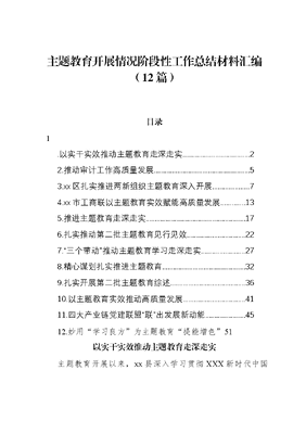主题教育开展情况阶段性工作总结材料汇编(12篇)目录1.以实干实效推动主题教育走深走实.22.推动审计工作高质量发展..53.xx区扎实推进两新组织主题教育深入开展..74.xx市工商联以主题教育实效赋能高质量发展.135.推进主题教育走深走实.176.扎实推动第二批主题教育见行见效..227.三个带动推动主题教育学习走深走实278.精心谋划扎实推进主题教育.329.扎实开展第二批主题教育综述..3610.以主题教育实效推动高质量发展.4111.四大产业链党建联盟联出发展新动能.4512.妙用学习良方为主题教育提能增色51以实干实效推动主题教育走深走实主题教育开展以来,xx县深入学习贯彻XXX新时代中国特色社会主义思想和XXXXXX视察xx重要讲话精神,引导党员干部大力弘扬焦裕禄精神,学习推广四下基层优良传统,着力将领袖嘱托转化为实干实效,推动主题教育走深走实。以学铸魂转作风。把XXXXXX视察xx重要讲话精神作为重点学习内容,列入主题教育读书班和县委理论学习中心组学习专题,组织县级领导干部带头深学细悟笃行,认真开展学习研讨,充分发挥领学带学作用。组织县委理论宣讲团深入县直单位、乡镇(街道)、村(社区)累计开展理论宣讲xx场次,各级领导干部讲授专题党课xx场次。发挥驻村第一书记带学助学作用,xxx名驻村第一书记带头受教育、协助抓教育。丰富学习形式,各级党组织书记采取送党课进基层等方式,到基层党支部开展宣讲交流xxxx多次,推动党的创新理论入脑入心。科学求实真调研。结合推动经济社会发展,组织县级领导干部认真选题,学习弘扬焦裕禄同志凡事探求就里吃别人嚼过的馍没味道的求实作风,深入开展调查研究,着力破解实际问题。根据主题教育安排,将百日住村活动延长至xxxx年x月底,要求各级领导干部结合日常工作,每周到困难多、群众意见集中、工作打不开局面的村(社区)开展x次住村调研,聚焦五星支部创建、巩固拓展脱贫攻坚成果、高标准农田建设、一村一品、洁美乡村等农村中心工作和重点任务,深入开展调查研究,了解村情民意,收集意见建议,累计帮助解决实际困难和问题xxx多个。县委把许河乡苦水区耕地靠天吃饭问题纳入重点调研课题,组织水利、自然资源等部门相关人员和省级专家团队开展联合调研,经过实地勘察、反复论证,启动实施了东部苦水区治理项目,将于xxxx年春节前完成蓄水。亲民爱民解难题。把解决群众急难愁盼问题作为主题教育推动发展和检视整改的重要内容,组织党员干部沉到一线,着力破解基层所盼、群众所急、民心所向的突出问题。用好县级领导干部开门接访制度,对群众关注度高、反映强烈的重复信访问题,由分管领导包案化解带案下访,与信访群众面对面;把主题教育意见征集纳入x+N主题党日内容,组织全县xxx个机关党支部党员到结对村,与村两委干部、群众面对面研究解决实际问题;广泛开展万人助万企•企业大走访活动,xxx名企业首席服务官直奔工厂,与服务企业面对面破解难题。目前,各机关党支部下基层现场征集意见xxx余次,累计梳理问题建议xxxx余条;实现对xxx家重点企业走访全覆盖,现场接访手续办理、融资贷款、政策落实、用工服务等问题诉求xxx余件,让群众真切感受到了主题教育带来的新变化、新气象。迎难而上抓攻坚。聚焦高质量发展首要目标,紧抓将xx纳入郑开同城化进程的发展机遇,开展百日攻坚,组建由县领导牵头的城建、工业、民生等x个队,深入现场、倒排工期、一线作战,加快推进xx等xx个重点项目;实施围挡拆除、百巷治理、交通治理等xx个城乡治理专项行动;开展水系连通和坑塘治理、廊道修补和村庄绿化、弱电治理和飞线整治x个宜居乡村建设行动,着力让县域产业体系强起来、发展动能活起来、城乡发展融起来,使全县经济社会发展呈现稳中有进、进中提质的良好态势。推动审计工作高质量发展主题教育开展以来,市审计局紧紧围绕