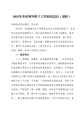 2023年乡镇领导班子工作情况总结(述职)考核组的各位领导、同志们:2023年,在XXX新时代中国特色社会主义思想的指导下,在县委县政府的坚强领导下,XX乡团结带领全乡各族干部群众,坚决贯彻落实党中央和省委、市委、县委各项决策部署,凝心聚力、真抓实干,奋勇争先、攻坚克难,统筹抓好经济社会发展各项工作,保持了经济稳定发展、人民安居乐业、社会和谐稳定的良好态势,现将一年来工作情况汇报如下。一、履职情况(一)学理论、助提升,政治建设常抓不懈。一是坚持把政治建设摆在首位。扛牢党的政治建设主体责任,坚持把政治标准和政治要求贯穿全乡各级党组织思想建设、组织建设、作风建设纪律建设以及制度建设始终,自觉在思想上、政治上、行动上同以XXX同志为核心的党中央保持高度一致,推动全乡各项工作在正确的方向上不走样、不走偏。二是持续深化理论武装。把深入学习贯彻党的XX大精神与学习贯彻XXXXXX考察云南重要讲话精神结合起来,严格落实第一议题制度,全年召开党委理论中心组集中学习XX次,周一集中学习会XX次,做到学思用贯通、知信行统一,着力推动各项重点任务落地见效,不折不扣把党中央、省市县委决策部署落到实处,为推动XX高质量发展提供坚强的思想保障。三是意识形态阵地更加巩固。认真落实意识形态工作责任制,始终把加强意识形态工作作为重大政治责任,纳入重要议事日程,纳入党建工作责任制,纳入领导班子和领导干部目标管理持正面宣传引导,积极围绕乡党委政府中心工作、重点工作开展新闻宣传报道,讲好XX故事,传递好XX声音。截至目前,共投送宣传信息、经验材料等100余篇,开展各类教育学习宣讲100余场次,利用XXXXX公众号全年累计发布各类信息XX期XX条,牢牢掌握意识形态工作主导权。(二)抓党建、强基础,党的建设持续加强。一是基层党建质量明显提升。班子成员认真履行一岗双责,选派二、三级党建指导员,不断压实抓党建工作责任。制定XX乡基层党建考核方案元,以奖代补推动基层党建提质增效。严把党员入口关,全年吸纳积极分子XX人、新发展党员XX人、转正党员xx人。持续抓好软弱涣散基层党组织及后进党支部的整顿提升,指导村级制定整改方案,并督促其严格落实四个一整顿措施,已完成1个软弱涣散党总支和13个后进支部的整顿。扎实推进主题教育,以支部为单位开展形式多样的学习和活动,推动XXX新时代中国特色社会主义思想学习走深走实。二是基层基础更加夯实。举办万名党员进党校培训班2期培训党员640余人、举办党务干部专题培训班1期,培训25人;举办乡村振兴主题培训班1期,培训村两委70人。坚持把基层党建工作与网格化管理结合起来,有效形成了党委统揽、问题联治、工作联动、平安联创的良好局面。在温泉新村搬迁点打造基层社会治理示范点,通过推进自治、法治、德治相结合,进而形成融合式共治,奏响乡村治理和谐音。引导基层党组织和党员在耕地流出整治、防汛救灾乡村振兴等急难险重工作中冲在前、做表率。在一村一示范创建中当先锋,党员群众累计投工投劳XX个,出资出物XX万,建成23个乡村振兴示范点,推动基层党建全面提质增效。在党员联系服务群众工作中显担当,全乡XX名具有履职能力的党员联系服务群众XX户,推动我为群众办实事实践活动走深走实。村级集体经济持续增收,通过盘活三资、抱团发展,因地制宜地推进村集体经济提质增效,所有村集体经济收入能在去年基础上增幅20%以上。(三)重基础、促民生,全乡发展有力有序。一是巩固脱贫攻坚衔接乡村振兴工作成效明显。严格落实四个不摘要求,加强防返贫致贫动态监测和帮扶,坚决守住不发生规模性返贫底线。2023年以来共开展过9次防止返贫动态监测工作,新识别突发严重困难户4户21人,消除风险突发严重困难户1户2人,消除风险脱贫不稳定户6户14人,两不愁、三保障及饮水安全等民生保障普惠政策稳中向好发展。二是农业发展势头强劲。严格落实基本农田保护责任制,坚决遏制耕地非农化非粮化,完成粮食播种面积5.27万亩,完成2021—2022年耕地流出图斑整治728个,3647.94亩。全年出栏羊、生猪、肉牛4.82万只、3.71万头、0.54万头。完成两烟种植6777亩,实现产值2570.98万元特色农业发展迅猛,种植蔬菜西葫芦120余亩、贝贝瓜90余亩、蜜本南瓜270余亩,种植京都三号百香果180余亩、反季节人参果200余亩,引进外商嫁接燕窝果180亩,XX热带果蔬品牌逐步打响三是农产品加工业不断发展壮大。依托万头生猪养殖优势,建成火腿加工厂,库存火腿XX只,带动XX户群众增收,通过线上+线下的方式销往省内外全国各地,预计销售额达到100万元以上火腿品牌效应逐步凸显。依托核桃食节第一乡资源优势整合空闲资产,投资230万元建成核桃加工厂,正在积极开