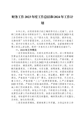 财务工作2023年度工作总结和2024年工作计划今年以来,在院领导班子的正确领导与关心支持下,在各部门的通力配合与积极协作下,财务部紧紧围绕我院2023年度工作目标和工作计划,以服务大局、防范风险、提供信息、支持决策为财务管理目标,立足本职,不断夯实会计基础工作,提升财务服务水平,优化财务管理流程,全面推进财务管理工作迈上新台阶。现将一年来有关工作开展情况总结如下:一、2023年工作情况一是坚持统筹规划,及时完成预决算工作。深入贯彻落实预算法及其实施条例等相关规定,扎实做好我院部门决算编制工作,全面核实收入、支出和结转结余等情况,严格对账,在年终结账的基础上全面完成2022年度决算编制工作并认真撰写分析报告、填报说明,按照规定时间节点及时送审上报,切实做到数据真实、计算准确、内容完整、说明清楚。根据我院实际情况,坚持将资金支出安排与我院工作计划、发展规划紧密结合,本着以收定支、量入为出、保证重点、兼顾一般的原则,严格落实过紧日子要求,坚持厉行节俭、尽力而为、量力而行,严格控制三公经费预算规模,从严从紧编制2023年预算。严格执行经批准的预算,严控部门预算年中追加,减小部门预决算差异。同时,严格落实落细各项公开要求,进一步规范公开程序,细化公开内容,不断提升公开质量,充分发挥预决算公开的积极促进作用。按要求接受预决算公开线上核查,对核查所存在的问题及时整改,确保预决算公开完整性、及时性、细化性等问题。二是坚持提质增效,提高核算工作质量。为保证财务工作的合规性,坚持以强化财务报销内控流程、提升财务服务水平为主线,按时完成财务记账、结账和账务处理工作,及时编制各项财务报表,真实地反映我院财务状况。严格按照财政部门国库集中支付的相关要求,按时按月申报用款计划,及时掌握我院资金使用情况,安排好各项经费支出,每月与财政、银行及时对账,按照支出进度合理使用资金。及时掌握各项费用的开支范围和标准,扎实做好财务报账工作,严格遵守国家财经纪律,本着客观、严谨、细致原则,按照财务报销制度和会计基础工作规范化要求进行报账,认真审核原始凭证,确保原始凭证的真实、合法、准确、完整。强化核算监督工作,积极进行内部核算和分析,及时与各部门完成对账,加强对各项业务的财务监督管理,加强可控费用的控制、执行力度,加强经济活动分析,为领导决策提供参考依据。严格按照会计档案管理规范要求,及时完成2022年度会计凭证装订,并做好会计档案的整理和归档工作。三是坚持严谨规范,切实规范采购行为。严格规范采购,自电子卖场开通以来,本年度由最初的办公用品采购到公务用车维护,办公设备、仪器设备采购,政府购买服务采购等逐步实行线上采购,进一步规范了我院政府采购限额标准以下的货物、服务和工程采购,完善了采购内控机制,为规范采购行为提供了有力支撑。配合综合管理部完成了全院办公设备采购,配合检测中心完成了2023年度检测技术升级。四是坚持建章立制,不断强化资产管理。全力做好国有资产账务管理工作,制定《国有资产管理实施办法》,坚持以资产管理精细化、数字化为导向,从源头加强国有资产管理。及时更新行政事业单位资产管理信息系统,进一步完善固定资产基础数据库,加强数据分析,为资产管理提供依据,强化资产配置与资产使用、处置的统筹管理,切实提升资产使用效益。按照上级要求及时编报2022年度行政事业性国有资产年报,对我院资产总体情况以及配置、使用、处置、收益等管理情况进行了分析和总结。坚持在货币资金的管理上,实行现金日清月结、银行存款结算准确,切实做到账账相符、账实相符,保证各项资金收付安全、准确、及时。积极做好往来账款清理工作,在往来账款管理上及时与各部门进行沟通、对账,对各项往来账款进行催缴及清理,保证我院款项的及时收回和正常运转。同时,推进对外投资转让事宜。五是坚持科学谋划,扎实做好税收筹划。充分认识税收筹划的重要意义,综合分析税法政策规定及我院经营情况,科学制定税收筹划方案,从增值税、个人所得税以及涉税风险管理等多个方面着手,推进税收筹划工作,在降低纳税成本的基础上,防范潜在的纳税风险。及时掌握国家税法新政策的出台,利用国家相关税收优惠政策,根据《财政部、税务总局关于进一步实施小微企业六税两费减免政策的公告》文件精神,积极落实六税两费减免政策,我院房产税、城建税等减赋50%,最大限度地降低了我院税负,减少了税收负担,增加了经济效益。坚持每月严格按照纳税申报时间节点,及时、准确填报税务机关要求填制的各类税务报表,及时完成各项税费申报,及时足额缴纳各类税款。积极做好汇算清缴工作,在规定的时间内向税务局报送2022年度企业所得税纳税申报表,及时完成汇算清缴,并及时跟进个税汇算清缴工作,选择合理的计税方式降低职工税负。六是坚持用心用情,做好公积金管理工作。为了保障我院职工切身利