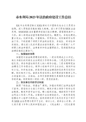 市水利局2023年法治政府建设工作总结XX市水利局坚持以XXX新时代中国特色社会主义思想为指导,深入贯彻落实党的XX大精神,深入学习贯彻XXX法治思想、XXXXXX治水重要讲话指示批示精神,紧紧围绕局中心工作,深入推进法治宣传教育的规范化、制度化、系统化建设,重点突出,创新举措,丰富载体,学用结合,切实做好学法用法工作,不断提高干部职工学法的自觉性、系统性、针对性和实效性。通过深入扎实开展法治宣传教育,进一步提高广大干部职工的法律意识、法律素养和依法履职能力。现将我局的法治建设情况汇报如下:一、加强组织领导加强党对法治政府建设的领导,一是水利局成立以书记、局长为组长的双组长法治建设工作领导小组。二是充实领导小组队伍,将各科室站所负责人纳入领导小组。三是专题研究法治建设工作专题会议,领导小组每年召开2次会议,做到年初有计划,年终有总结。四是将年度法治建设的任务进行逐项分解,制定相关计划,督促各科室站所认真开展好宣传教育工作,水政监察大队、水保站、水旱灾害防御股负责具体负责普法工作的实施。切实做到一级抓一级,层层抓落实。二、落实单位内部学法制度按照谁执法、谁普法原则,加强水利部门法律法规学习宣传。紧密结合全局工作实际,制定并建立领导干部学法用法制度,制定年度学法计划,精心组织实施,确保领导干部学法用法工作深入开展,全面提升法治建设能力。一是利用局党组理论中心组学习的机会,组织局领导班子成员及中层干部开展XXX法治思想专题学习2次、培训1次、宣讲会1次等,并认真开展《中华人民共和国宪法》、《民法典》、《优化营商环境条例》、《水法》、《水土保持法》、《防洪法》、《水利工程质量管理规定》等法律法规的专题学习,并认真做好局领导班子和各科室站所述法工作。二是利用主题党日、党员大会,开展集中学习研讨会议,对党的XX大报告、《中国共产党章程》、《反有组织犯罪法》、《抚仙湖保护条例》、《环境保护法》、《公务员考核管理规定(试行)》等党纪党规、法律条例进行学习讨论3次。三是在水利局原有水行政执法人员25人的基础上,积极组织开展执法人员学习、培训,对水政监察队伍进行指导和监督,2023年组织3人参加司法考核,水政监察大队调入2人,增加水行政执法人员5人,使我市水行政执法工作队伍得到有效扩充。四是按照政法委、依法治市办、普法强基办要求,2023年度开展网络在线学法13次,监督单位干部职工完成学法任务。五是鼓励干部职工利用业余时间自学,将各种法律法规、规章制度弄懂弄通。三、开展形式多样的水法宣传工作XX市水利局结合水利工作,紧扣宣传主题,注重实效,认真组织水法规和节约用水宣传。制定《XX市水利局2023年世界水日中国水周主题宣传活动工作方案》,成立水法宣传工作领导小组,认真开展水法规及节约用水宣传,广泛开展宣传,开展形式多样的节水宣传活动,以世界水日、中国水周为契机,2023年累计开展法治进校园、进社区、进机关、进企业宣传活动30余次。结合普法强基补短板关于谁执法谁普法的要求,到包保社区右所社区开展普法宣传相关活动10次。2023年至今,水法规宣传投入6万元,印制宣传折页5万份、制作宣传环保袋1万个、制作宣传标语条幅6条、制作水法宣传资料4000本。四、依法做好行政审批、许可等事项1.对取用地下水取水许可进行严格把控,2023年以来,我局的行政执法案件共有5件、行政许可4件,行政处罚1件。2.严格水土保持审批程序,2023年以来,我局的行政执法案件共有12件、行政许可12件,行政处罚1件。从整体情况看,今年的行政许可案卷办理规范,从实体上看,行政许可主体合法,符合《中华人民共和国行政许可法》以及相关法律法规的要求,对申请人颁发相应的许可证书、许可决定适当;从程序上看,大部分案卷许可程序完备,并在规定时间内作出行政许可决定,对许可决定进行了送达;从执法人员履职上看,在实施行政许可的过程中,认真履行了实施行政许可的职责;从卷宗材料上看,一案一卷,卷宗的相关材料基本齐全,大部分卷宗装订规范整齐,有较为规范的卷宗封面,卷内目录填写也较为规范。五、积极开展专项执法,依法打击违法行为1.加强执法队伍建设,贯彻落实最严格水资源管理制度,加强地下水取水许可、水库水资源保护的监督管理,加大日常巡查、检查力度,做好日常执法巡查、检查工作。2.加强日常监管,提升执法力度。2023年以来对取用水户、河道巡查检查次数累计40余次,劝退群众举报及检查发现私自打井11起,水政行政处罚1起;对电站开展了35次巡查检查,七座电站生态流量下泄工作正常运行,截至目前完成征收水资源费XX万元。2023全年审查审批了开发建设生产项目水土保持方案报告书及报告表13个,自主验收5个;对我市4个在建项目进行了35次水保督促检查,水保行政处罚1起。发现问题及时督促整改。截至目前收取水