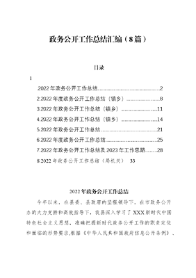 政务公开工作总结汇编(8篇)目录1.2022年政务公开工作总结22.2022年度政务公开工作总结(镇乡).83.2022年政务公开工作总结(镇乡).114.2022年政务公开工作总结(镇乡).145.2022年政务公开工作总结.216.2022年度政务公开工作总结..257.2022年政务公开工作总结及2023年工作思路.288.2022年政务公开工作总结(局机关)332022年政务公开工作总结今年以来,在县委、县政府的坚强领导下,在市政务公开办的大力支持和高效指导下,我县深入学习了XXX新时代中国特色社会主义思想,准确把握新时代政务公开工作的职责定位和面临的形势要求,根据《中华人民共和国政府信息公开条例》、《xx省2022年政务公开重点工作任务分工》和《xx市2022年政务公开重点工作任务分工》及省、市关于政务公开工作的部署,扎实推进政务公开工作,不断推进政务公开工作标准化规范化进程,全面提升我县政务公开工作质量。现将政务公开各项工作开展情况总结如下:一、工作开展情况(一)深化重点领域信息公开(1)主动公开各类规划。依托县政府信息公开平台,编制了中长期发展规划、国土空间规划、专项规划、区域规划、年度计划等目录,集中发布信息xx条,并对各类规划进行解读,充分展示一张蓝图绘到底的接续奋斗历程专题。(2)做好其他重点领域信息公开。及时公开建设高标准市场体系行动方案的落实举措和加强反不正当竞争执法信息内容,集中展示现行有效监管规则、标准。(3)抓好财政府信息公开。新建财政资金专题专栏,集成显示县直各部门预决算、三公经费、部门项目信息,按月公布县财政收支情况,全县各部门财政信息规范化标准化成效明显。通过梳理全县惠农补贴政策、将惠民政策和资金补贴信息公开列入村(居)务公开事项清单等做法,加大惠民惠农政策公开力度,进一步推动补贴信息公开向村和社区延伸。(4)常态化公开疫情防控信息。通过政府网站、政务新媒体等渠道主动及时的公开我县疫苗接种信息及最新政策举措等公众关注的问题,让公众实时了解最新疫情动态和应对处置工作进展。(二)强化政策发布解读和回应关切(1)提升政策解读质量。按照谁起草、谁解读的原则,聚焦重大政策做到政策性文件与解读关联同步,除文字、图片等常规解读方式,还通过主要负责同志解读、部门和专家解读、在线访谈等方式,充分发挥政府网站、政务微博微信等传播作用,全领域、全媒介抓好重大政策信息的解读发布工作。并按最新要求在文件解读中提供政策咨询服务,明确具体解读机关、解读人和联系方式。(2)完善政策解读方式。在县政务服务大厅设置政策咨询综合服务窗口,积极解答办事企业和群众咨询,对当场不能解答的问题建立记录反馈机制,确保群众得到准确答复;同时在大厅醒目位置安装液晶显示屏,循环播放我县惠民惠企政策以及对应的解读。(3)切实加强回应关切。一是及时交办。新建留言办理工作群,在群内及时交办督办省、市、县各级留言,并对各承办单位上报回复内容第一时间整理回复。二是压缩办理时限。要求各承办单位按照咨询类的留言在一个工作日内进行答复,投诉举报类的留言在三个工作日进行答复的规定,进一步优化留言办理工作流程,提高办理时效,在规定时限内及时办结。三是严把审核关。对各承办单位回复内容严格审核把关,对回复格式不规范、回复内容答非所问、内容过于简单不足以说明情况的,一律退回重办。(三)提升政务公开实效(1)加强政务信息管理。县司法局牵头梳理并完成规范性文件全面清理工作,按照政务信息管理要求对我县现行有效规范性文件目录,废止的规范性文件目录、失效的规范性文件目录进行及时更新。(2)全力推进基层政务公开。全面推进基层政务公开标准化规范化建设工作,一是根据省直部门指导,对安全生产、保障性住房、生态环境等xx个领域进行目录优化与调整,增强可操作性、实效性。明确各领域牵头部门,积极与上级部门对接,及时对栏目进行更新。并在县本级政务服务大厅、档案馆、图书馆建立x个政府信息公开查阅点。二是为有效传递党和国家重大政策,更好地打通政策落实最后一公里,我县高度重视政府信息公开窗口建设工作。专门成立政务公开专区建设领导小组,邀请x家第三方机构进行现场勘测,根据专区建设各项要求制定适合我县实际的